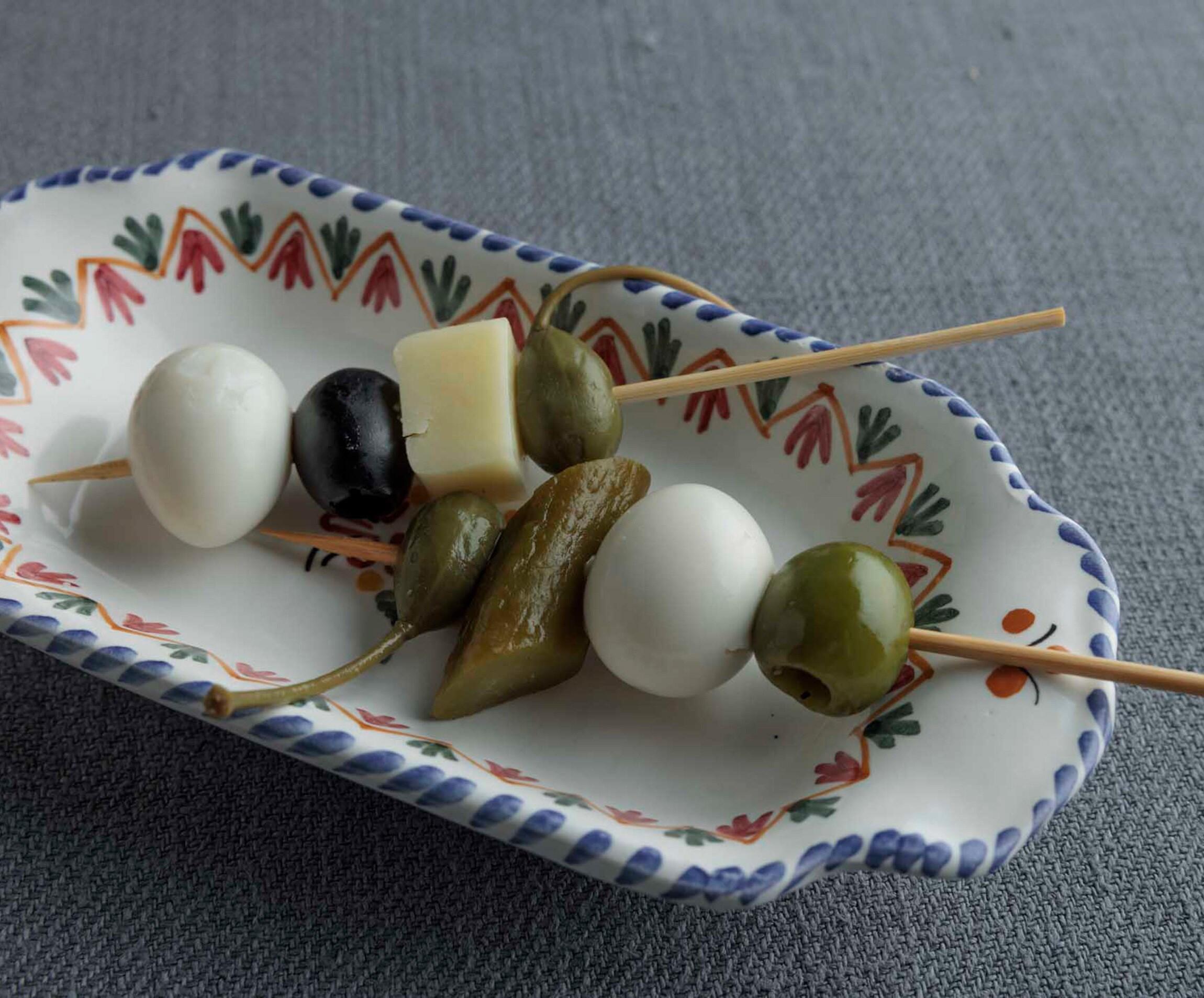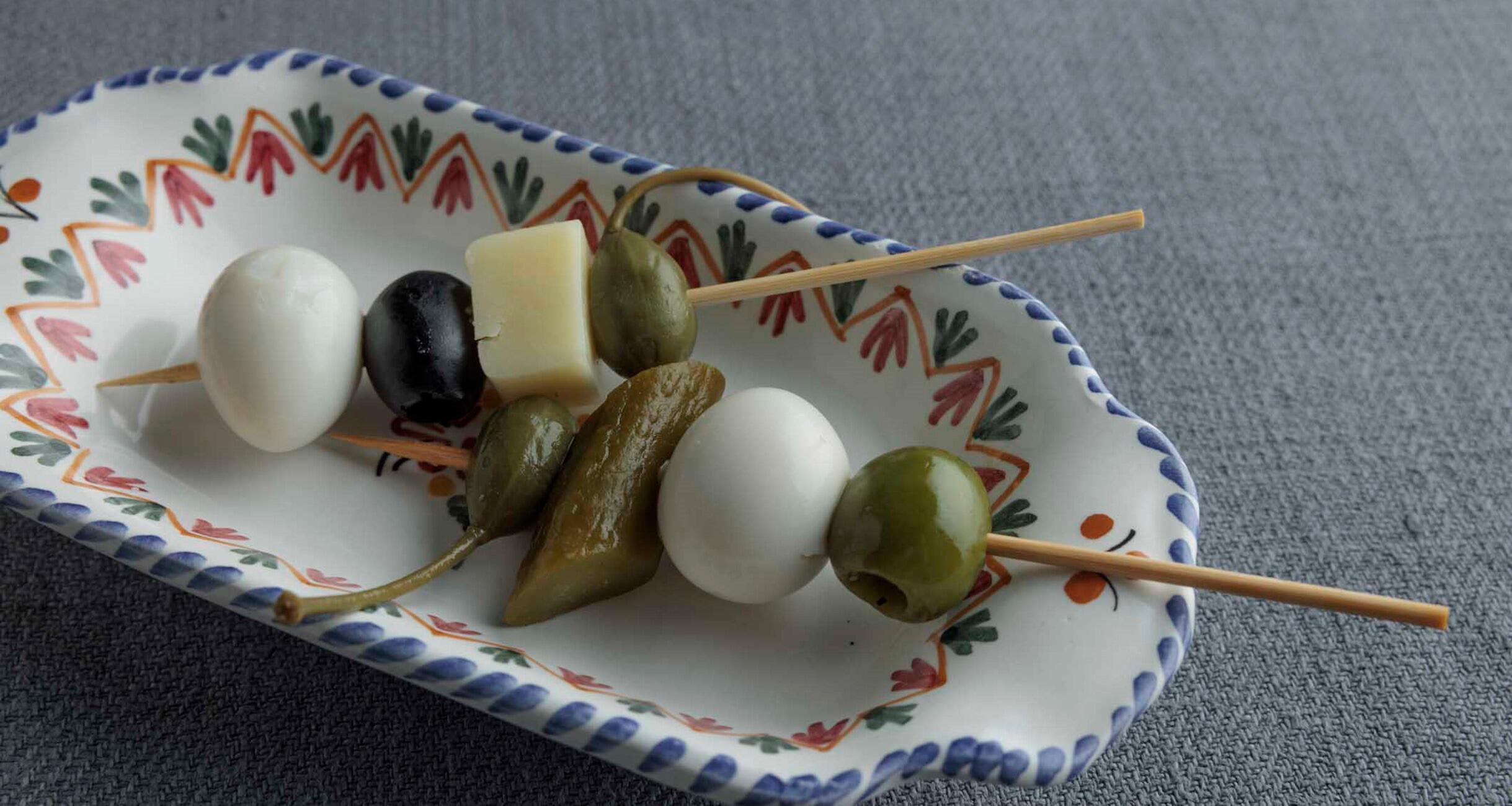 スペインバルでおなじみのピンチョス。オリーブやピクルスなど、酸味のある食材を使うときは赤ワインを合わせるのがかの地の定番。