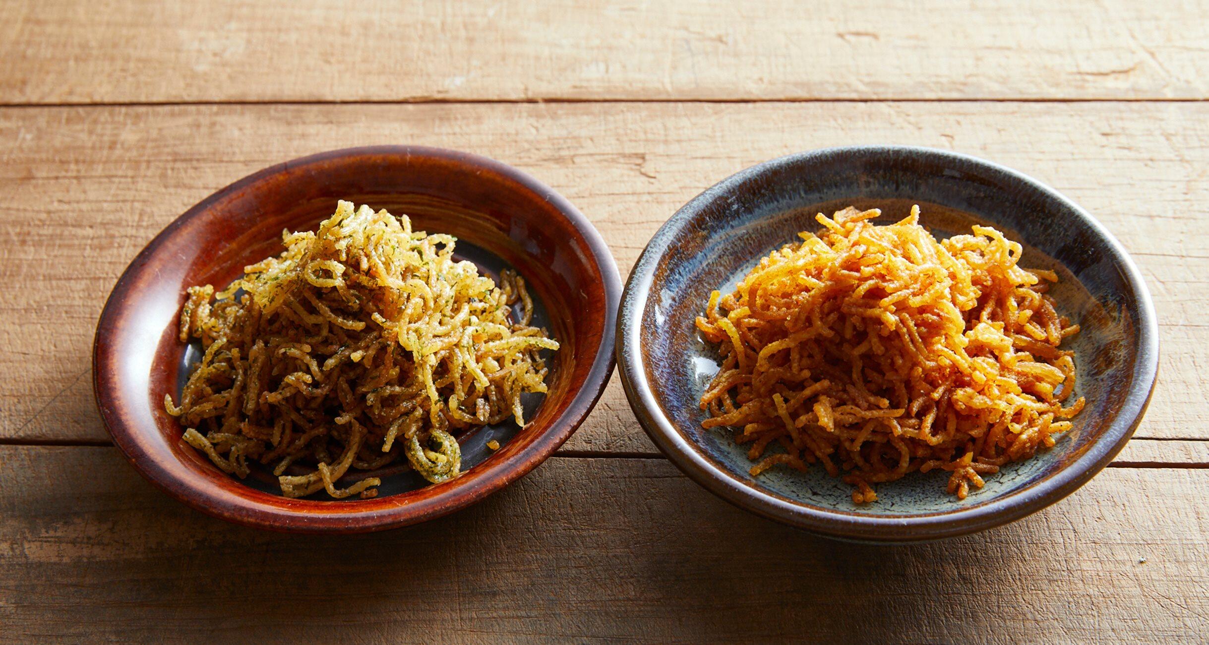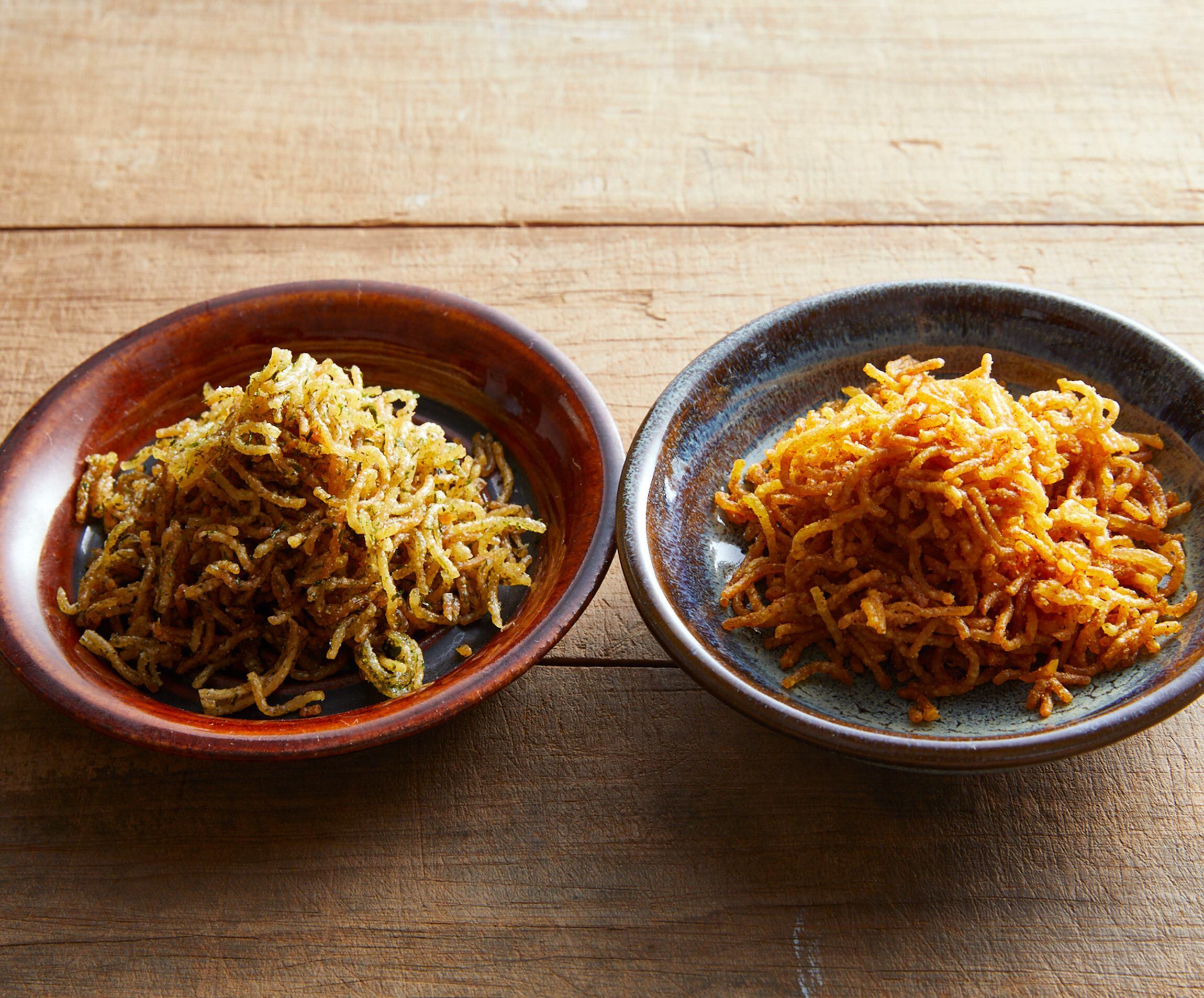 ゆっくり揚げてカリカリになった麺は密閉容器に入れて常温で数日は保存可能なので、たっぷり揚げよう。2種類あると、手が止まらない。