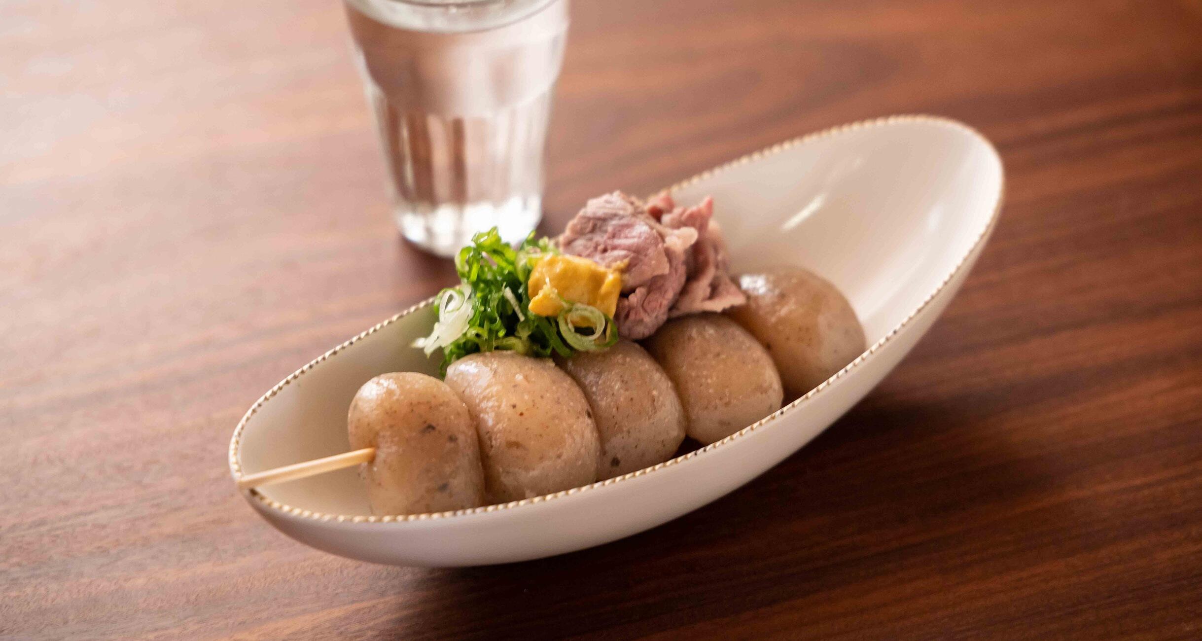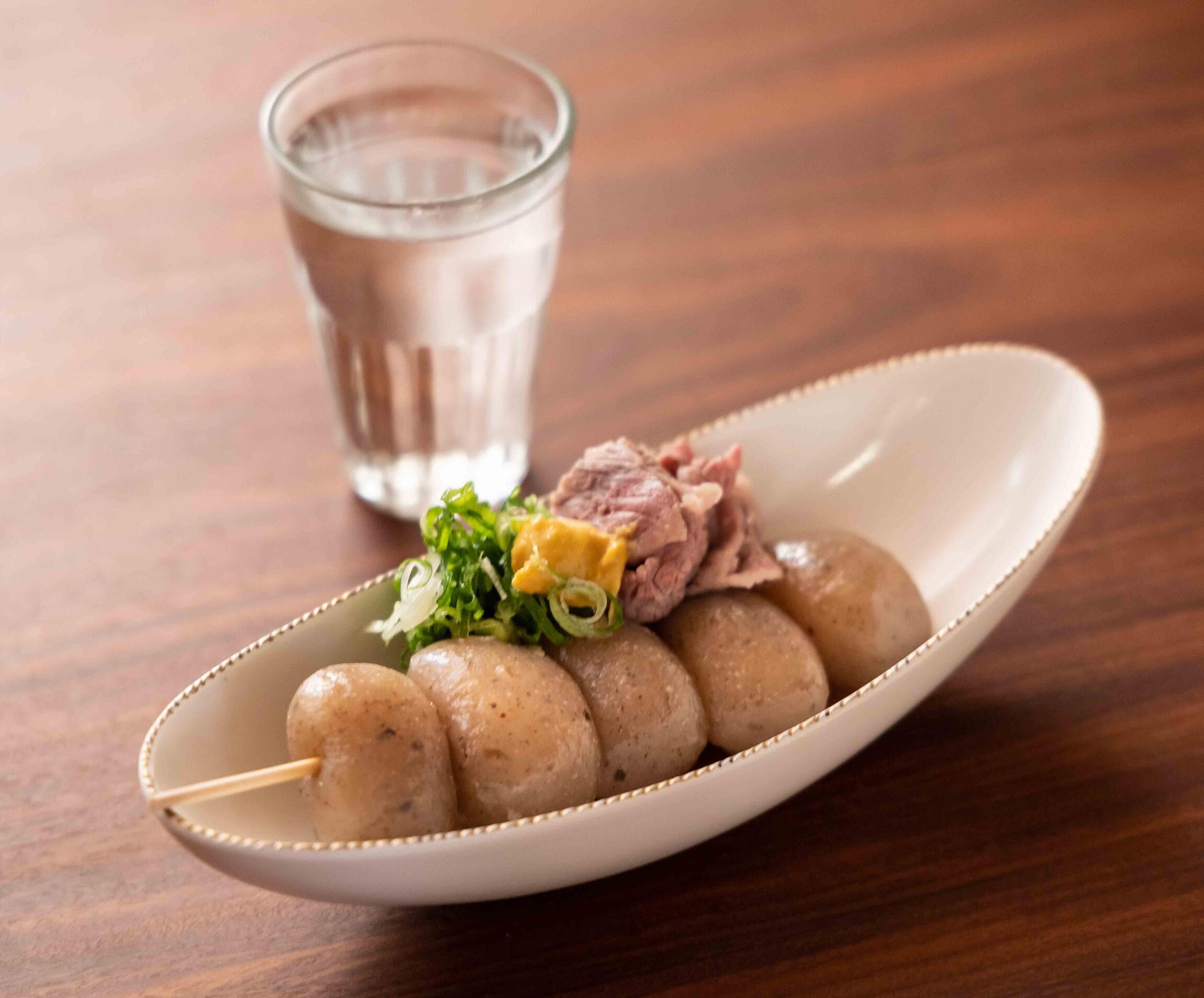地味だけど独特の風味と食感がクセになる、こんにゃく。今回使った玉こんにゃくは、山形県発祥の球状のこんにゃくで、弾力があって歯ごたえがあるのが特徴です。こんにゃくはピリ辛や甘辛の味つけにすることが多いですが、この玉こんにゃくはいしると水だけで煮る醤油味。それを串に刺しています。いしるはガツンとした旨味や独特の風味がある魚醤で、自然なコクでこんにゃくを引き立ててくれます。