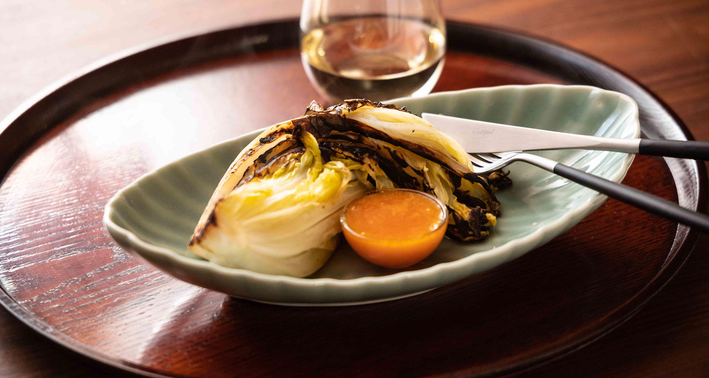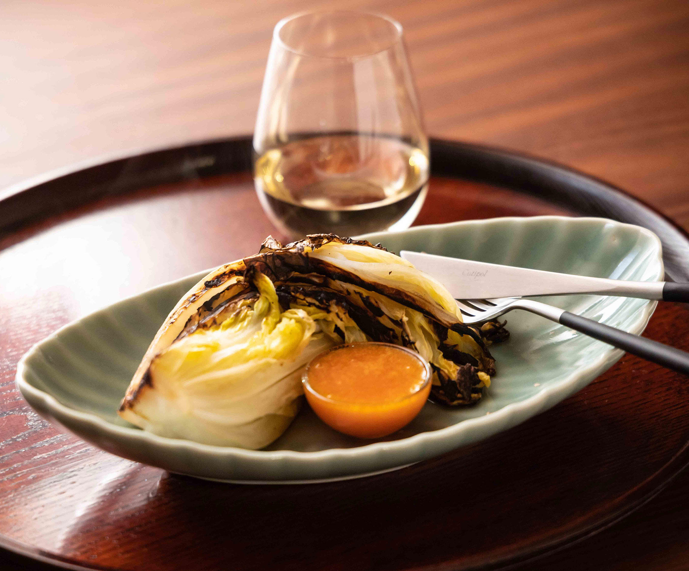 焼き白菜だけでも美味しいのですが、明太卵黄ソースでいただくと俄然白ワインが欲しくなります。シンプルに白菜そのものの美味しさを噛みしめるもよし、ソースをたっぷりからませて味わうもよし。お好みの味を探りながらお楽しみください。