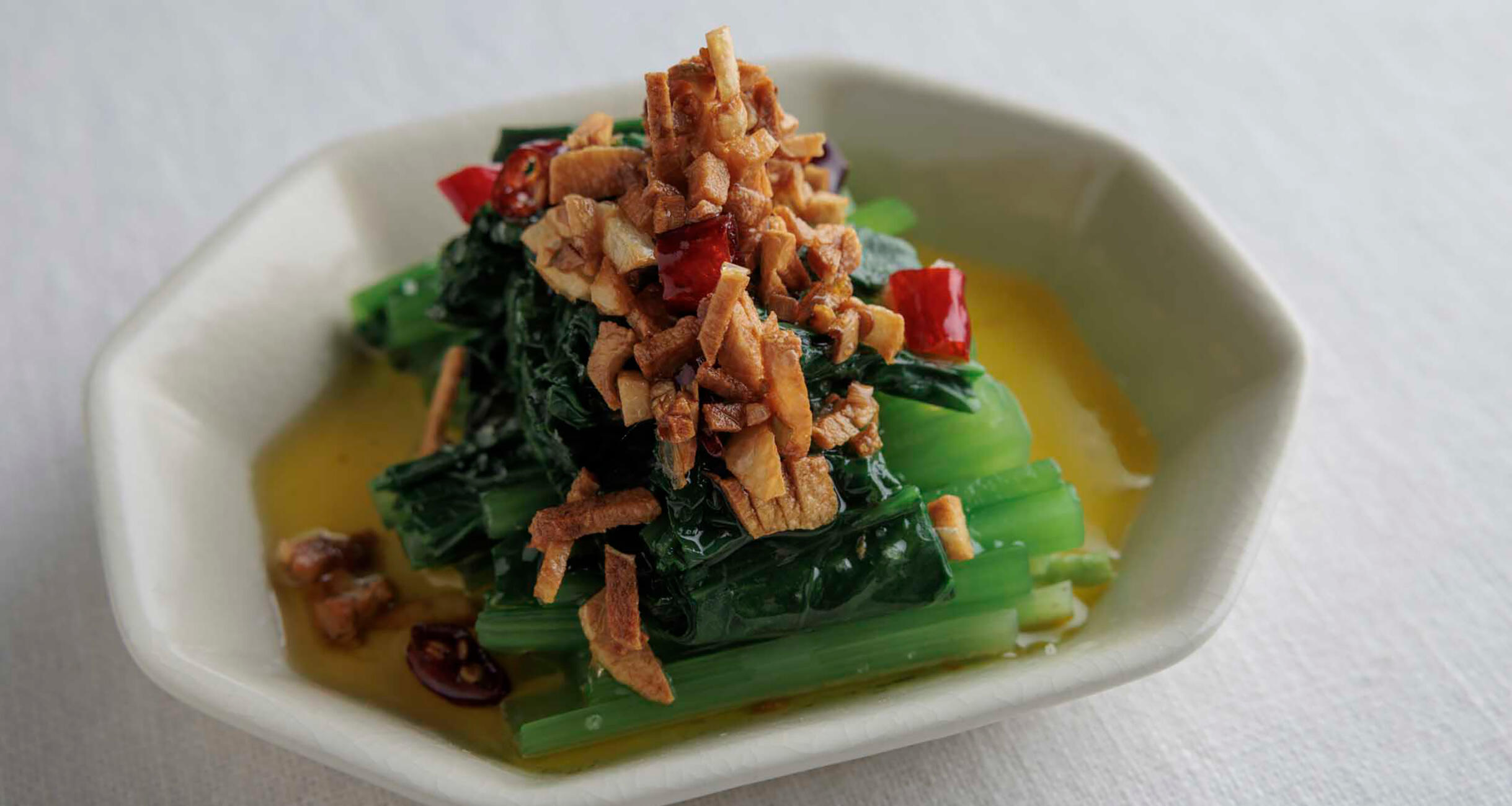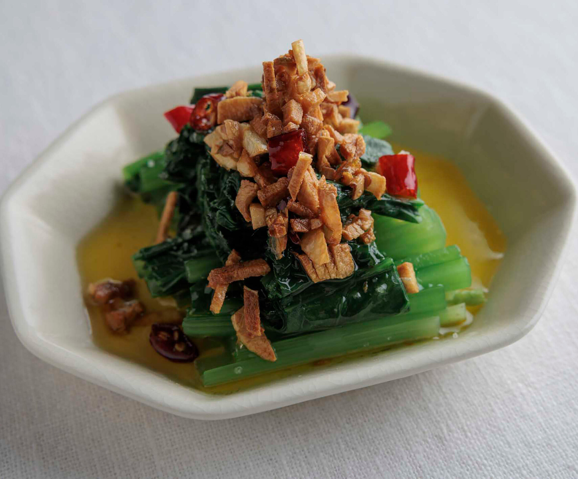 スペイン風おひたしのような感覚で、たっぷりと食べられる。塩は小松菜を盛りつけた上にふるだけ。オイルをかければ自然となじむ。