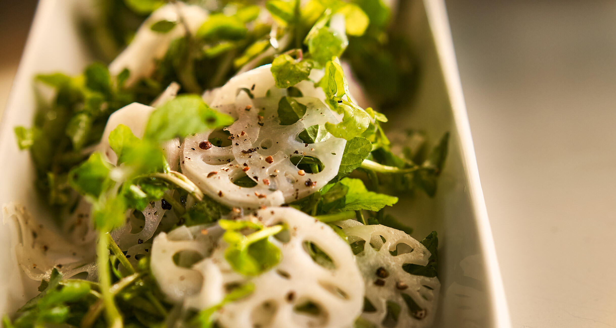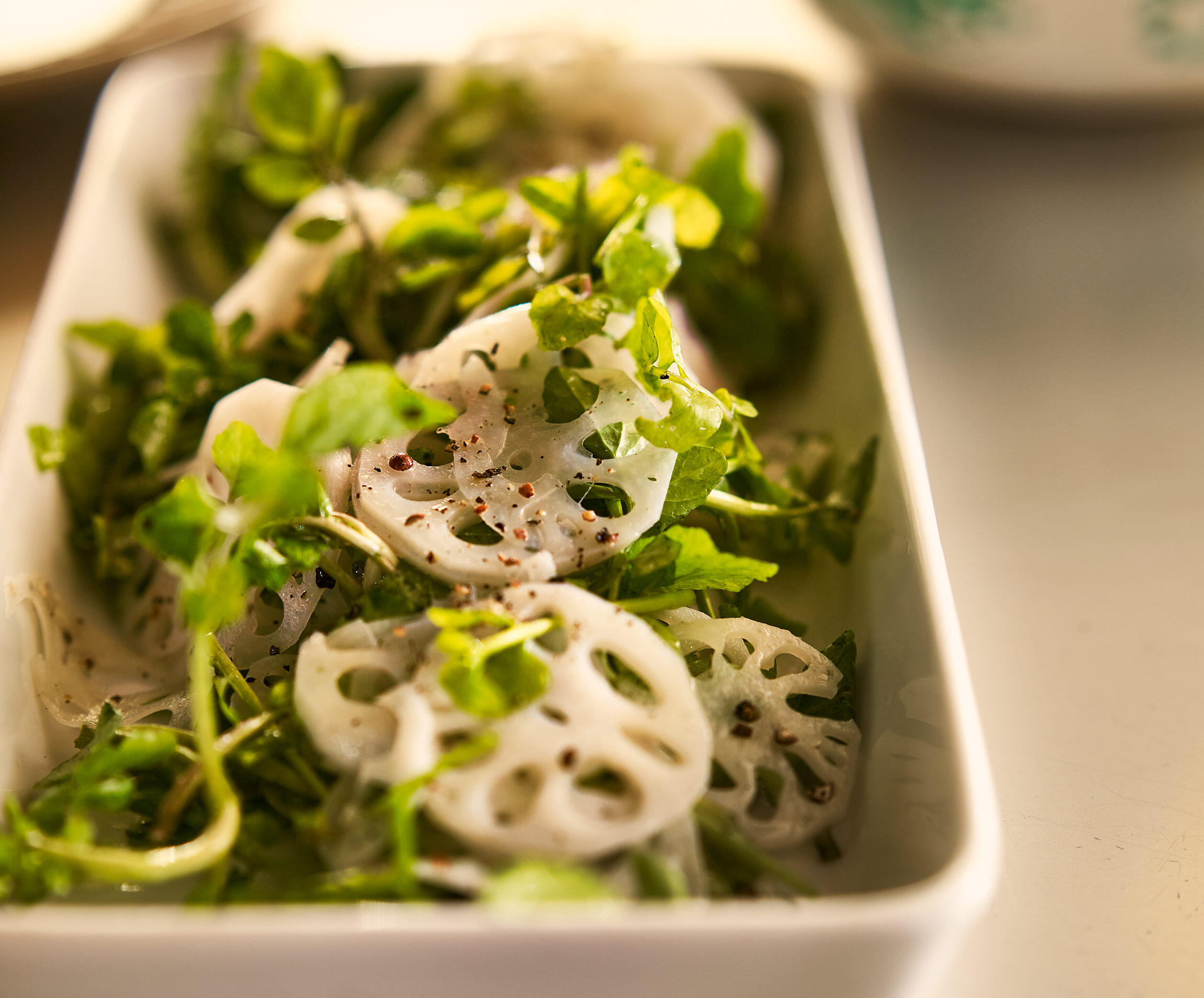 れんこんのシャキシャキの歯ごたえとほんのりした甘味がおいしいシンプルなサラダ。横に肉料理があっても魚料理があってもぴったりと合う。好みでドレッシングに柚子胡椒少々を加えてもおいしい。