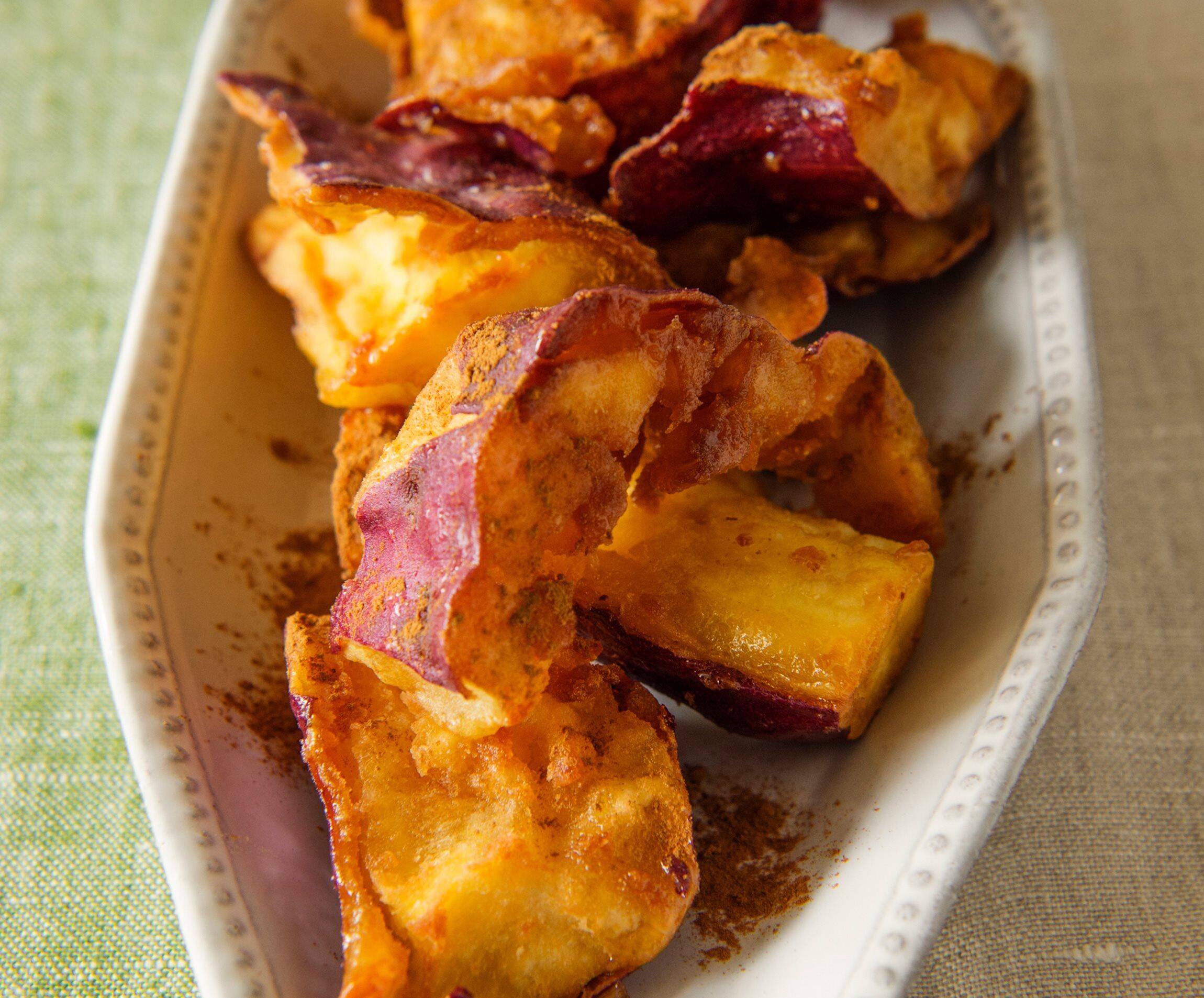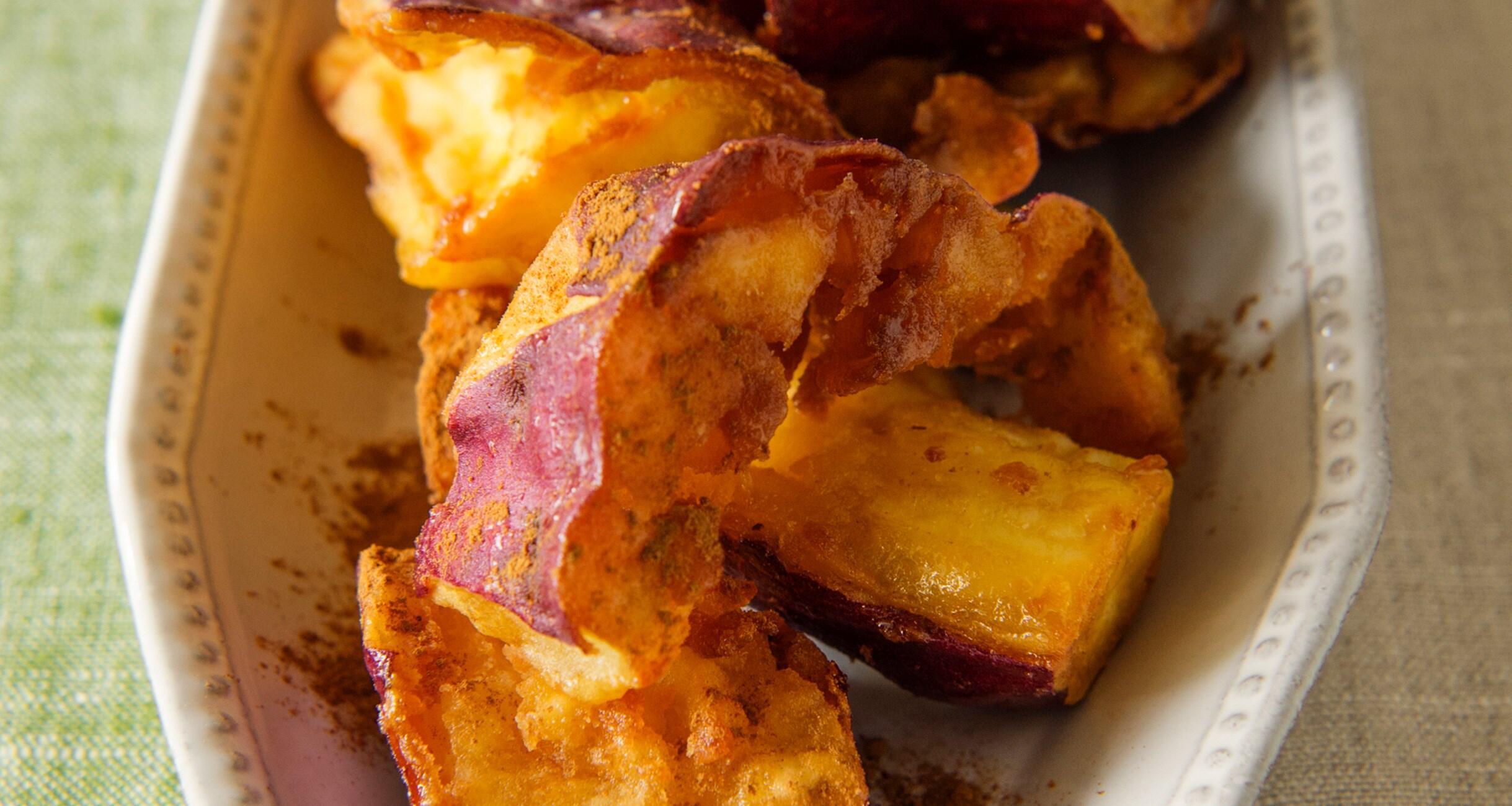 芋類や根菜をから揚げにするときは、あらかじめレンジで加熱しておいたり薄味で煮ておくと、揚げ時間が短くてすむ。切り方も、たたいたり乱切りにすることで飽きない美味しさに!さつまいもは電子レンジで加熱してから手で割って揚げると手軽。カリカリを楽しみたいから、皮付きのままで。