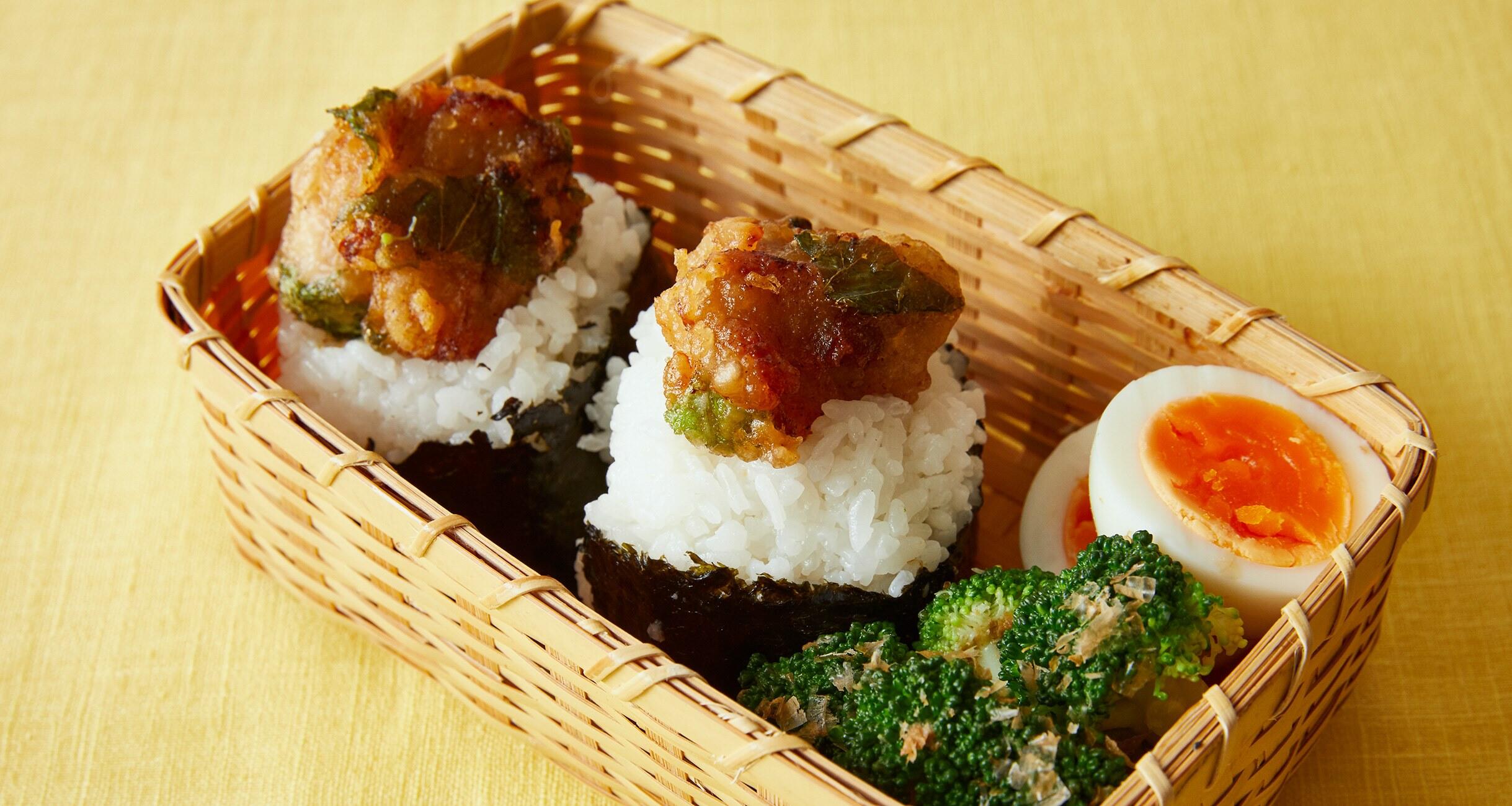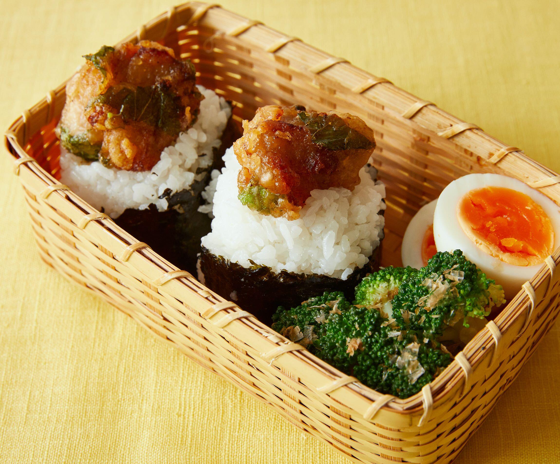 梅干しは火を通すことで酸味が旨味に変わり、肉の味をグッと引き立ててくれる。青じその爽やかな香りやグリーンもいいアクセント。から揚げを丸ごとご飯にのせれば、ビジュアルも楽しいおにぎり弁当の出来上がりだ。毎日のランチが待ち遠しくなる、ワクワクのから揚げ弁当を料理研究家の吉田愛さんに教えてもらいました。