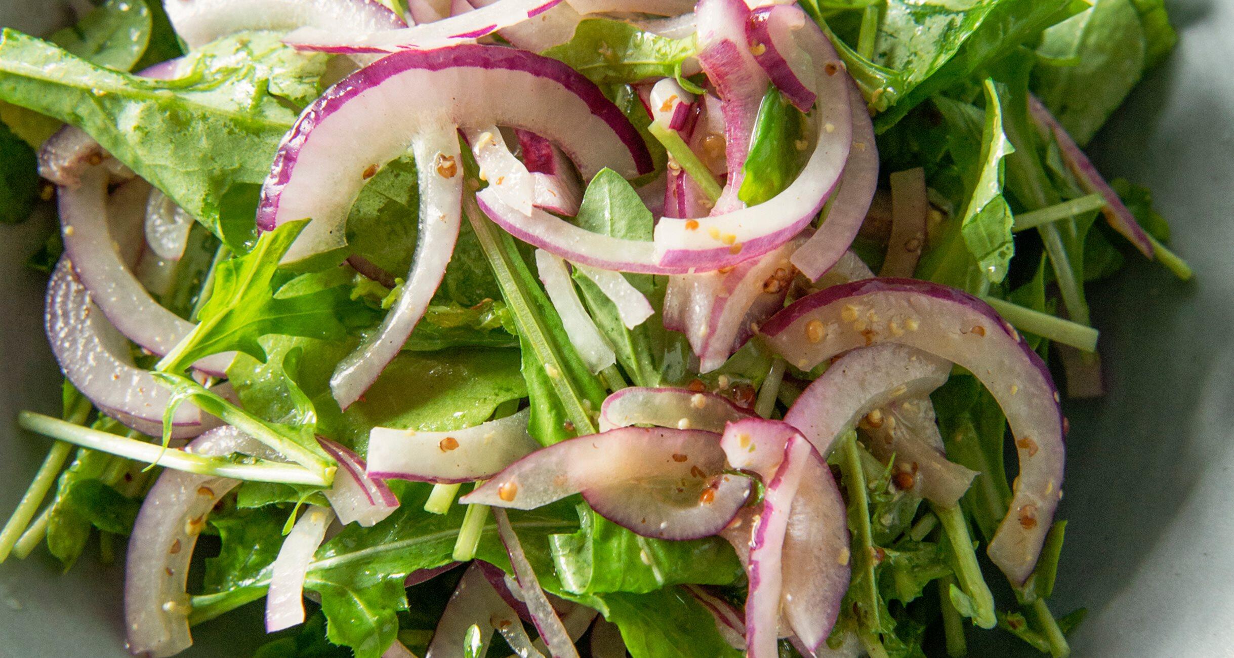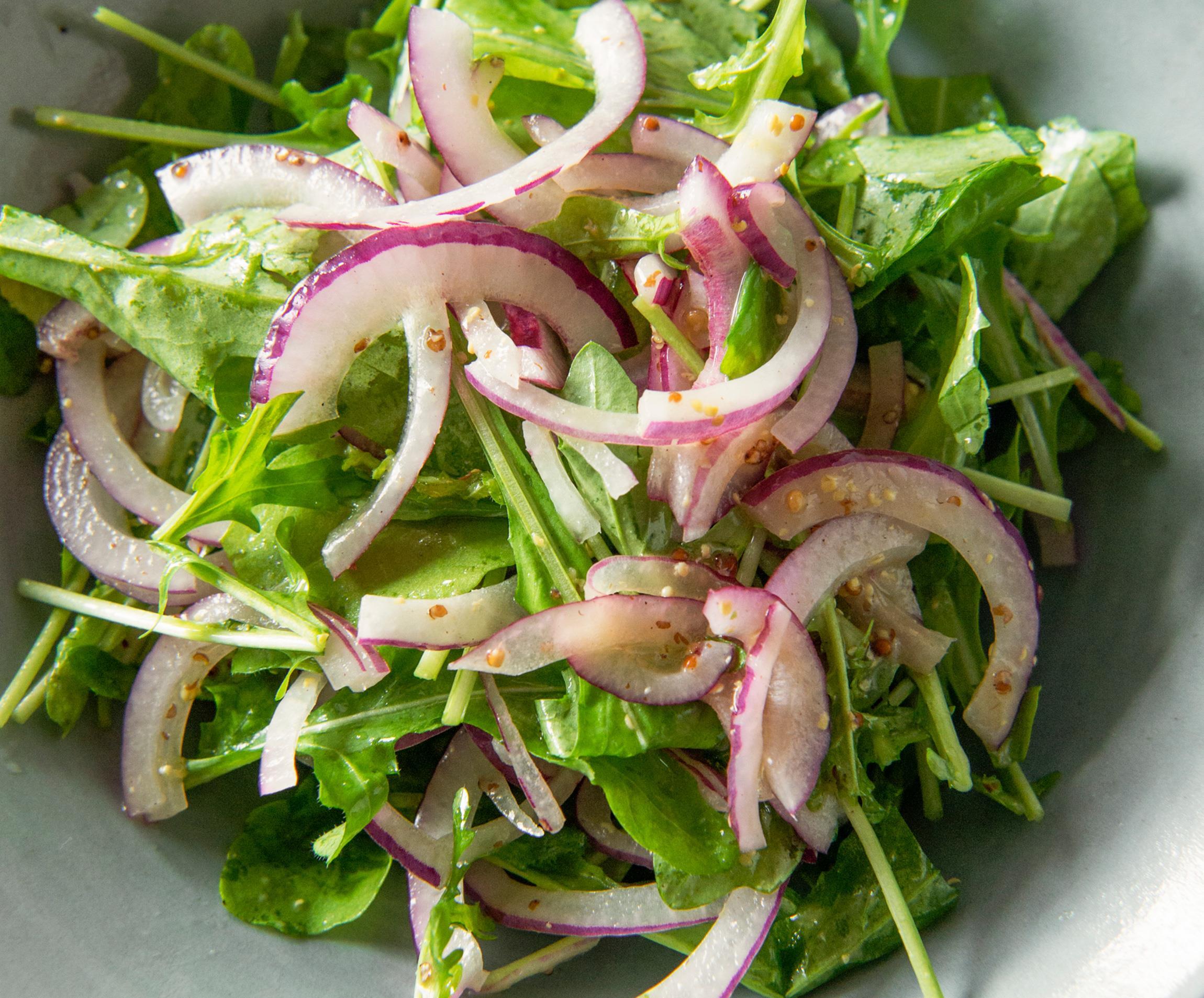 ルッコラのほか、クレソンや水菜でつくっても。鶏のから揚げをのせておかずサラダにするのもあり。