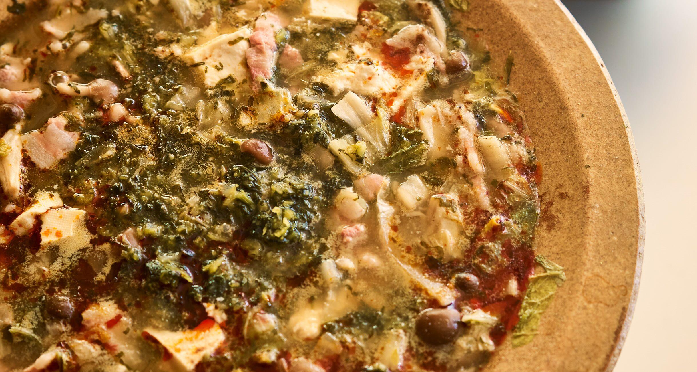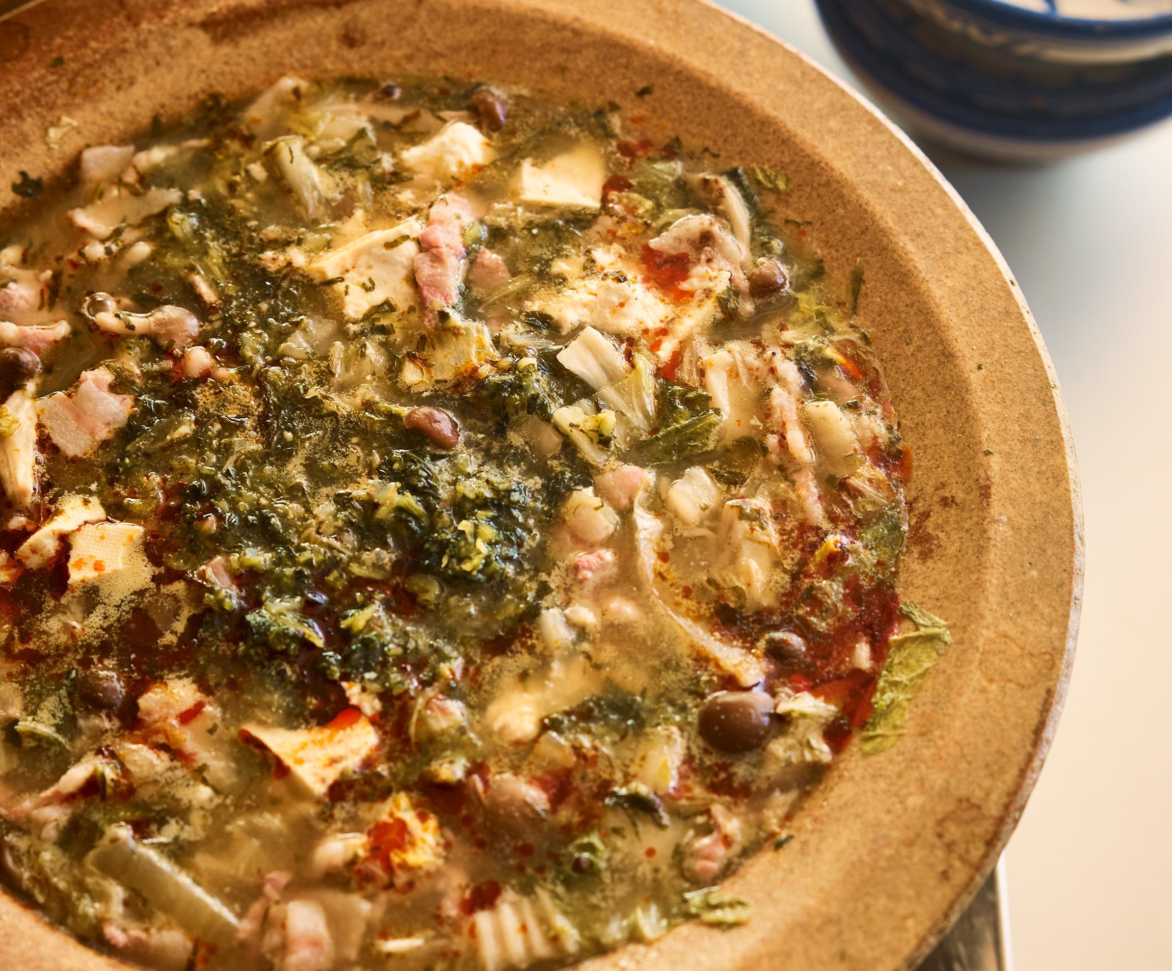 鍋に湯4カップ(分量外)を沸かし、鶏がらスープのもとと発酵白菜を汁ごと入れて煮立てる。豚肉をほぐしながら入れ、豆腐は大きくくずしながら入れる。しめじ、花椒も加えて煮る。