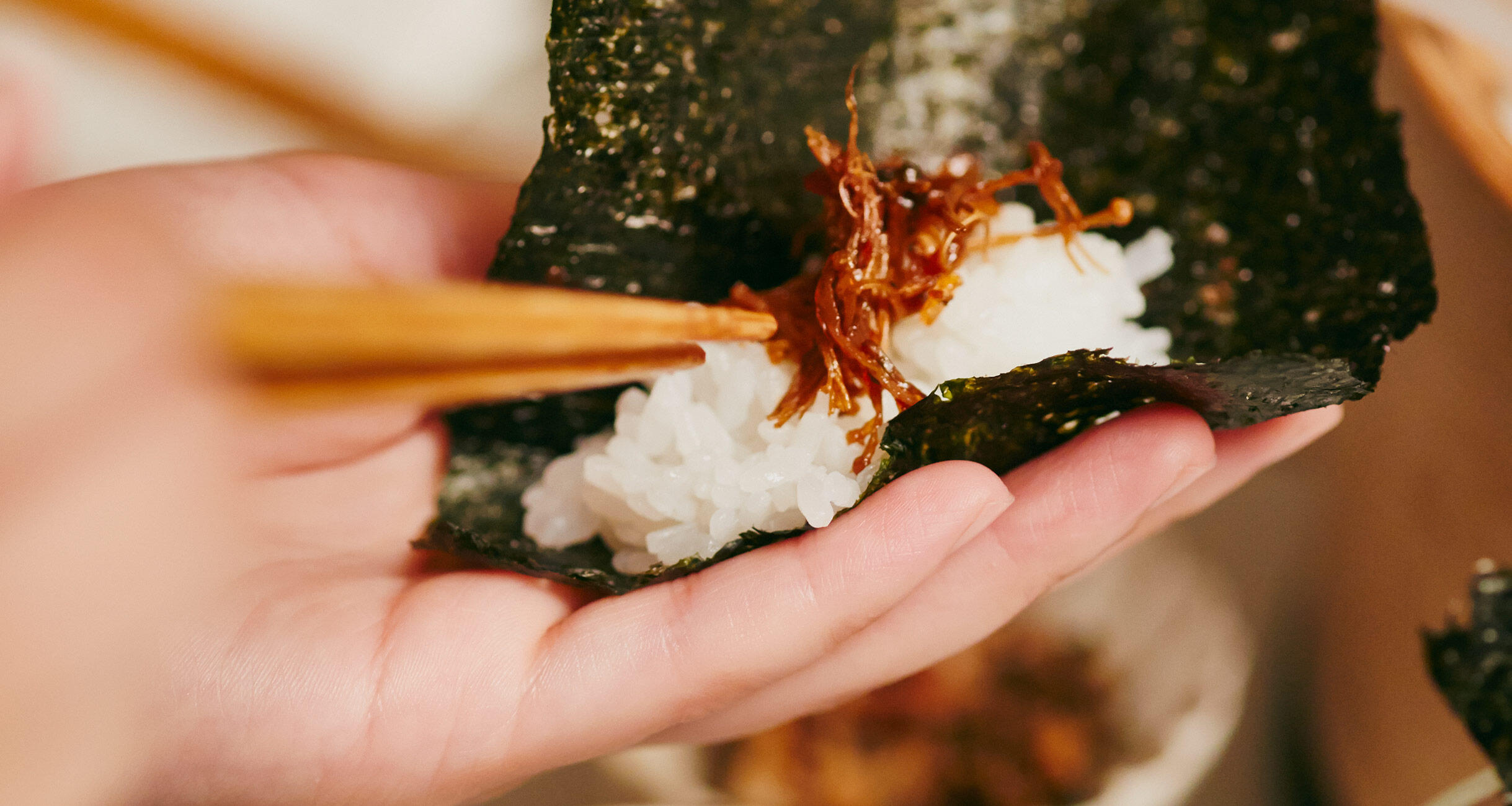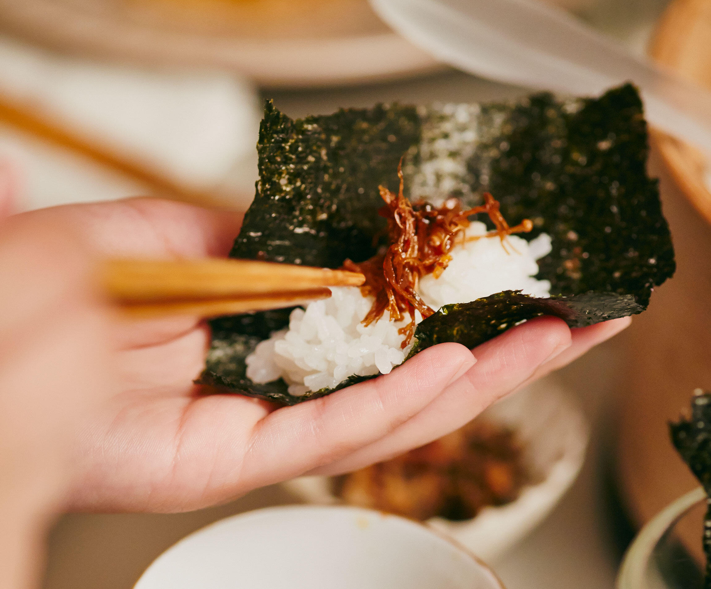 白いご飯にのせてくるりと海苔で巻くと……おいしい!と思わず声が出そう。旨味とほどよい辛味がご飯にぴったりです。常備しておけば使い道が広がります。たくさんつくってゲストのお土産にしたら最高に喜ばれそう。