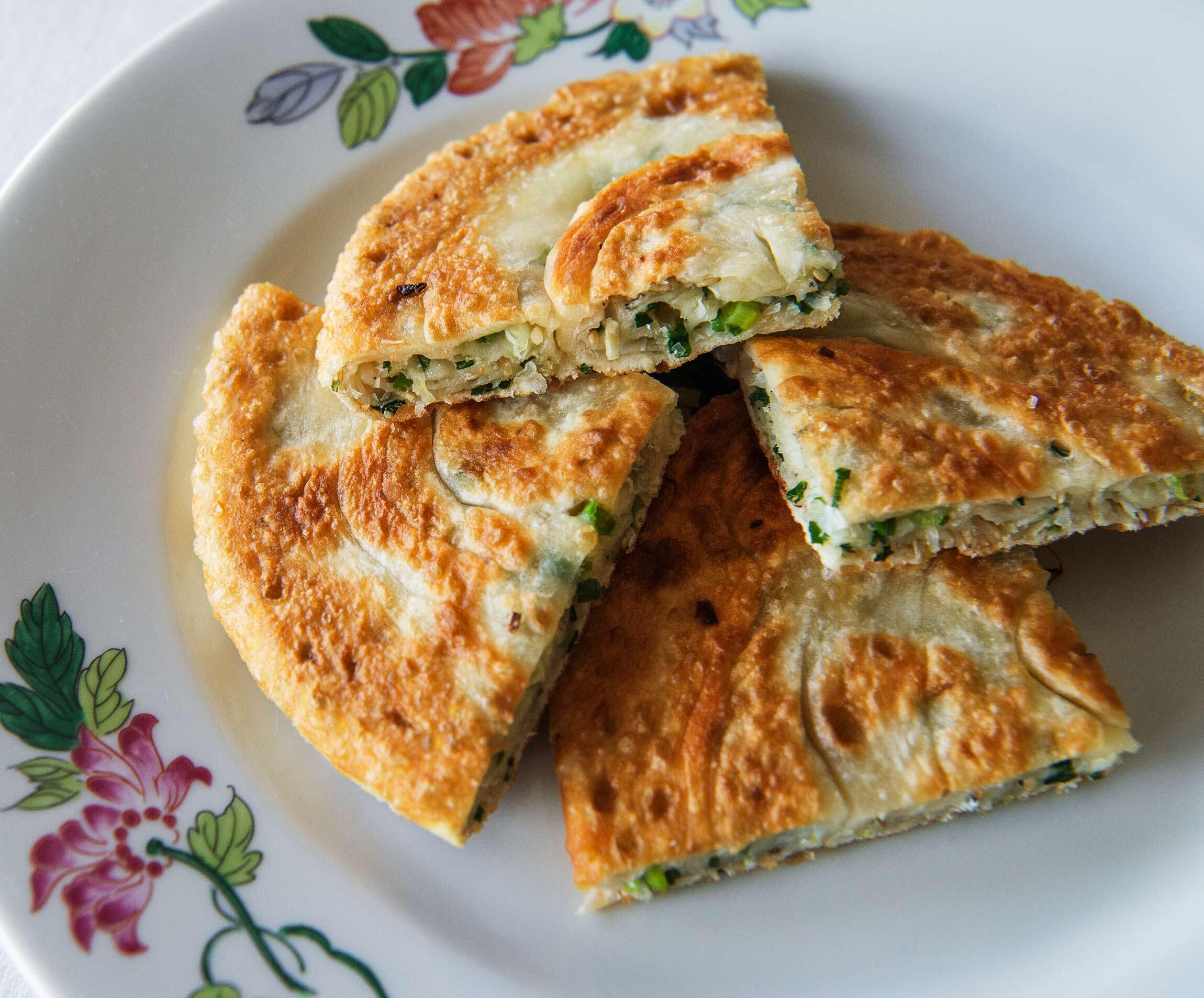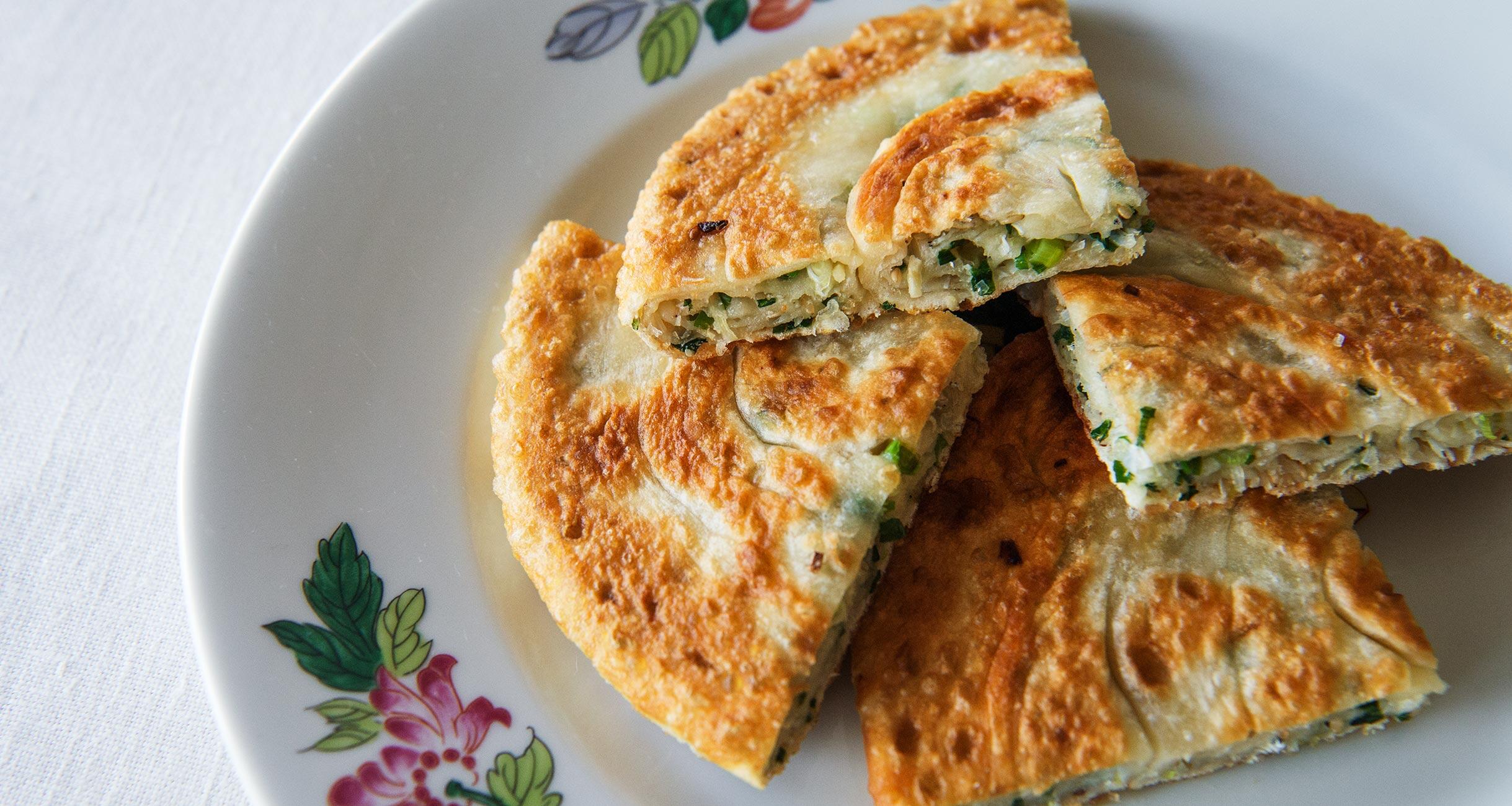 フライパンに胡麻油大さじ2を熱して生地1枚を入れ、フライ返しで軽く押さえて中火で3分ほど焼き、蓋をして弱火で3~4分焼く。