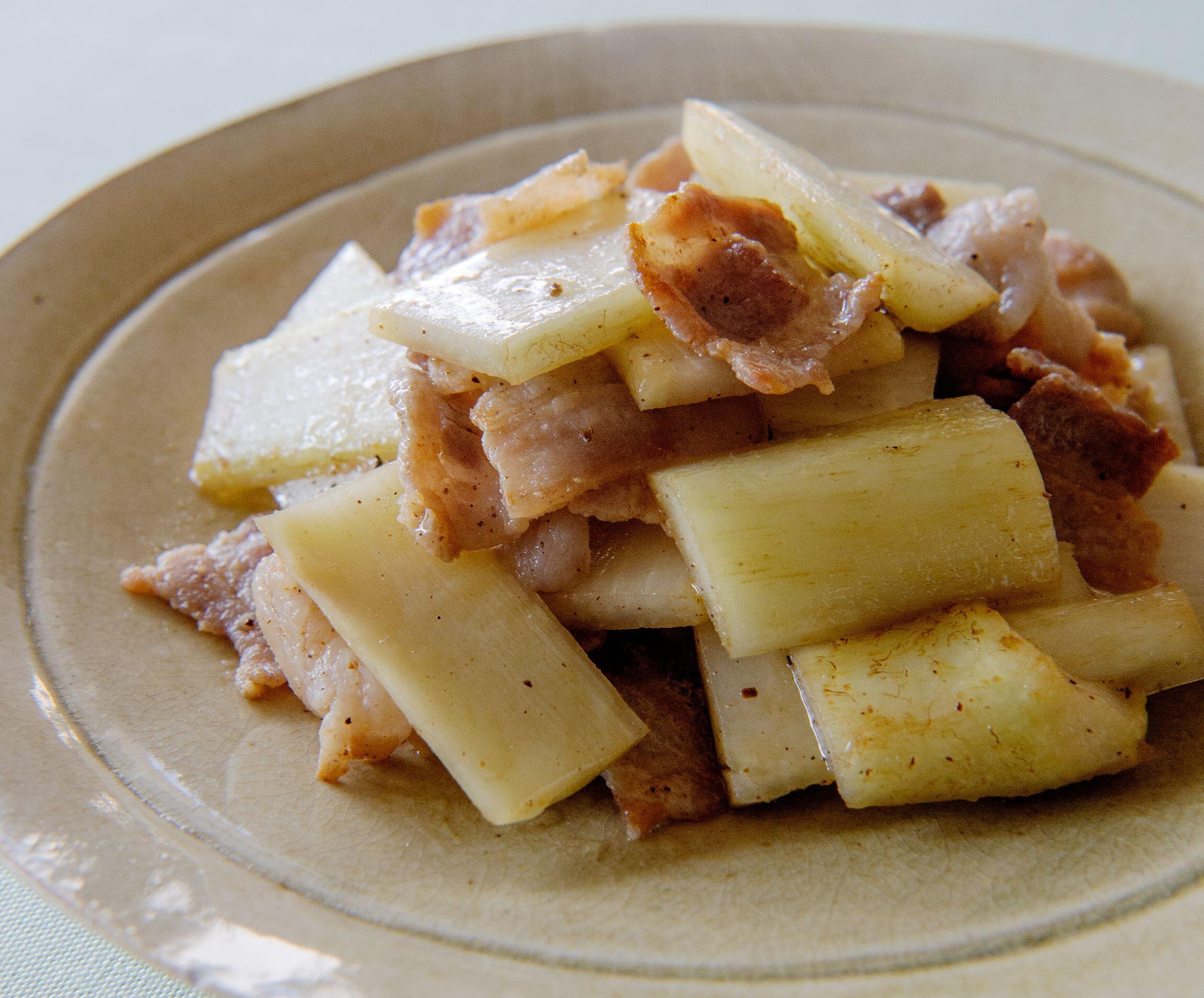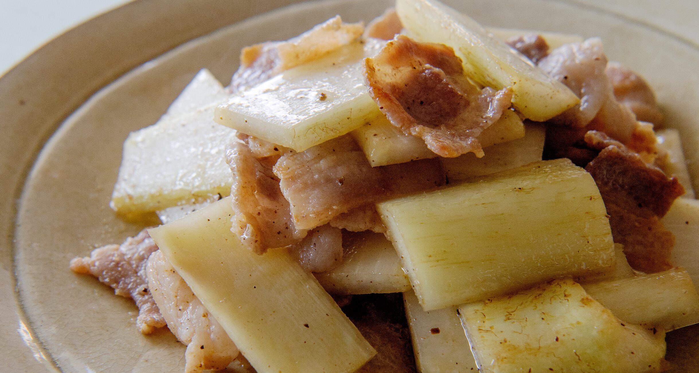 シンプルに塩、胡椒の味つけにすると、うどの風味が引き立ちます。香りのよい皮はむかず、そのまま使うのがポイント。豚バラ肉のまろやかな脂を全体にからませて。塩味をつくる塩、醤油、味噌の3つを軸に、余分な調味料を省いた「これで決まり」の引き算料理を料理研究家の大庭英子さんに教えてもらいました。
