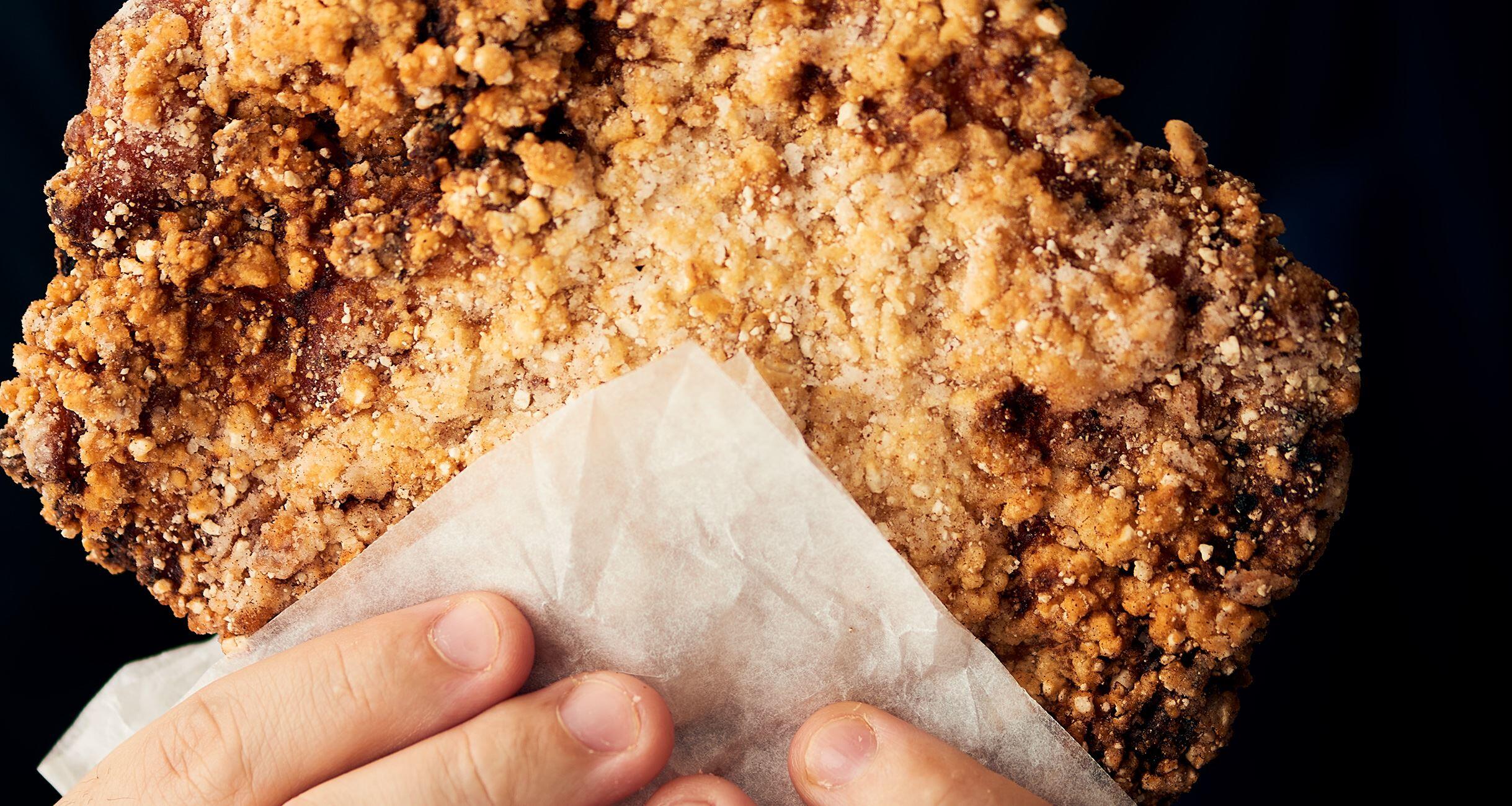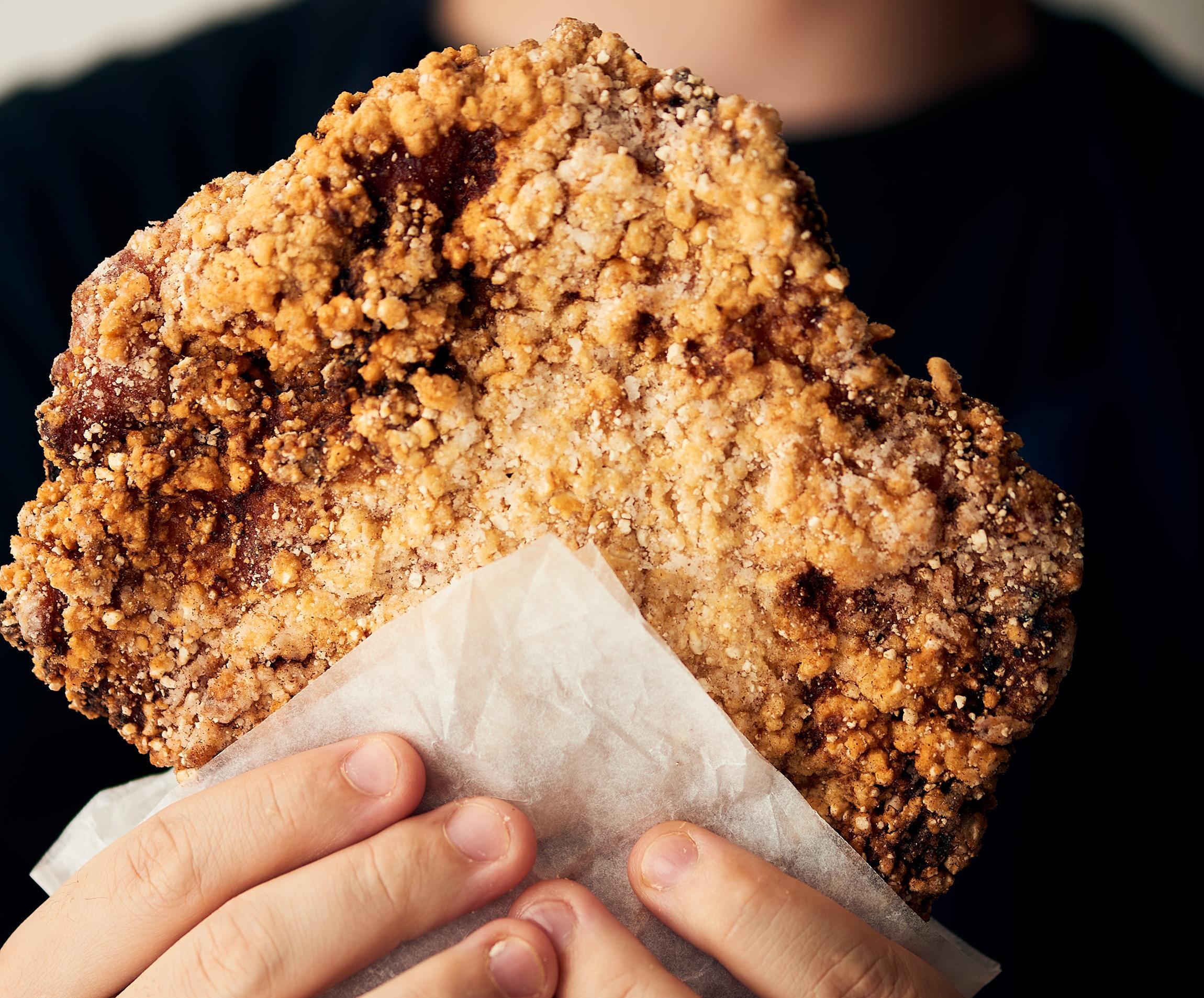 たたいて柔らかくなった鶏胸肉と、ガリッとした衣のコントラストがなんとも強烈。噛むたびに五香粉の風味がふんわり漂って、異国の町の風景が思い浮かぶよう。大判にかぶりついて食べるもよし、切り分けて食べるもよし。