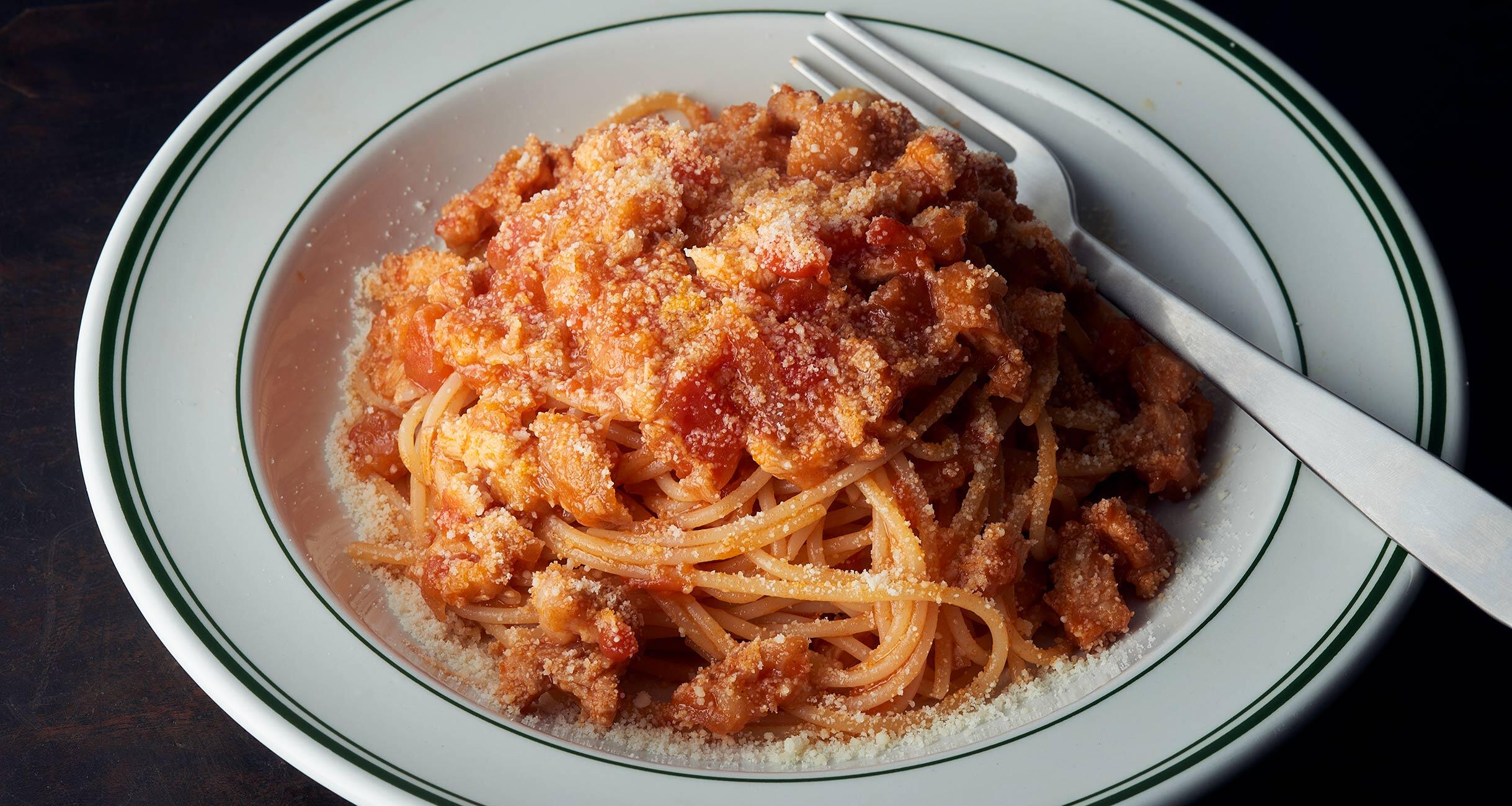 から揚げを刻んで、ベーコン代わりにしたリメイクパスタ。元がから揚げだということを忘れてしまうくらい、トマトとよく合い絶品です!鶏を味わい尽くすから揚げレシピを料理研究家の今井 亮さんに教えてもらいました。