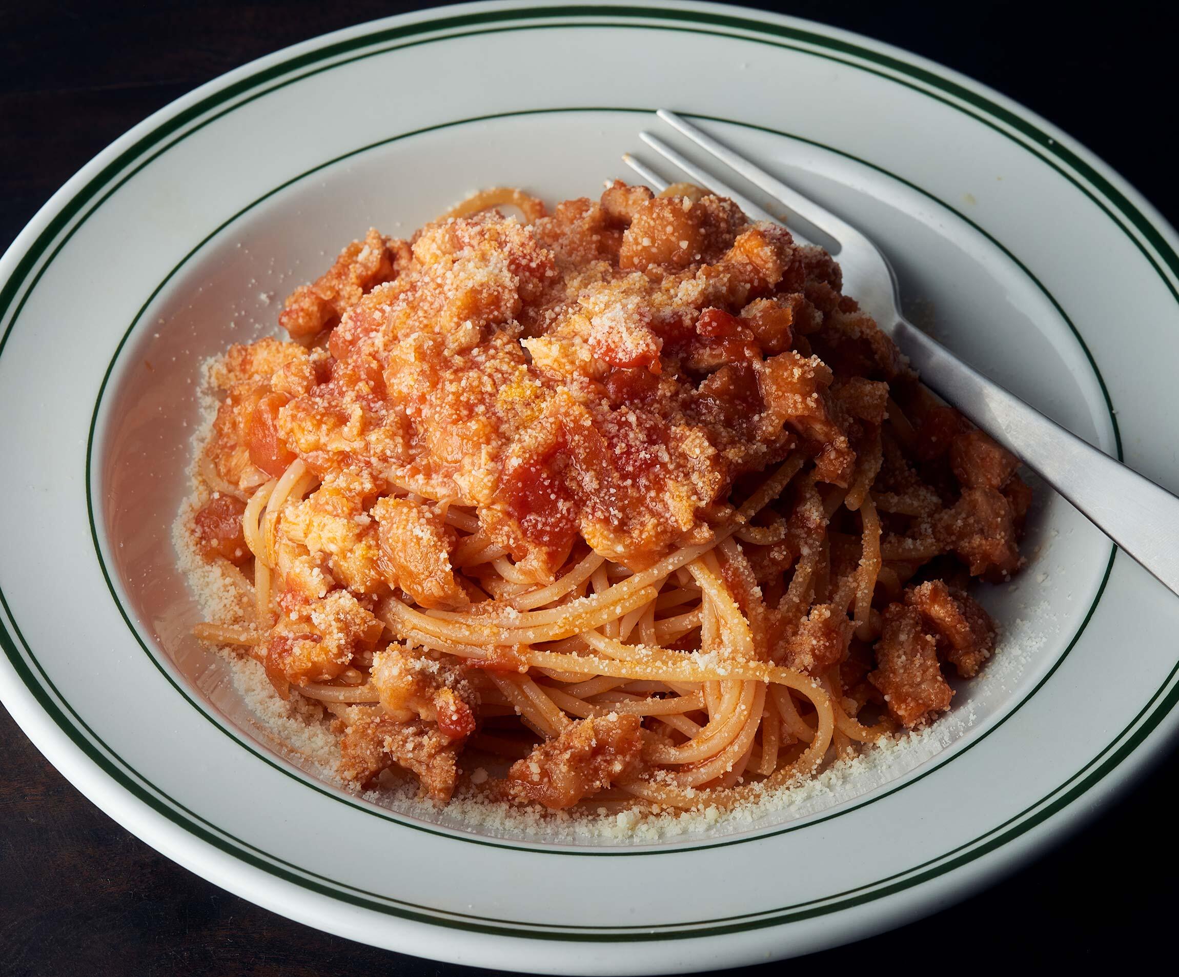 から揚げ、ケチャップに粉チーズ。旨味の塊ともいえる素材を投入したスパゲッティは、お子様ランチ的な懐かしいおいしさでテンションが上がる。もりもり食べたい!