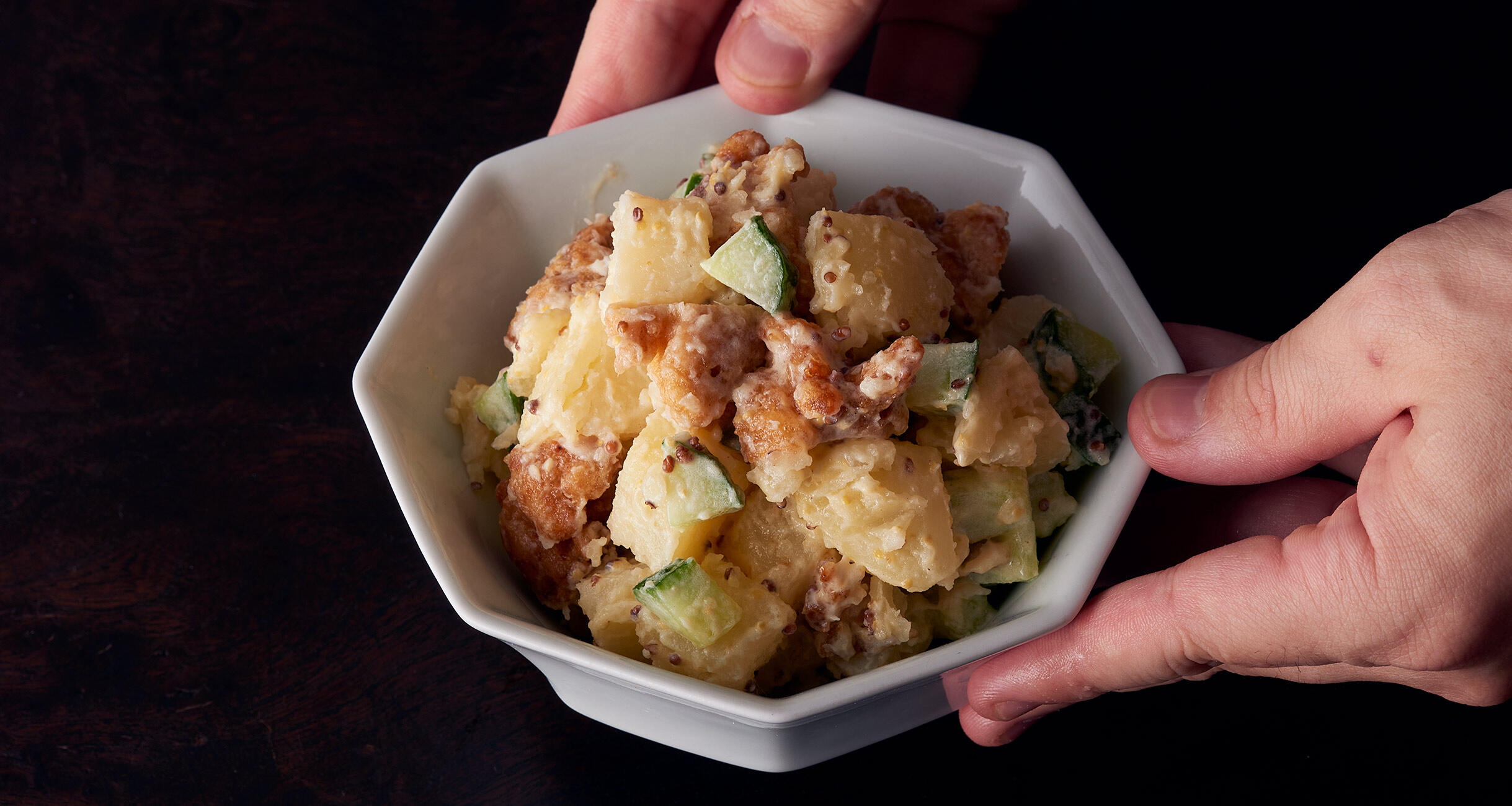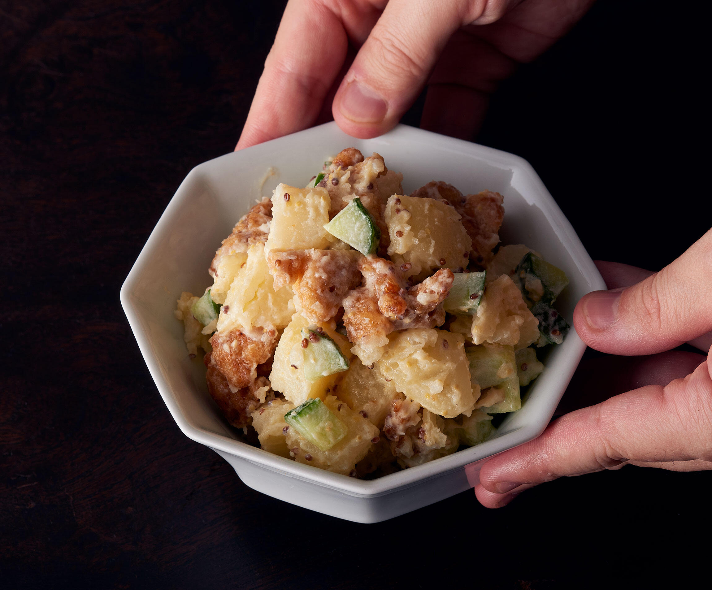 ポテサラ×から揚げ。居酒屋の二大つまみを混ぜ合わせた夢のようなコラボレーション。ビールによし、ハイボールによし!鶏を味わい尽くすから揚げレシピを料理研究家の今井 亮さんに教えてもらいました。