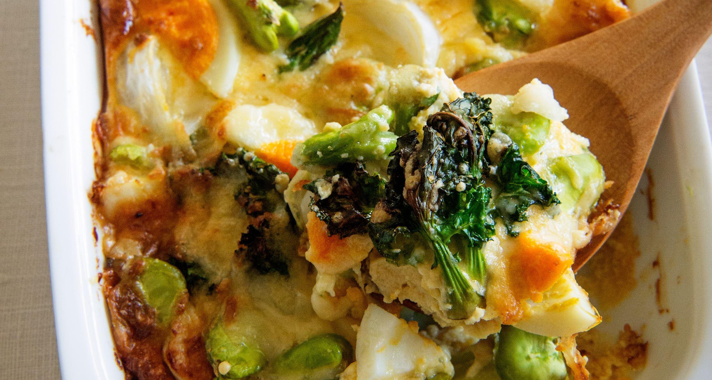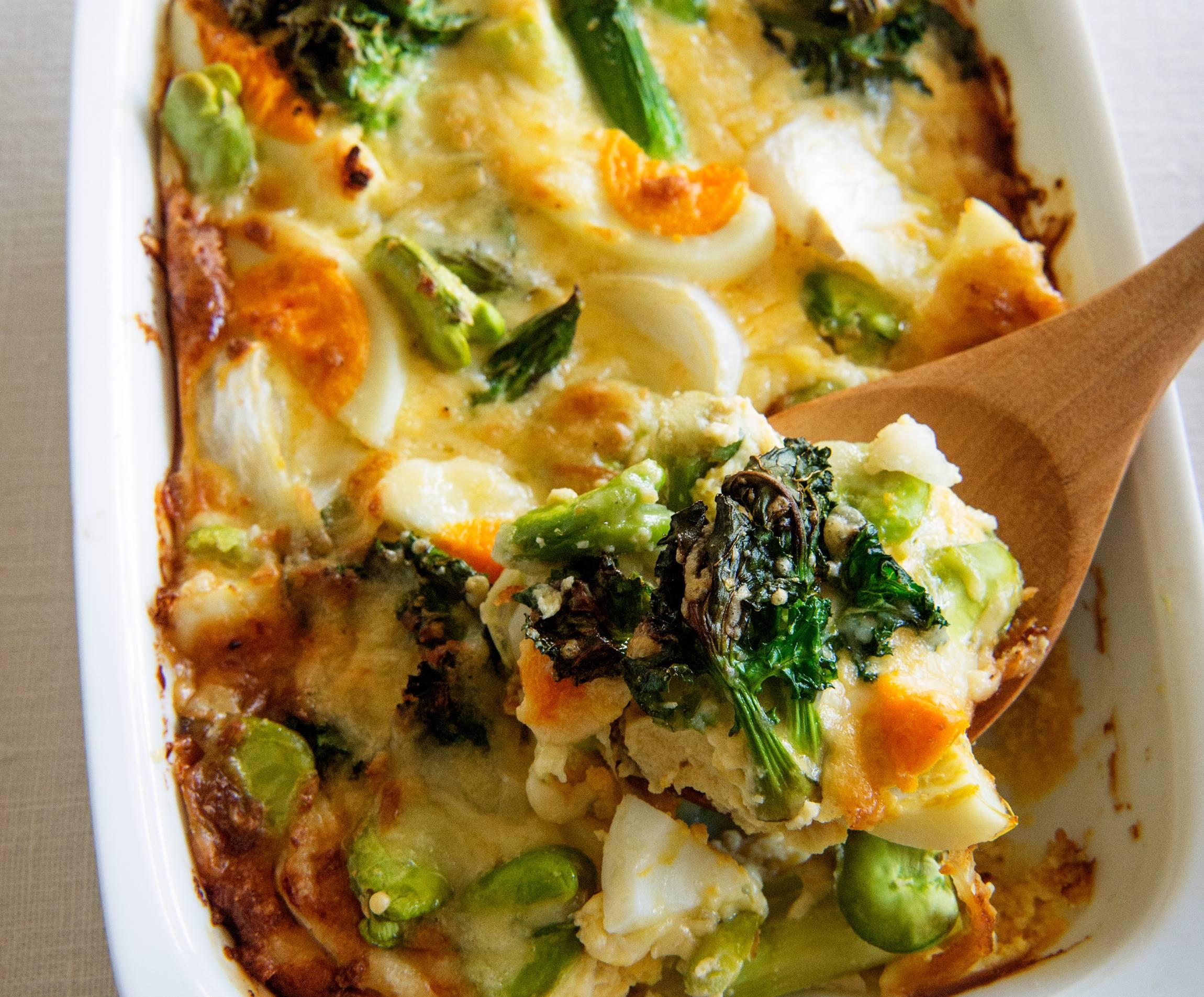 緑鮮やかな春野菜をグラタンに。ホワイトソースいらずだから気軽につくれます。具にソースにと卵が大活躍。春色の料理でテーブルも気分も華やぎます。塩味をつくる塩、醤油、味噌の3つを軸に、余分な調味料を省いた「これで決まり」の引き算料理を料理研究家の大庭英子さんに教えてもらいました。
