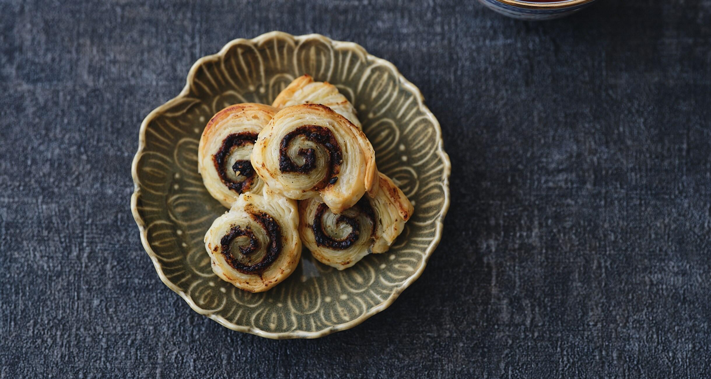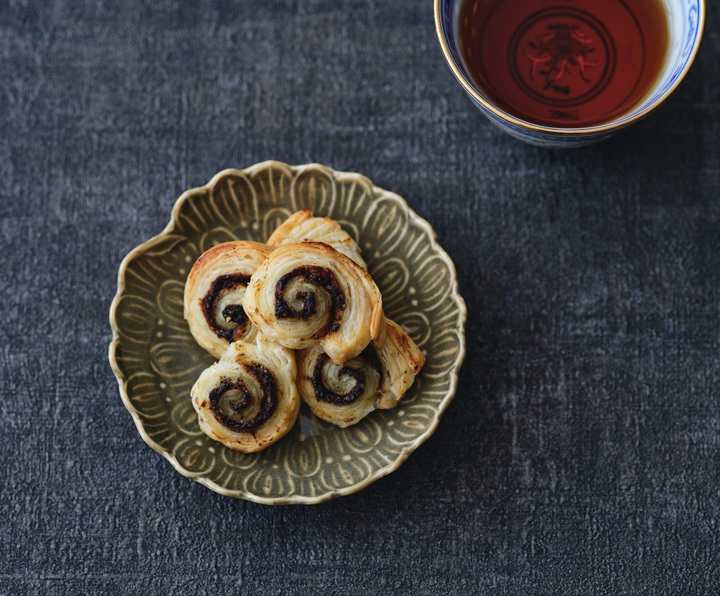 お菓子のようにつまめて、黒胡麻が香る甘くないパイ。甜麺醤のコクに香りのよい紹興酒を合わせて。京都の老舗中華料理店からキャリアをスタートした料理家・今井亮さんの、酒が進んで困るつまみをご紹介します。