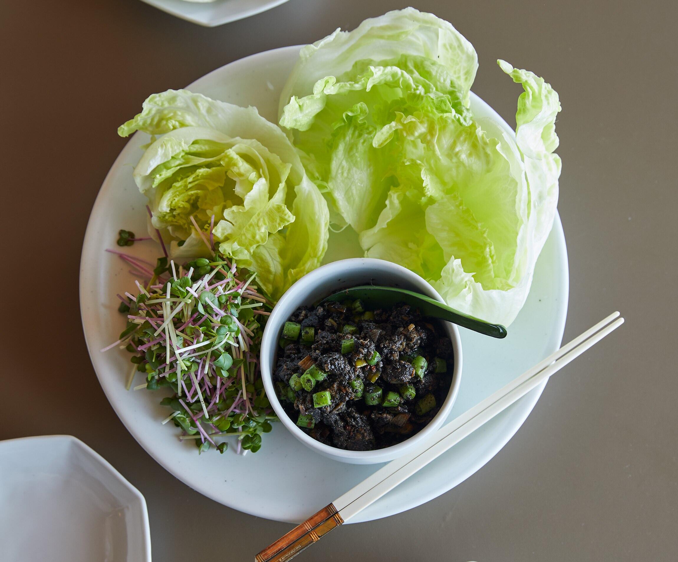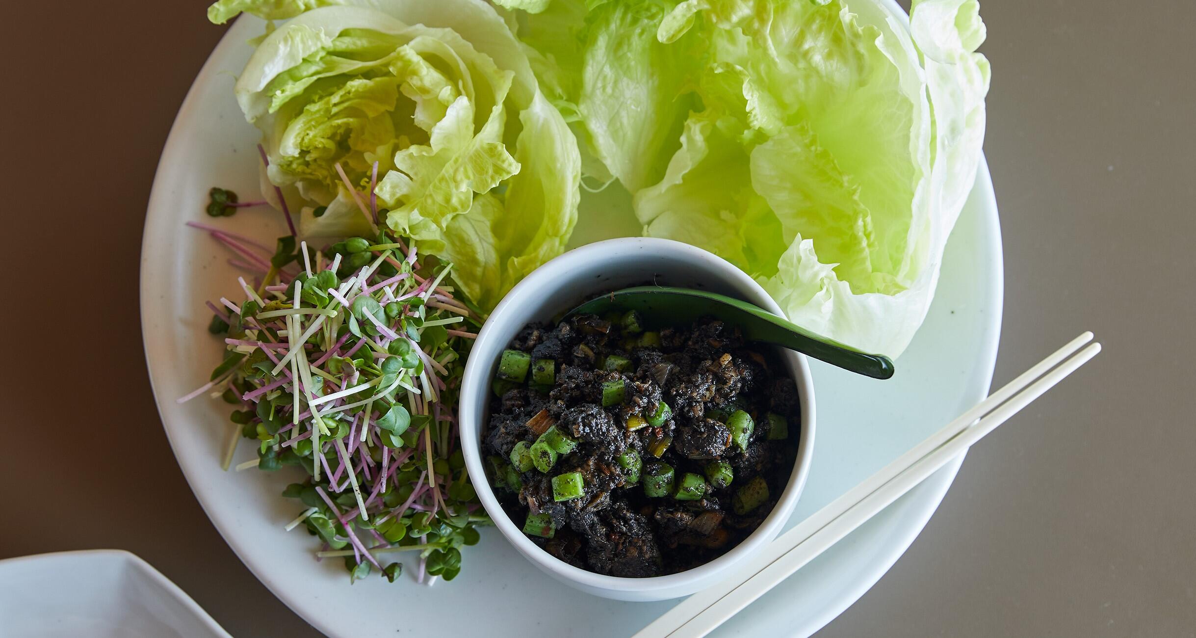 さやいんげんがアクセント。春らしく、シャキシャキのレタスで包んでいただきます。中華麺と和えて汁なし担担麺にしてもOK。