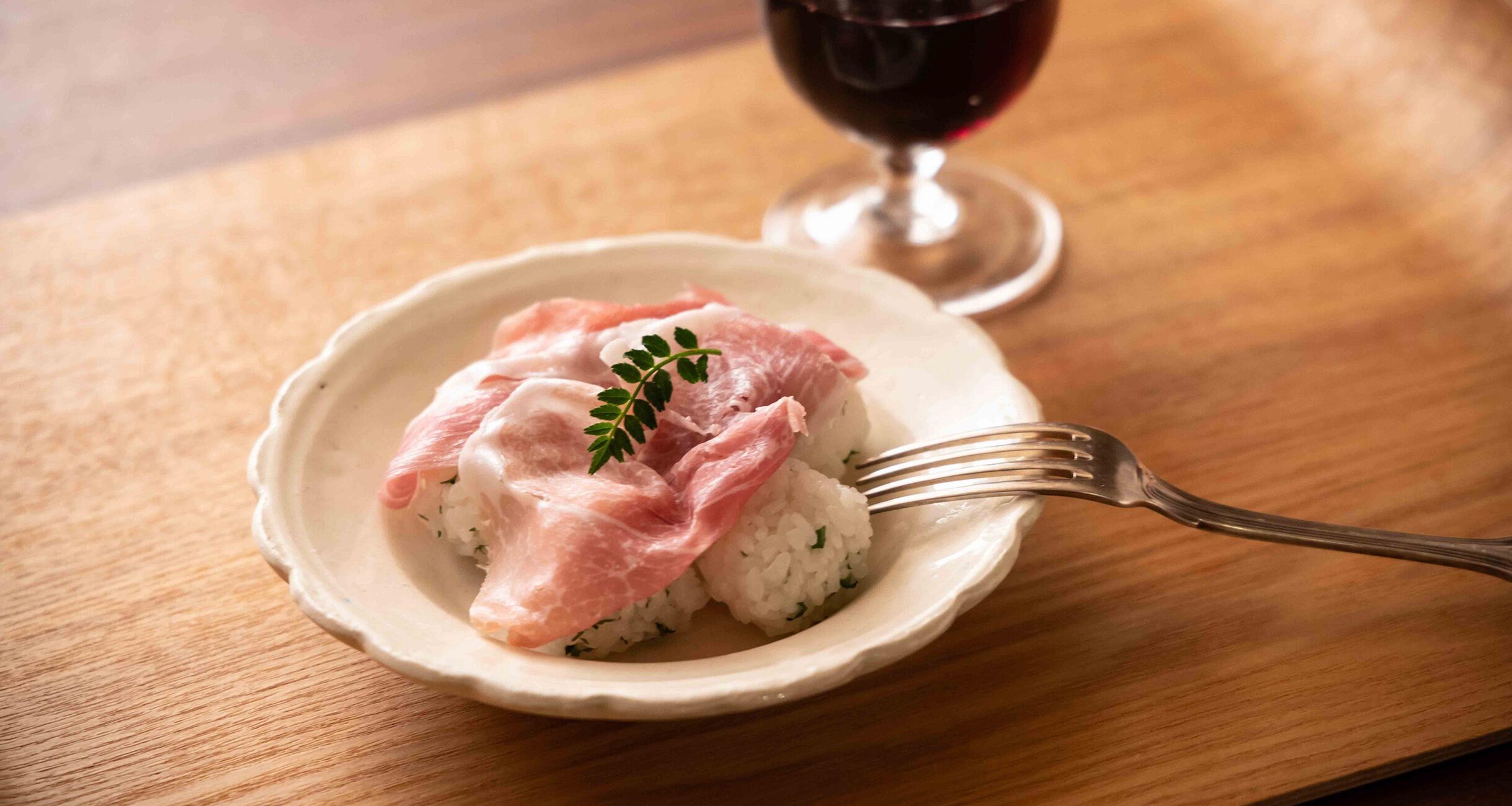 生ハムとご飯。意外な組み合わせで、ご飯で呑めるの?と思われがちですが、実はハムとご飯はとても相性がいいんです。ポイントは、温かいご飯でつくること。おむすびの上に生ハムをのせると脂がとろっとなって、ご飯にしっとりとなじみます。