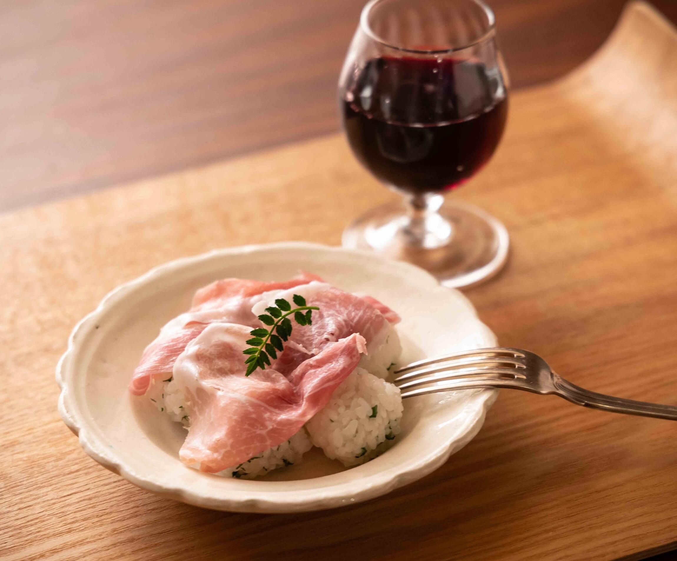 お薦めのお酒は生ハムと相性の良い、程よい渋みと甘味があってほのかな酸味が感じられる、赤の微発泡ワイン。ランブルスコがお薦めです。おむすびに合うの?と、まだ半信半疑な方。騙されたと思ってお試しください。