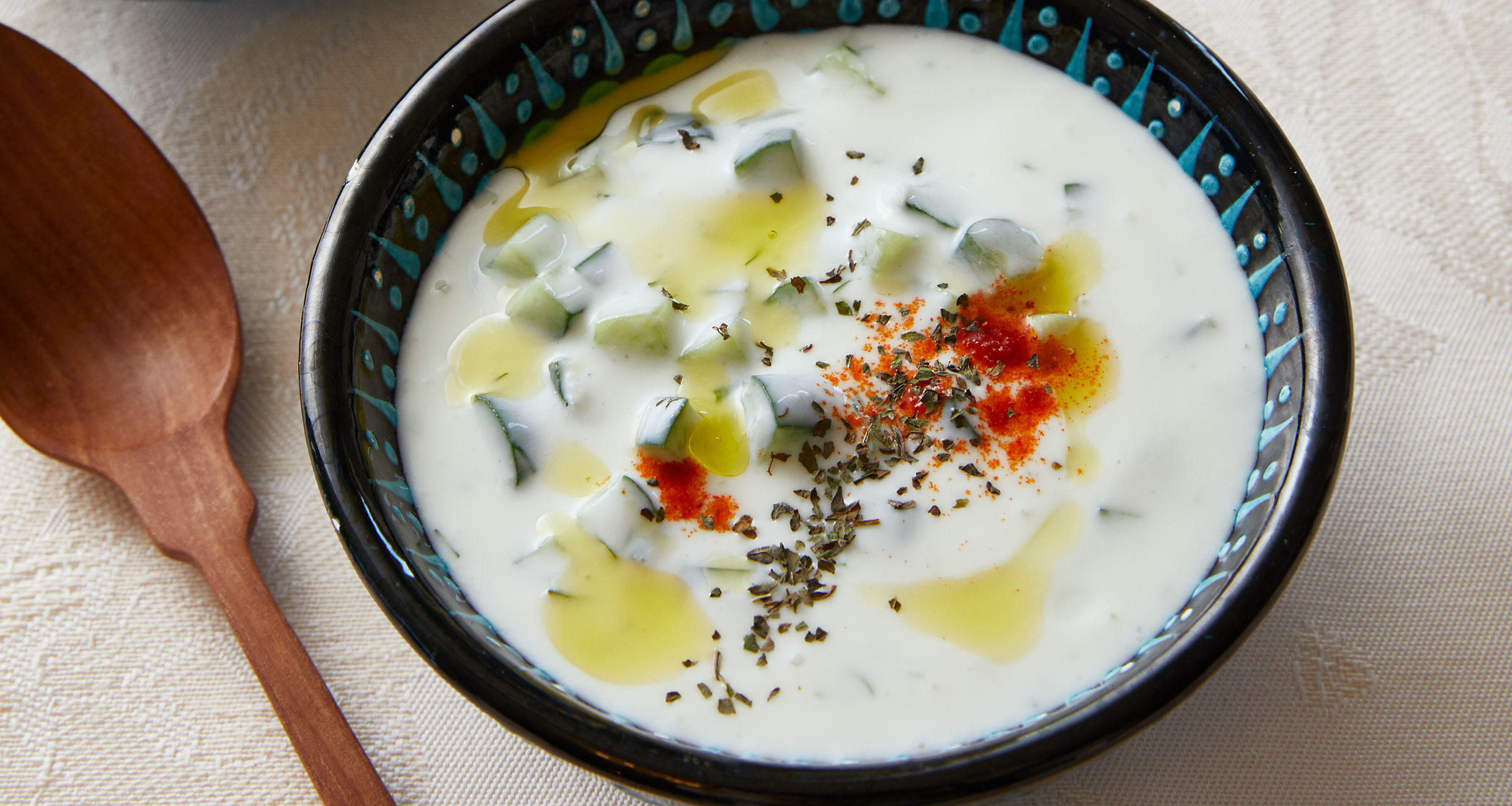 1にヨーグルトと水、にんにくを加えてよく混ぜたら器に盛り、ディル、ミント、チリペッパーを散らし、オリーブオイルを回しかける。