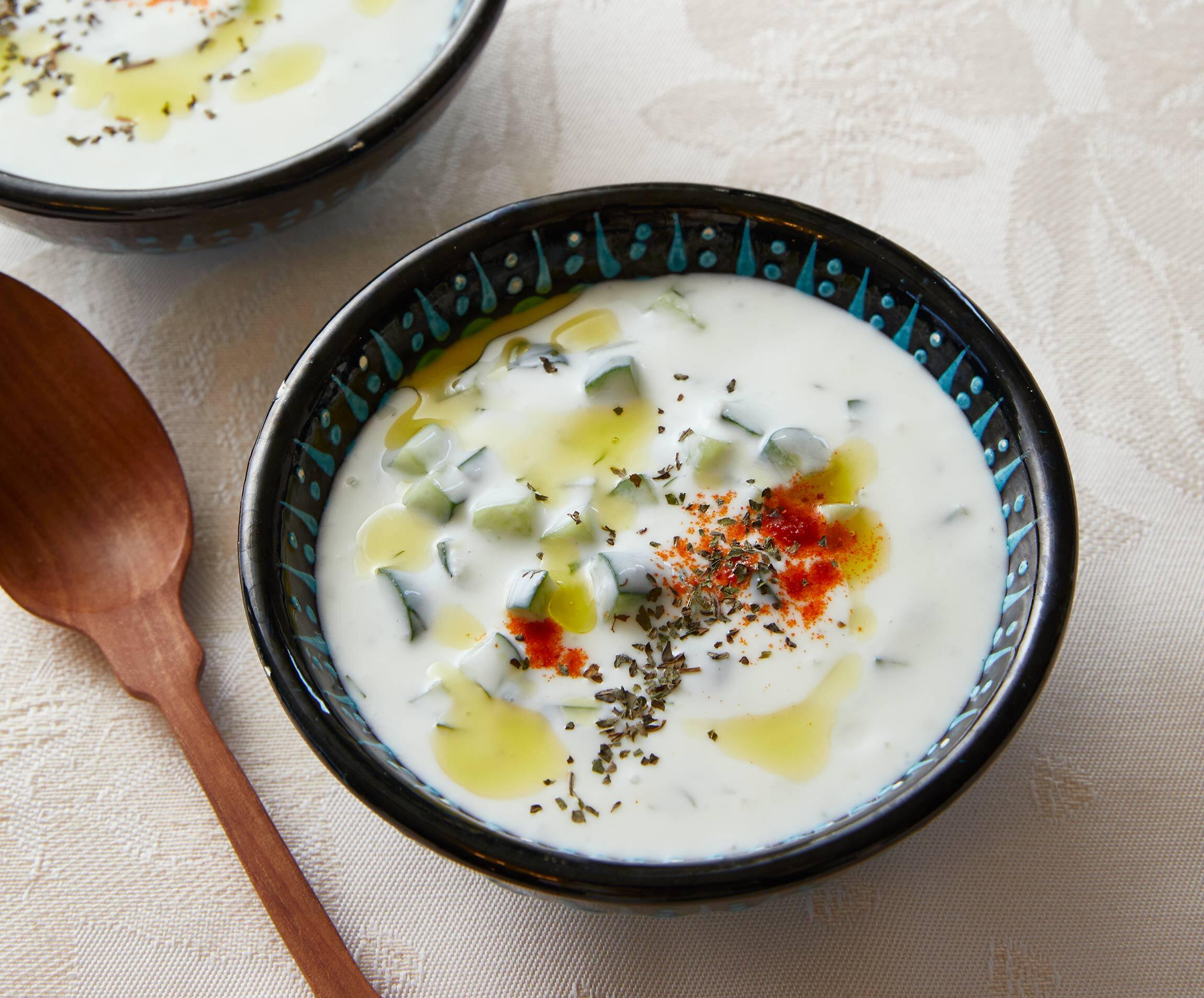 遊牧民は水を確保することが難しかったため、連れている家畜の乳を搾って飲んだり、ヨーグルトにして水分補給をしていました。ヨーグルトの軽やかな酸味と、きゅうりのコリコリとした食感の組み合わせがなんとも爽やか。