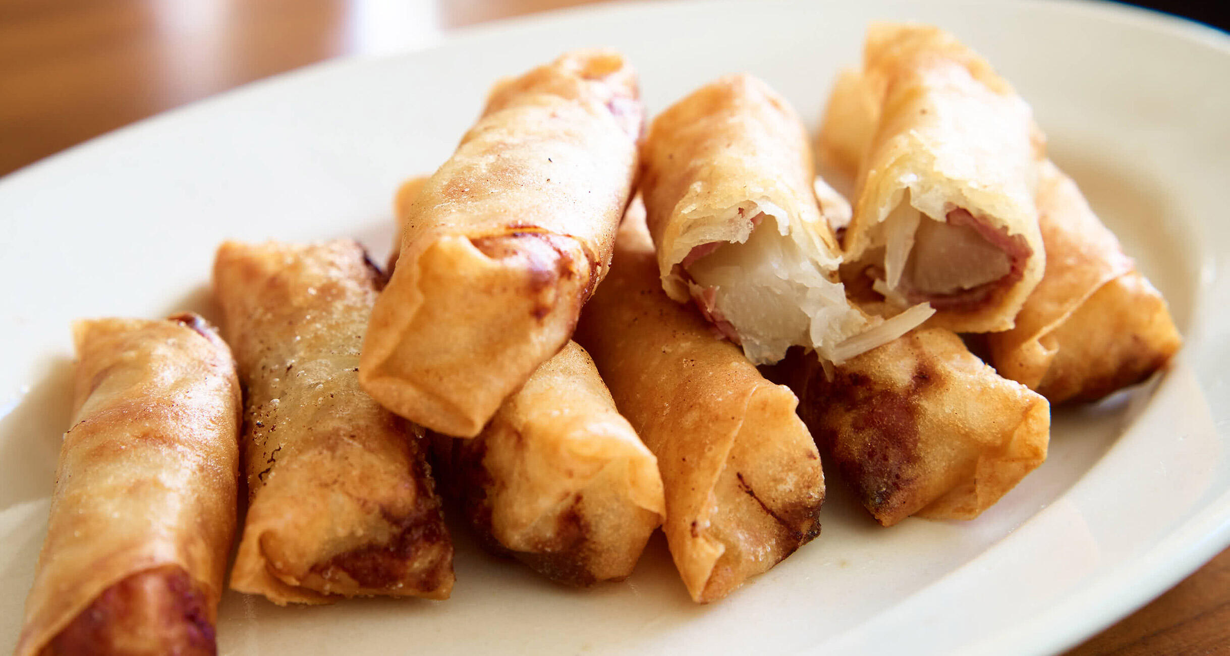 皮を半分にしてつくる、細くてかわいらしい春巻き。温かいうちに食べると、うどの土の香りと生ハムの熟成香がより際立ちます。生ハムの塩気で味つけが不要なのも気軽。
