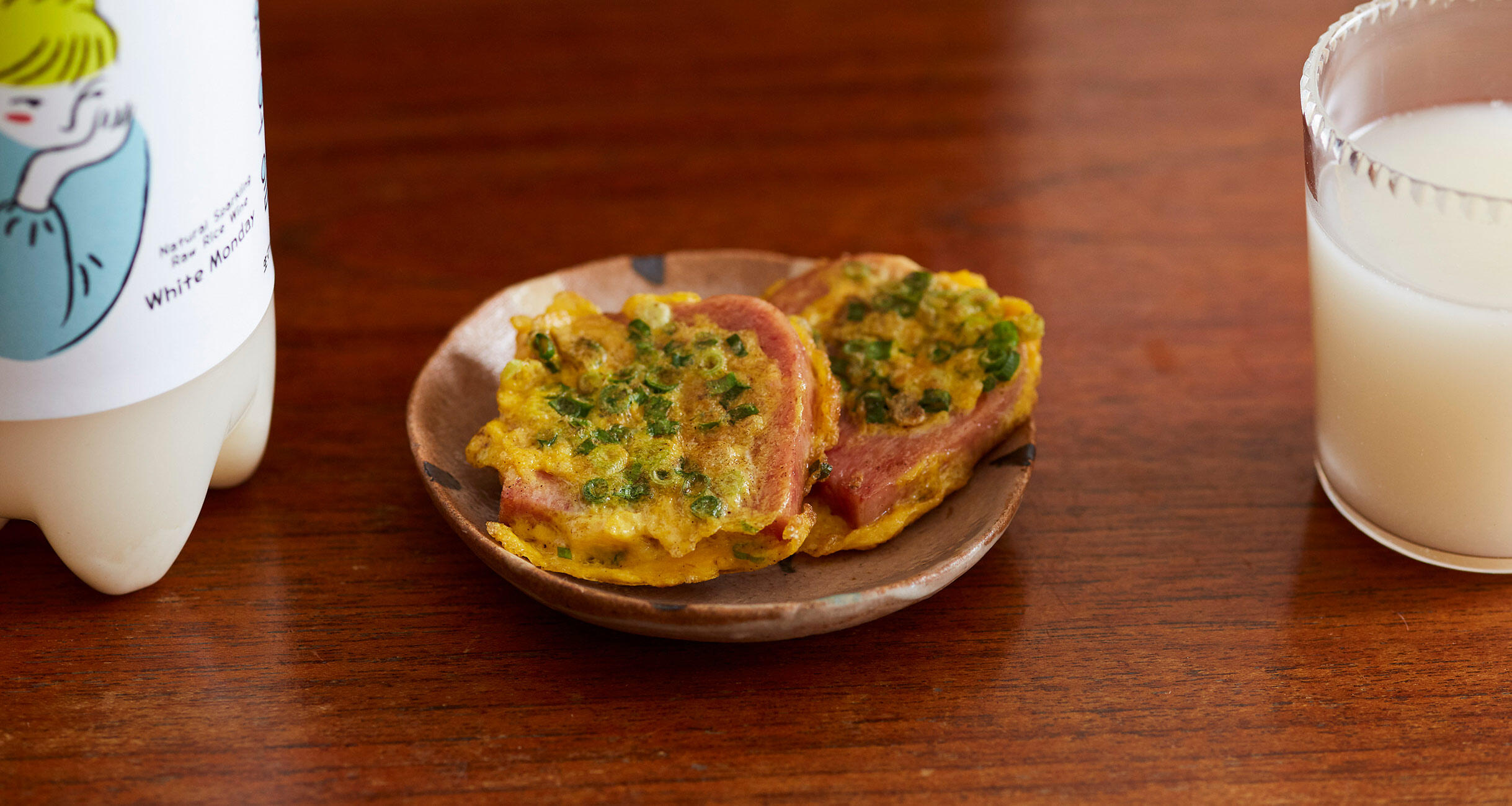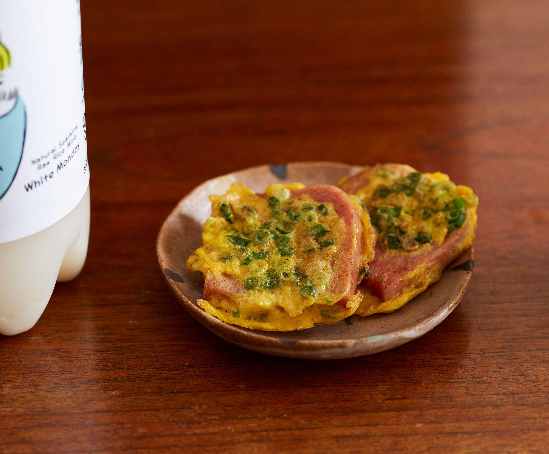衣をからめて焼いたもののことをジョンと呼ぶ。ランチョンミートと卵、家にストックしてあるもので一口分つくれるのがうれしい。