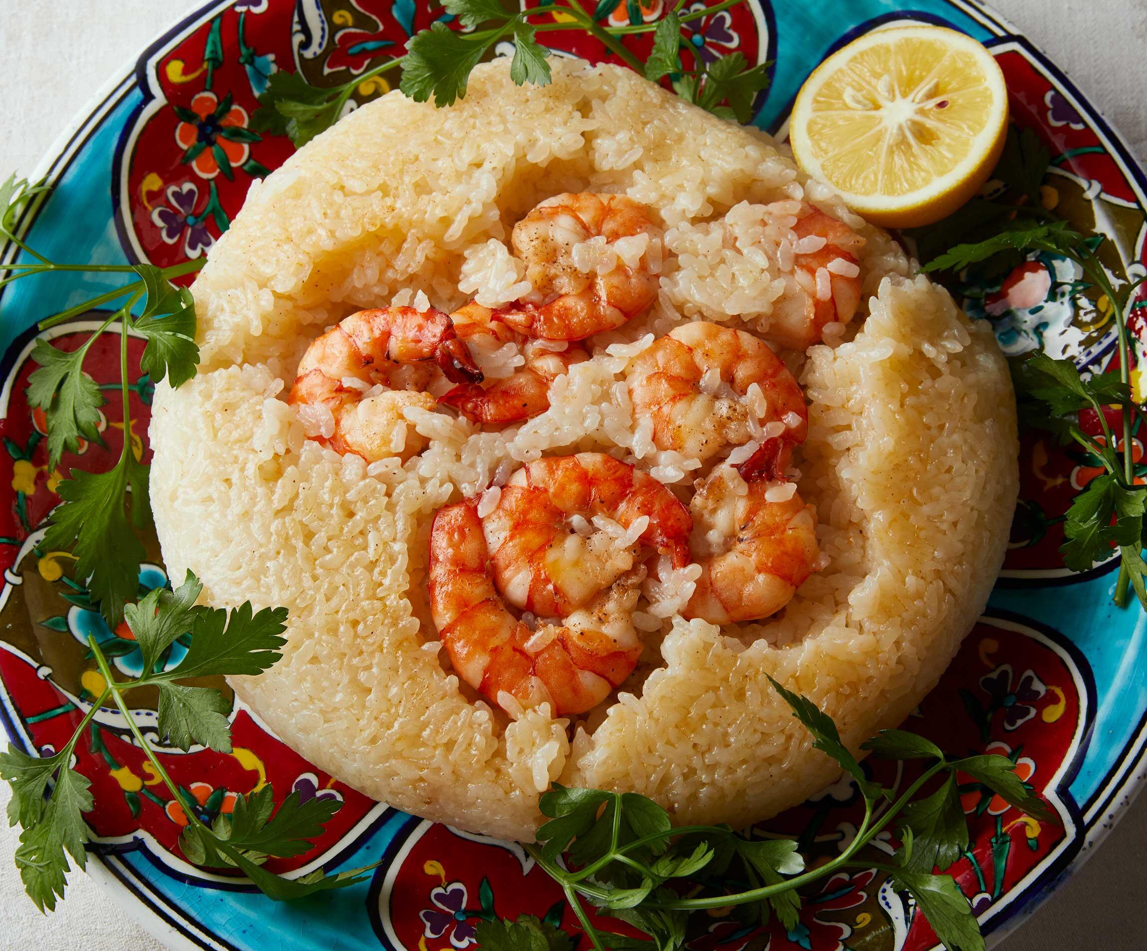 マクルーベ(アラビア語でひっくり返すという意味)という、中東地域で親しまれるご馳走ピラフ。なすや肉、いわしなどを敷き詰めたものが知られていますが、米にじんわりと甲殻類のだしが行き渡った海老版も人気です。