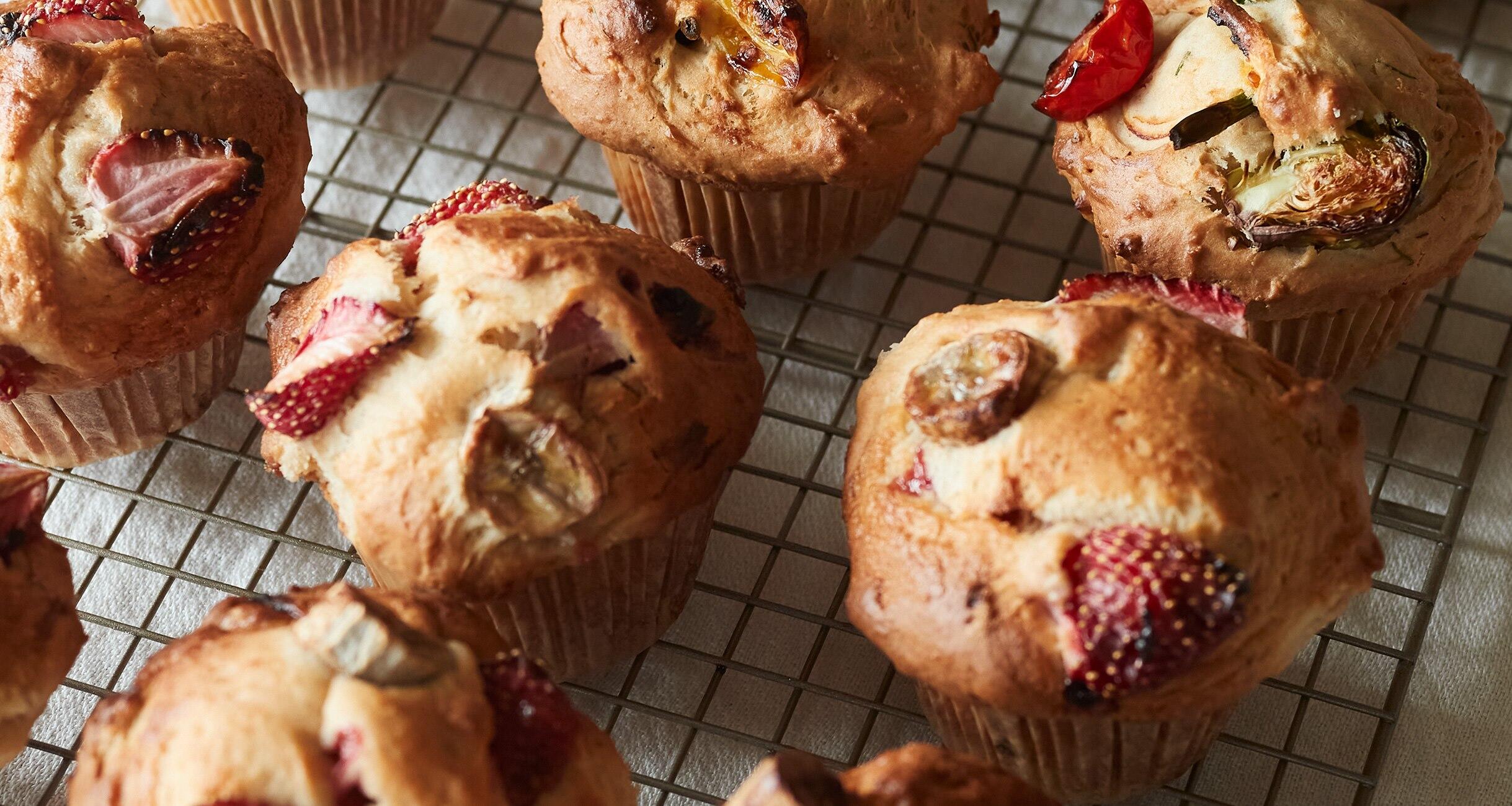 豆腐と豆乳入りのマフィン生地はなめらかで、次の日もしっとり。いちごとバナナなど相性の良いフルーツの自然な甘味で楽しみましょう。