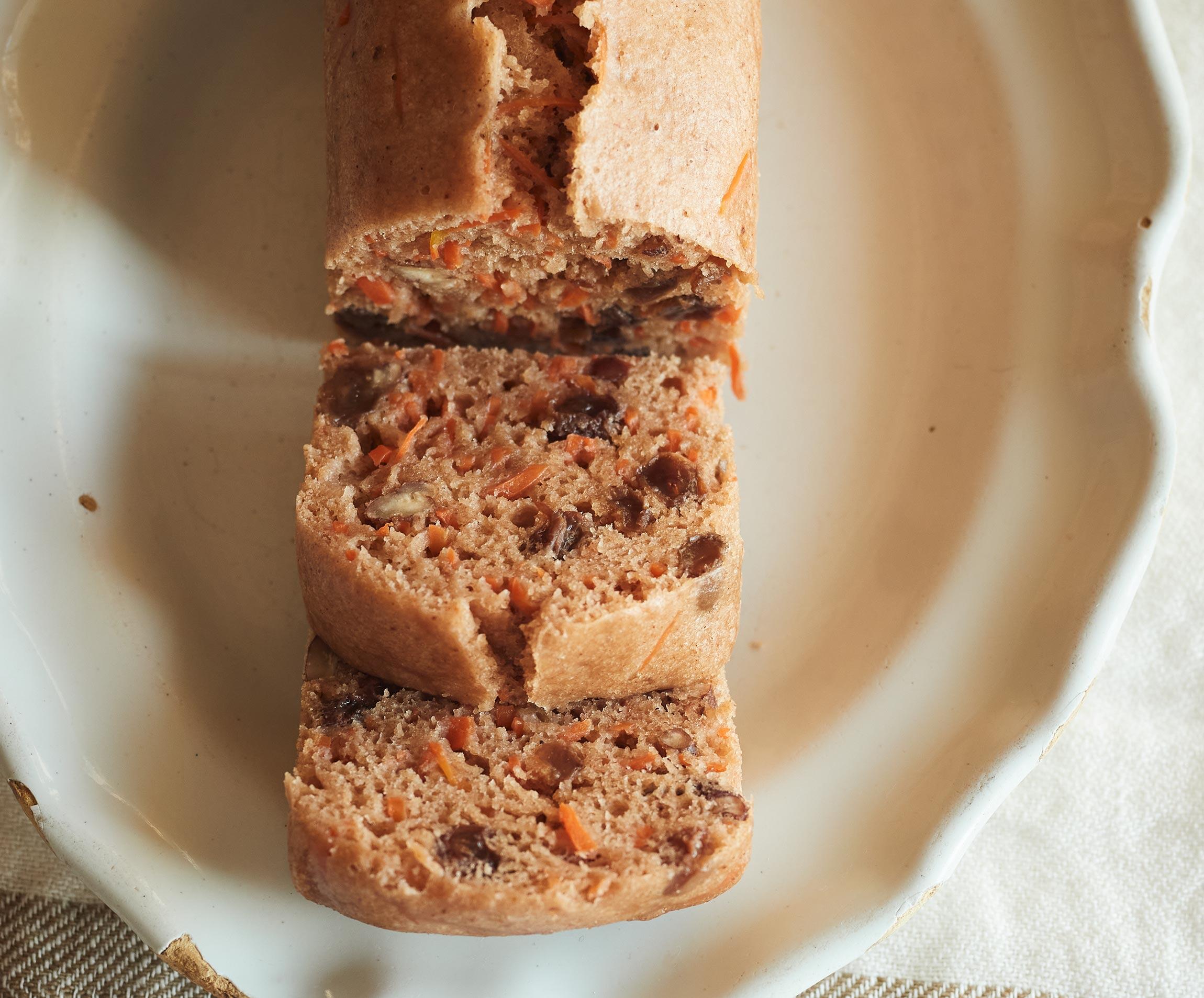 蒸しケーキは今井さんの十八番。ここでは新にんじんとレーズン、ピーカンナッツを入れた生地を、パウンド型に入れてふんわりと蒸し上げます。スパイスも効いた、大人のパウンドケーキです。奥行きのあるスパイスの香りが生地のおいしさを引き立てます。ヴィーガン菓子・料理研究家の今井ようこさんに食べごたえ十分、なのに体が重くならないおやつの新定番を教えてもらいました。