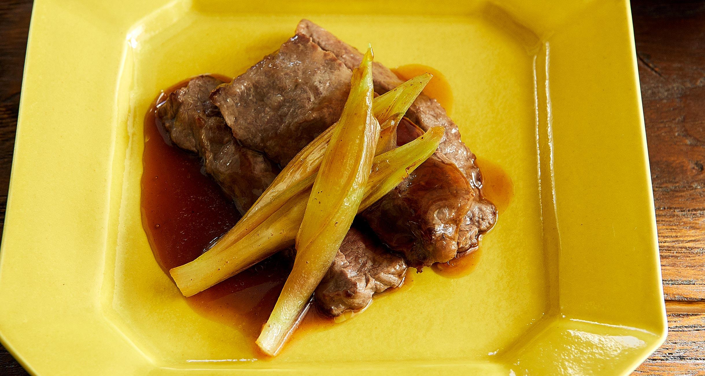黒酢、みりん、オイスターソースのコクを牛肉とみょうがにからめて。