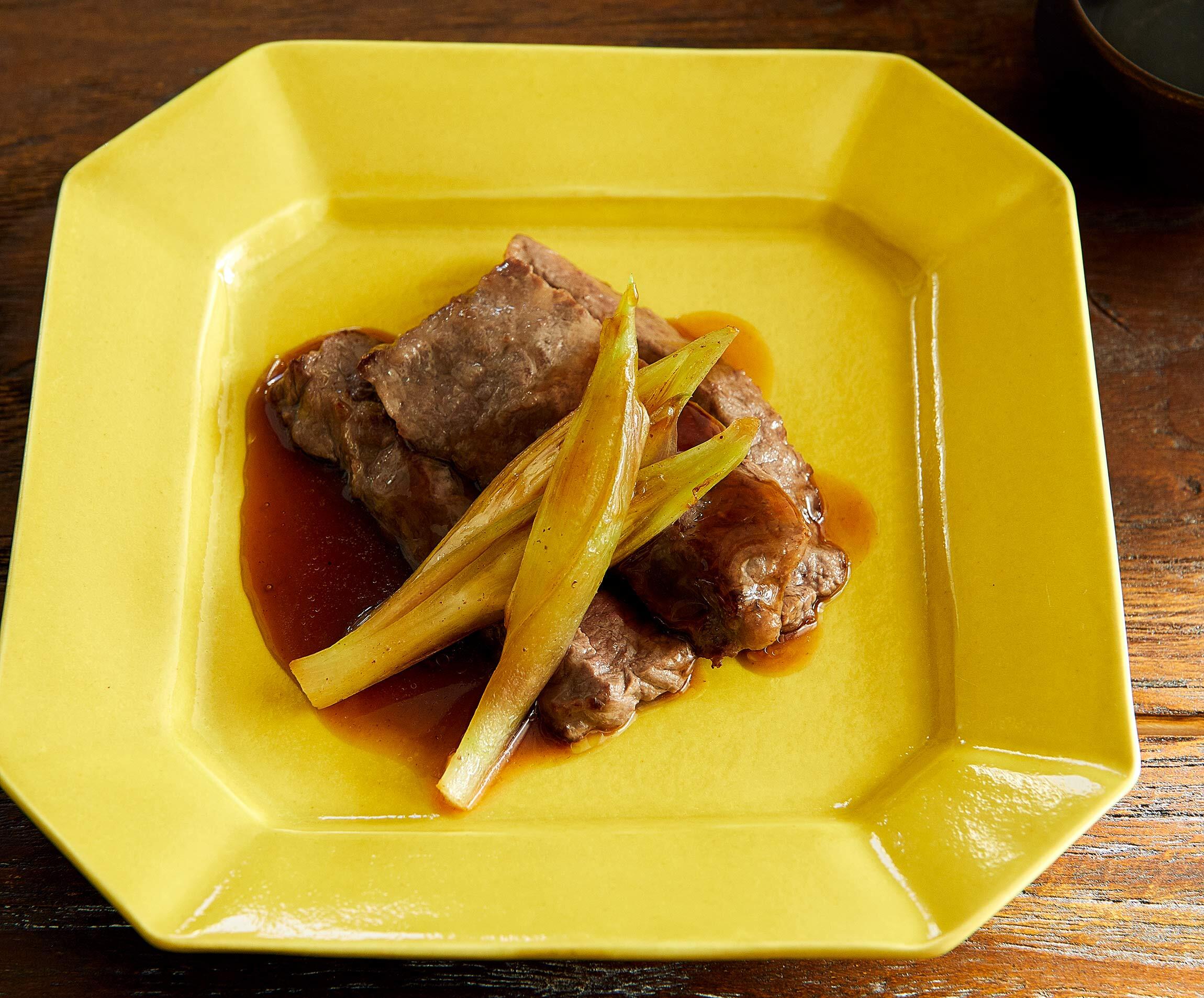 Aをよく混ぜ、2のフライパンに入れて強めの中火にかける。肉汁をこそげるように混ぜながら軽く煮詰め、透き通ってとろみがついたら牛肉とみょうがにかける。