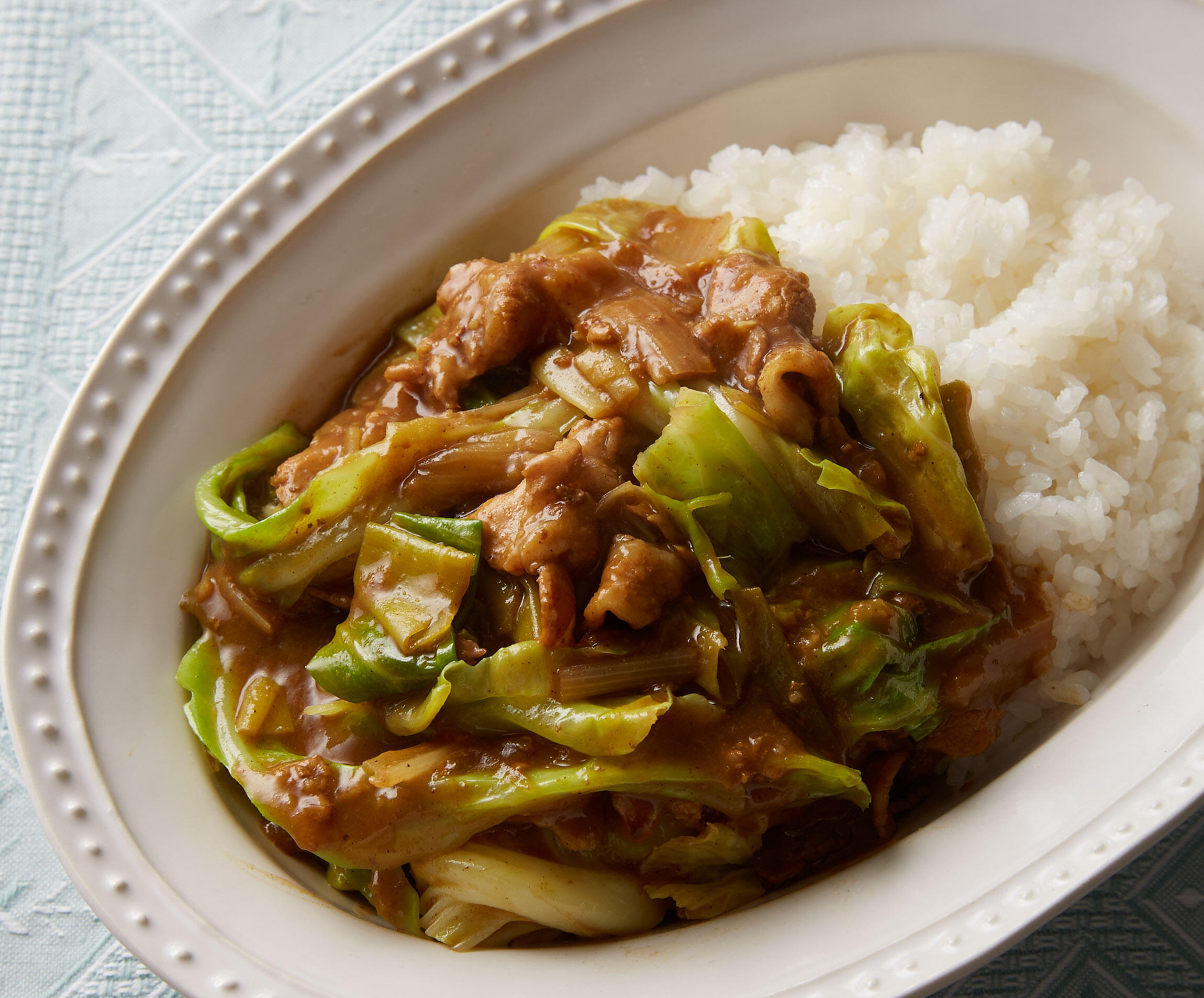 最後に加えた春キャベツのやわらかさ、シャキシャキ感を楽しむ豚バラ肉でつくる生姜風味のおかずカレー。短時間でつくれるのがうれしい。白いご飯もいいけれど、カレーうどんにしてもおいしい!