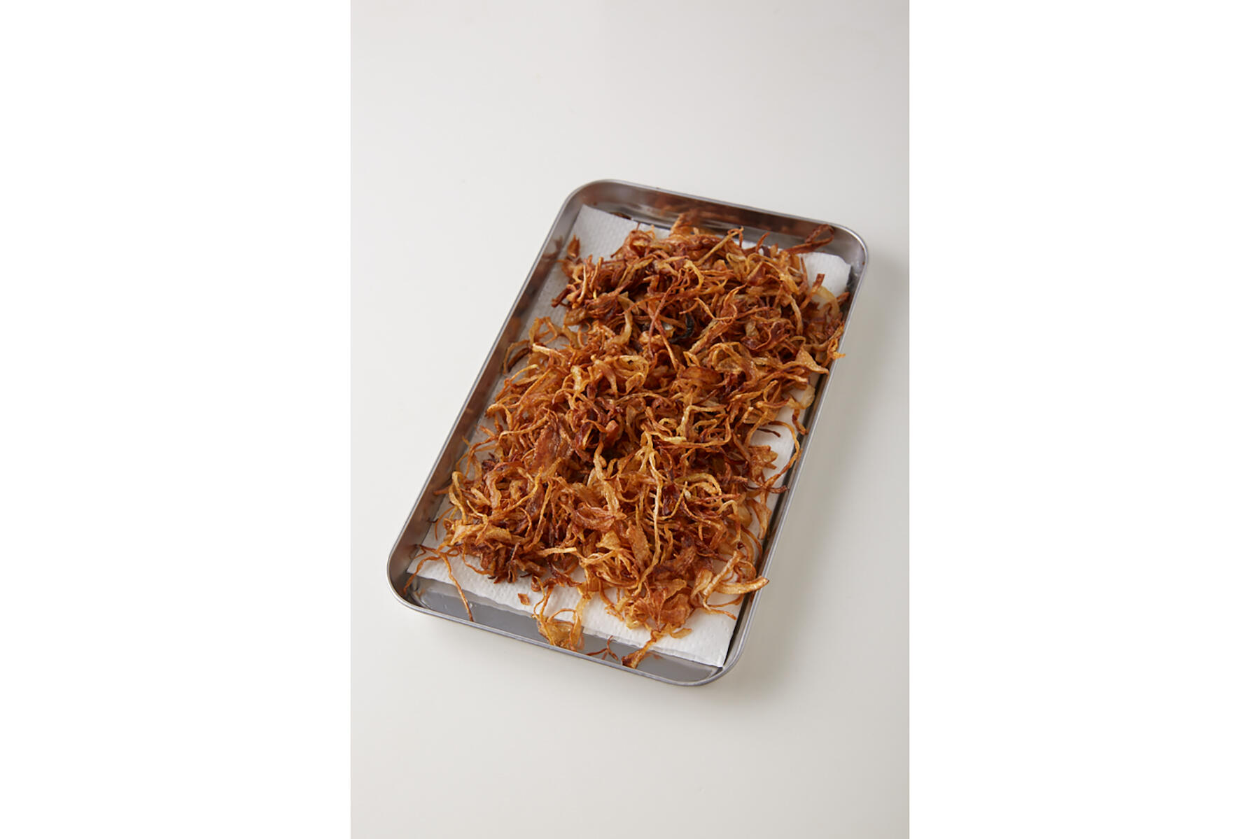 鍋に揚げ油を入れて中火にかけ、温度が上がったら玉ねぎを広げるように加える。一度に1/4量程度がベスト。箸で混ぜながら、全体にきつね色の揚げ色がつくまで揚げる(この時点で、少ししんなりしている状態。カリカリまで揚げると、余熱で火が入りすぎ、苦くなる)。しっかり油をきって、ペーパーを敷いたバットに広げておく。