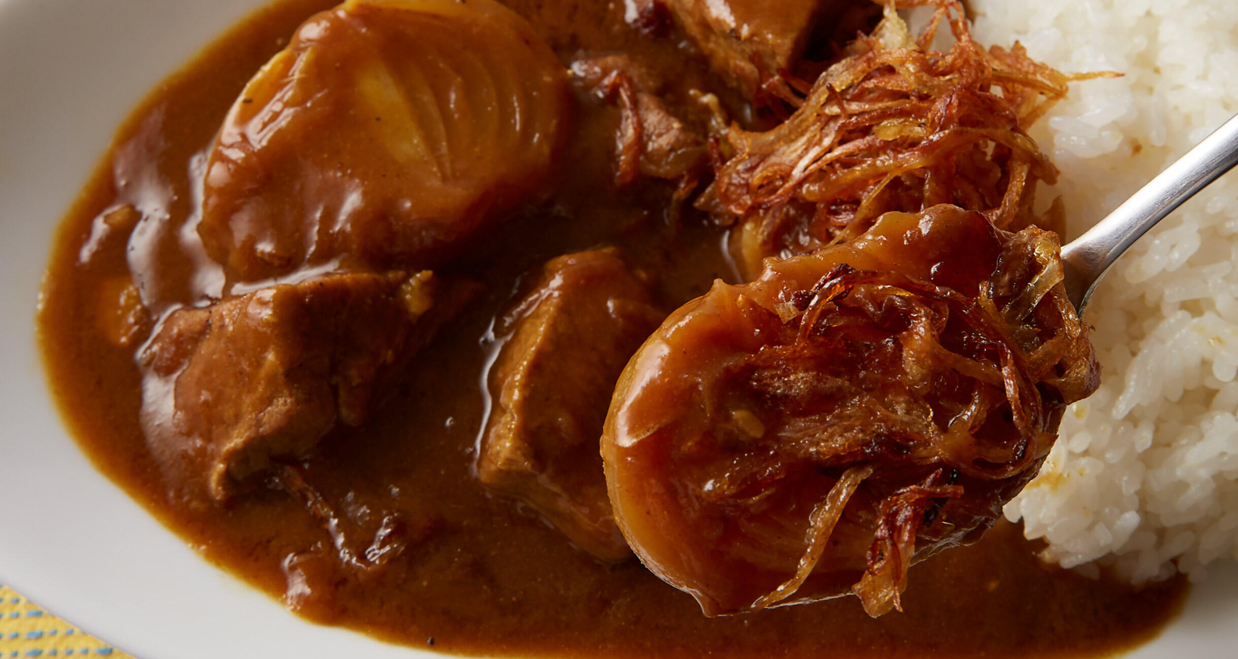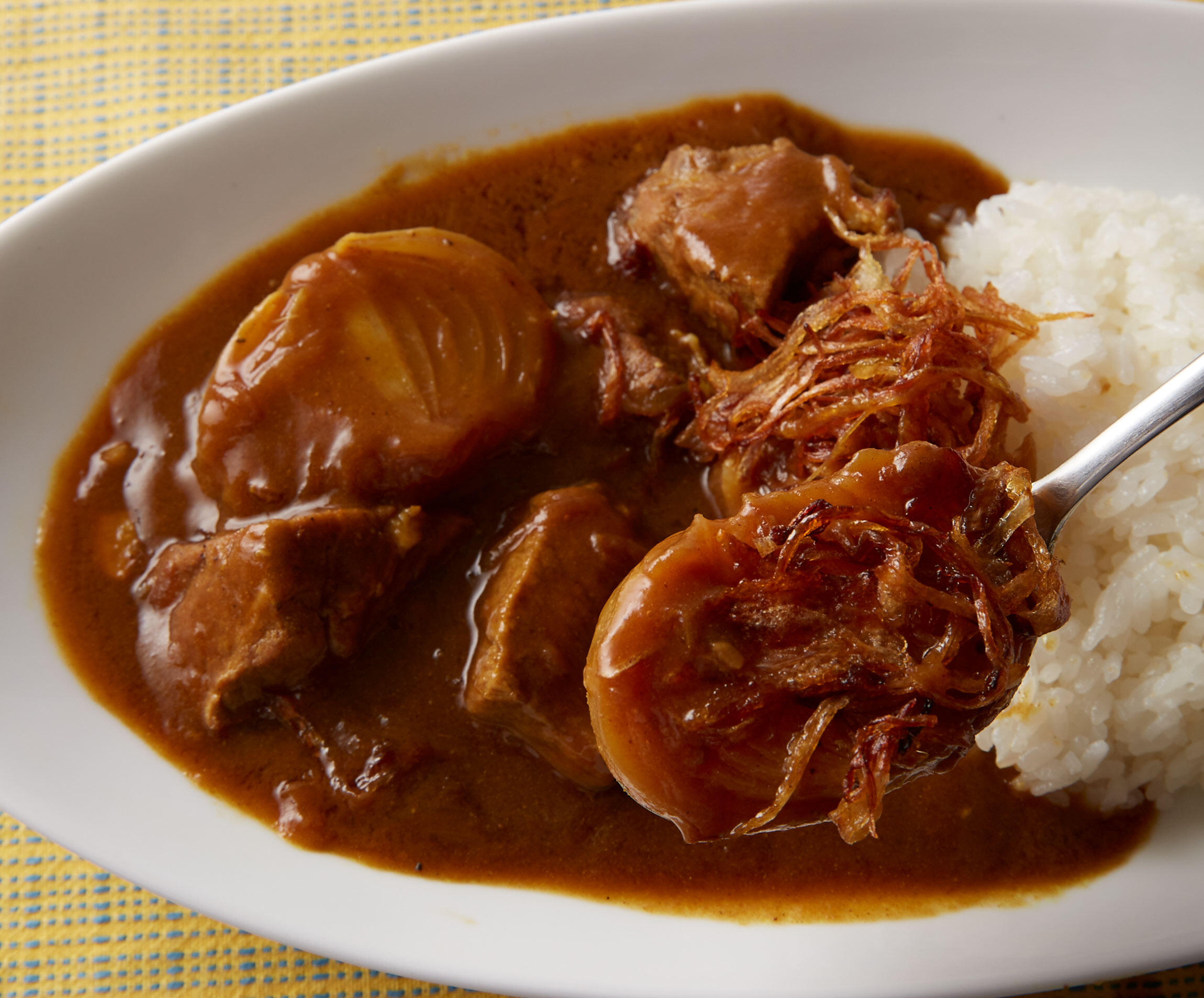 オニオンフライが深味をプラス。幾層もの玉ねぎの甘味にノックアウトすること間違いなし!いつものルウと材料で、家カレーを数段グレードアップさせるレシピを料理研究家の上田淳子さんに教わりました。
