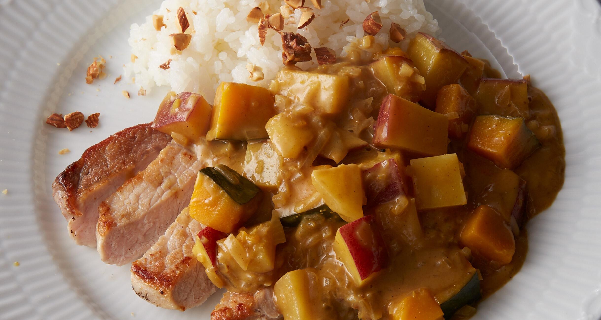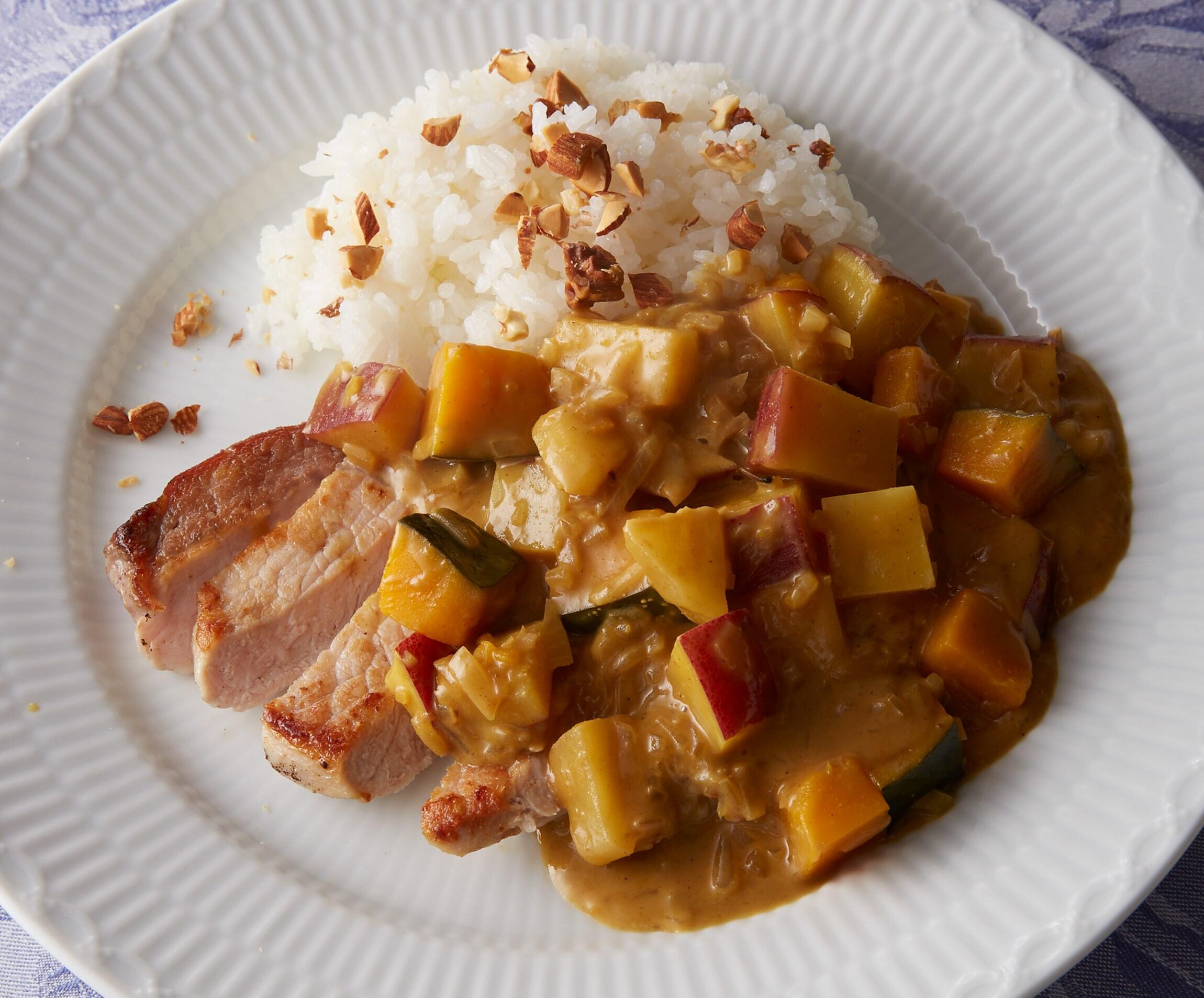 豚肉を食べやすい大きさに切って、ご飯を盛った器にのせカレーをかける。好みでご飯に刻んだミックスナッツを散らす。