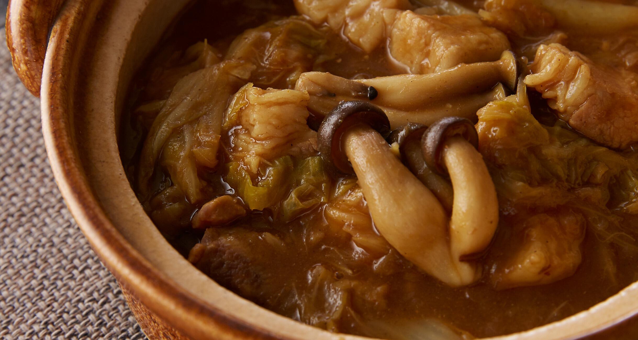 白菜の葉としめじを加えて、さっと混ぜ合わせ10分煮る。火を止めてカレールウを割り入れ、ルウが溶けたら全体を混ぜる。再度、弱火にかけ、とろみがつくまで5分ほど煮て、塩、胡椒で味をととのえる。