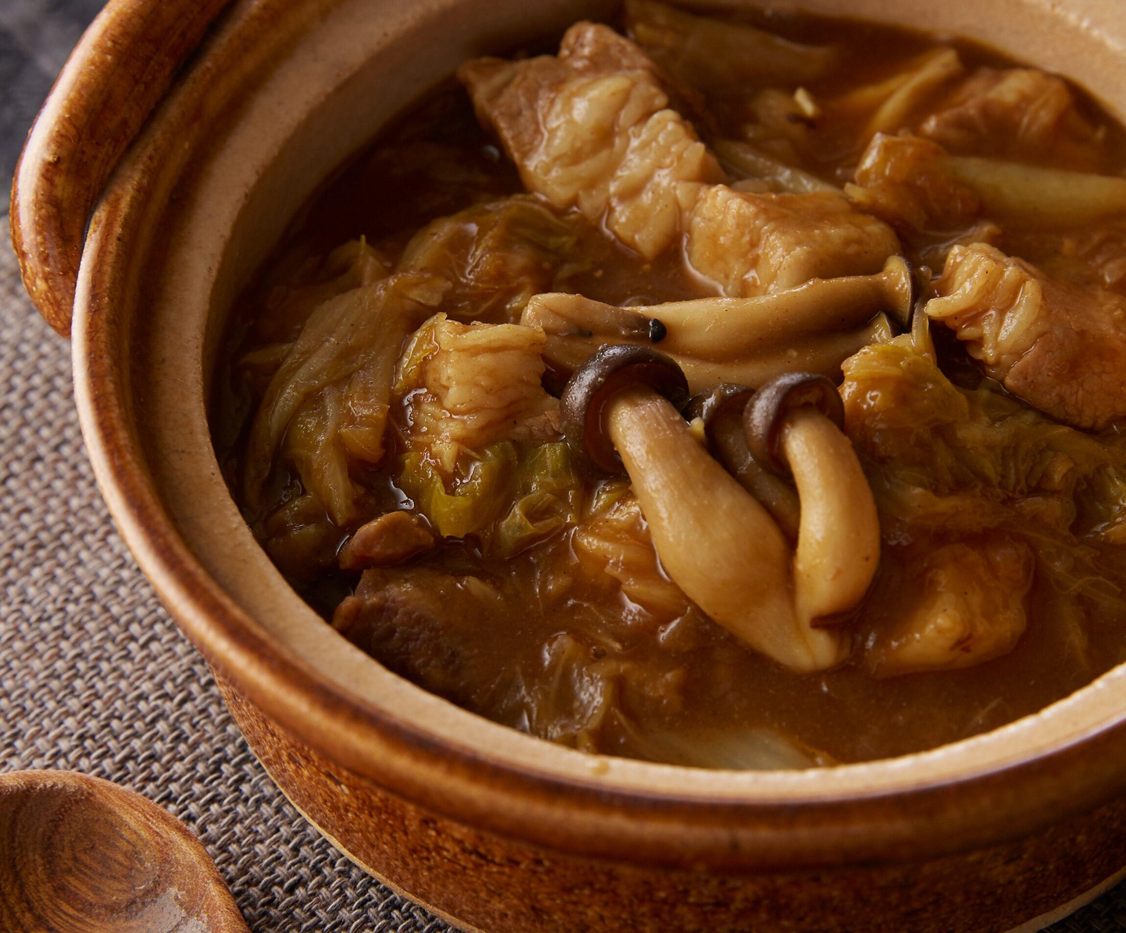 とろとろに甘く煮えた白菜と棒状に切った豚バラ肉が好相性。ルウに溶け出した白菜の旨味を存分に味わう和風カレー。鍋やシチューにも似た、ほっこりした温かさに包まれる。