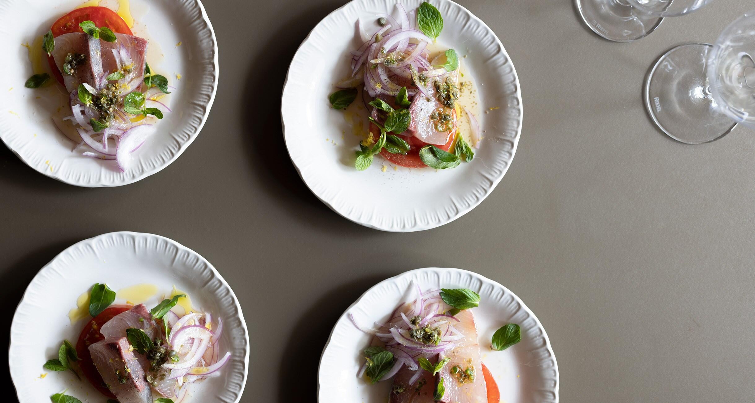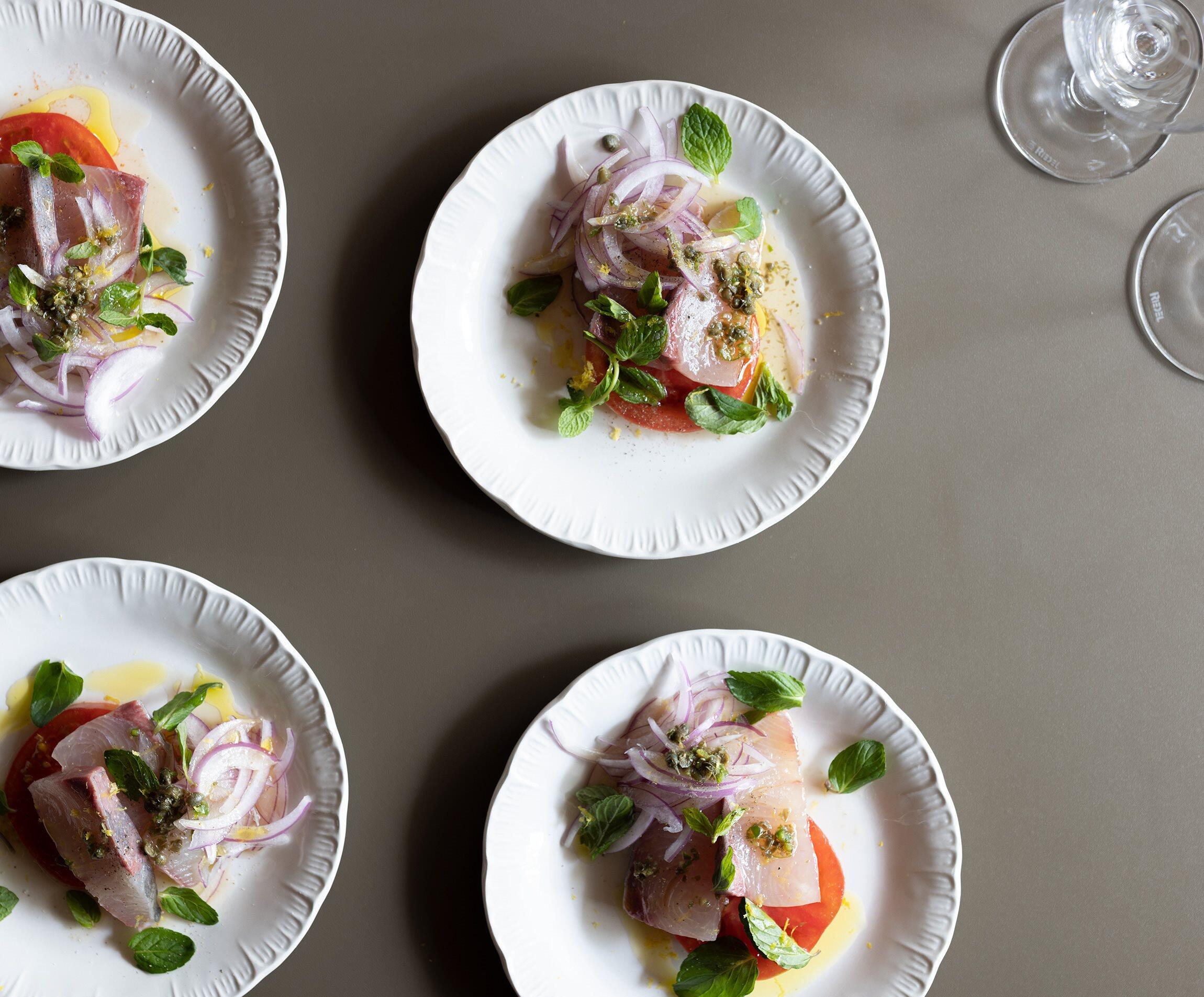 それぞれの器にトマト1枚をのせて塩少々をふり、刺身2切れをのせる。玉ねぎを添えてAのソースをかけ、オリーブオイル少々と黒胡椒少々(ともに分量外)をふる。ミントを散らす。