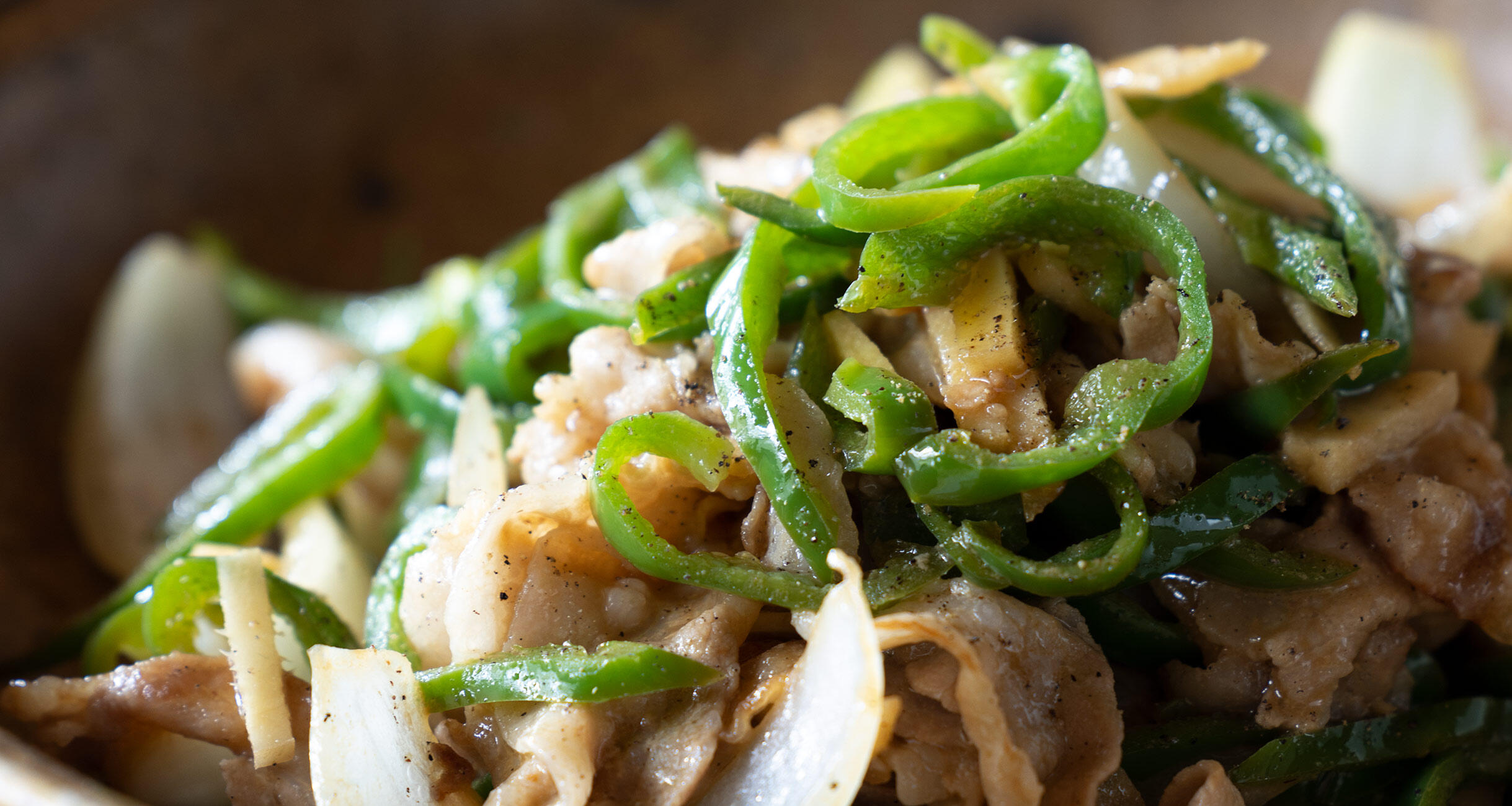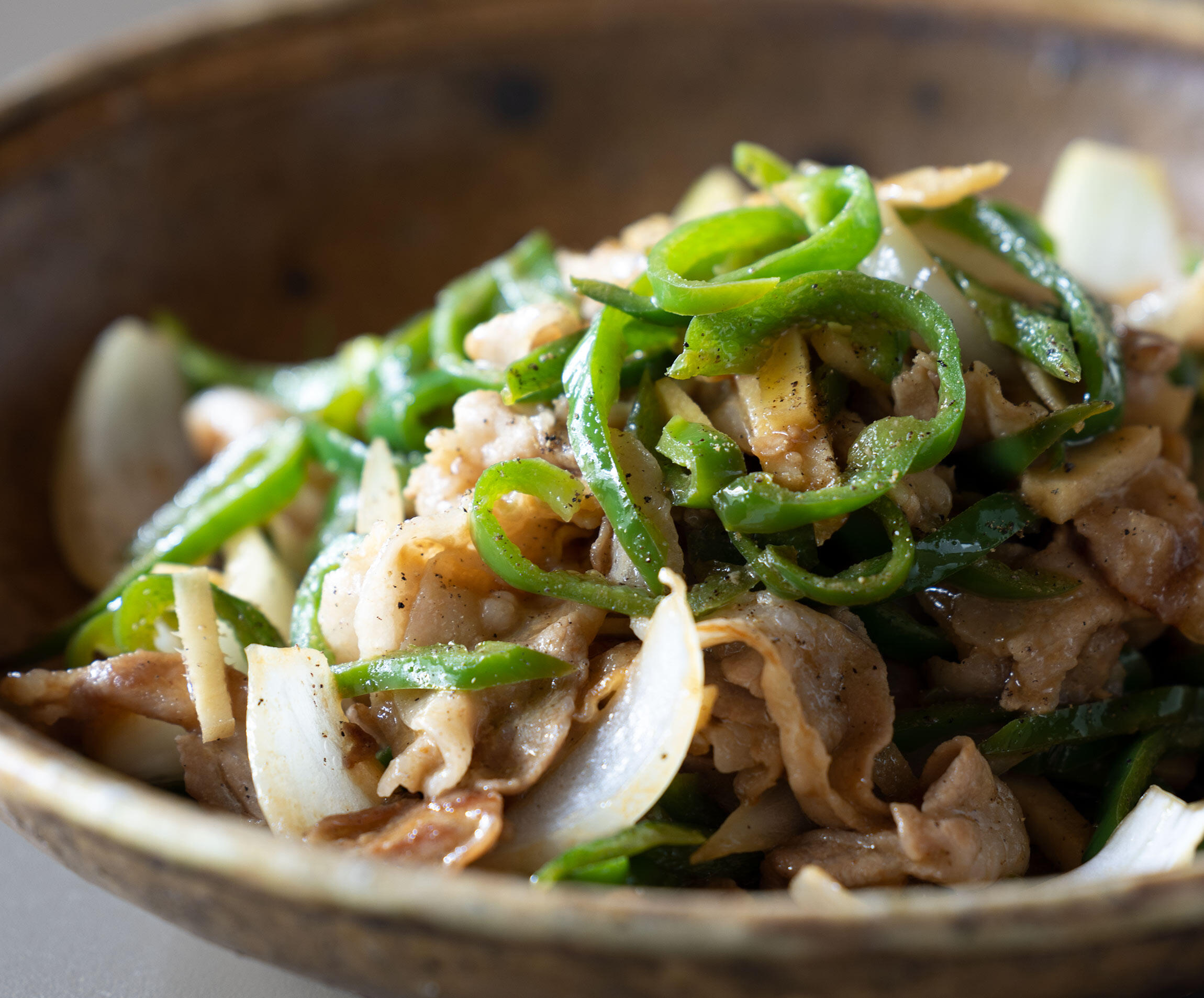 ピーマン、玉ねぎ、生姜を加えてさっと炒め、Aを加えて炒め合わせる。器に盛り、胡椒をふる。