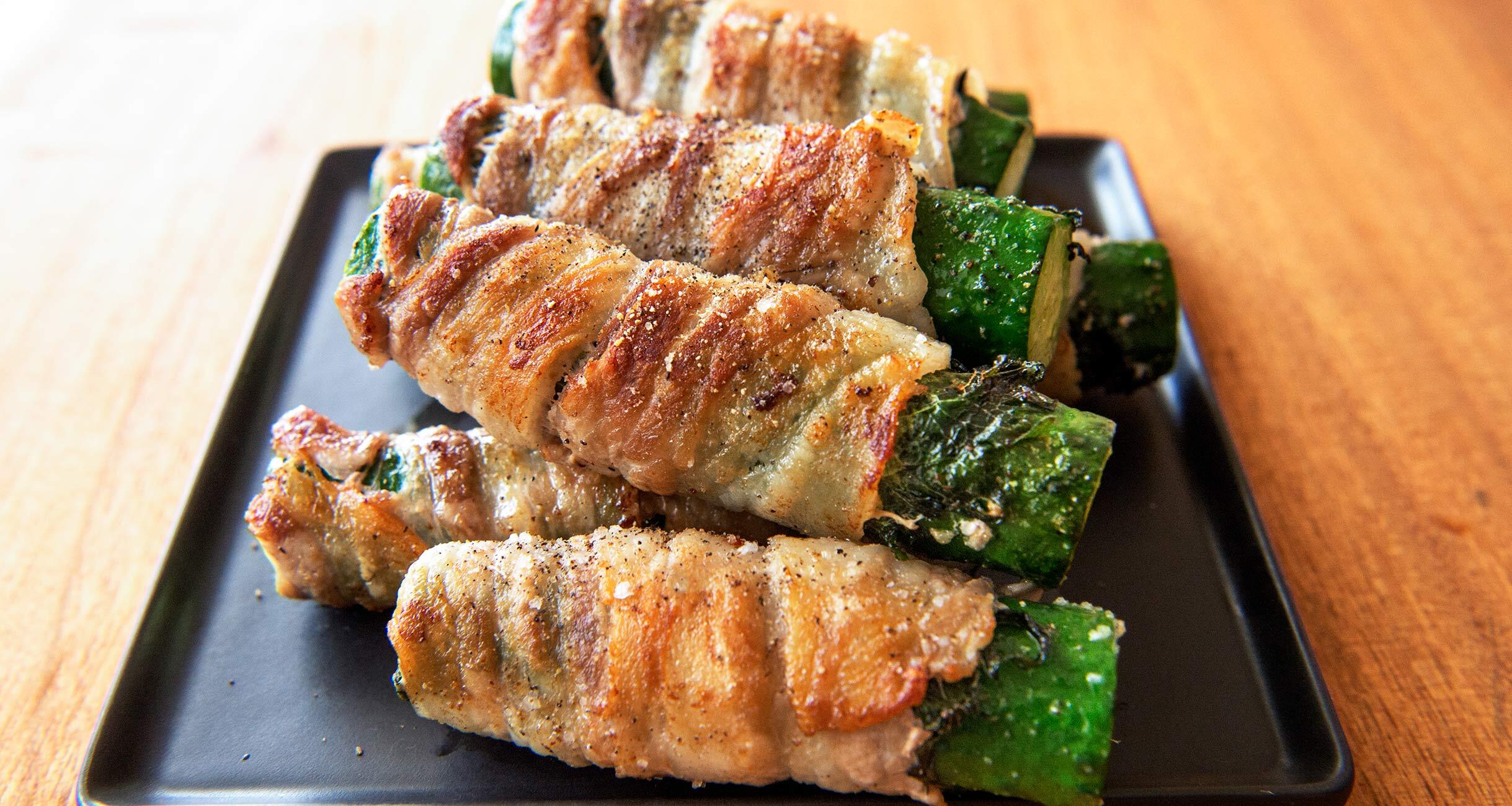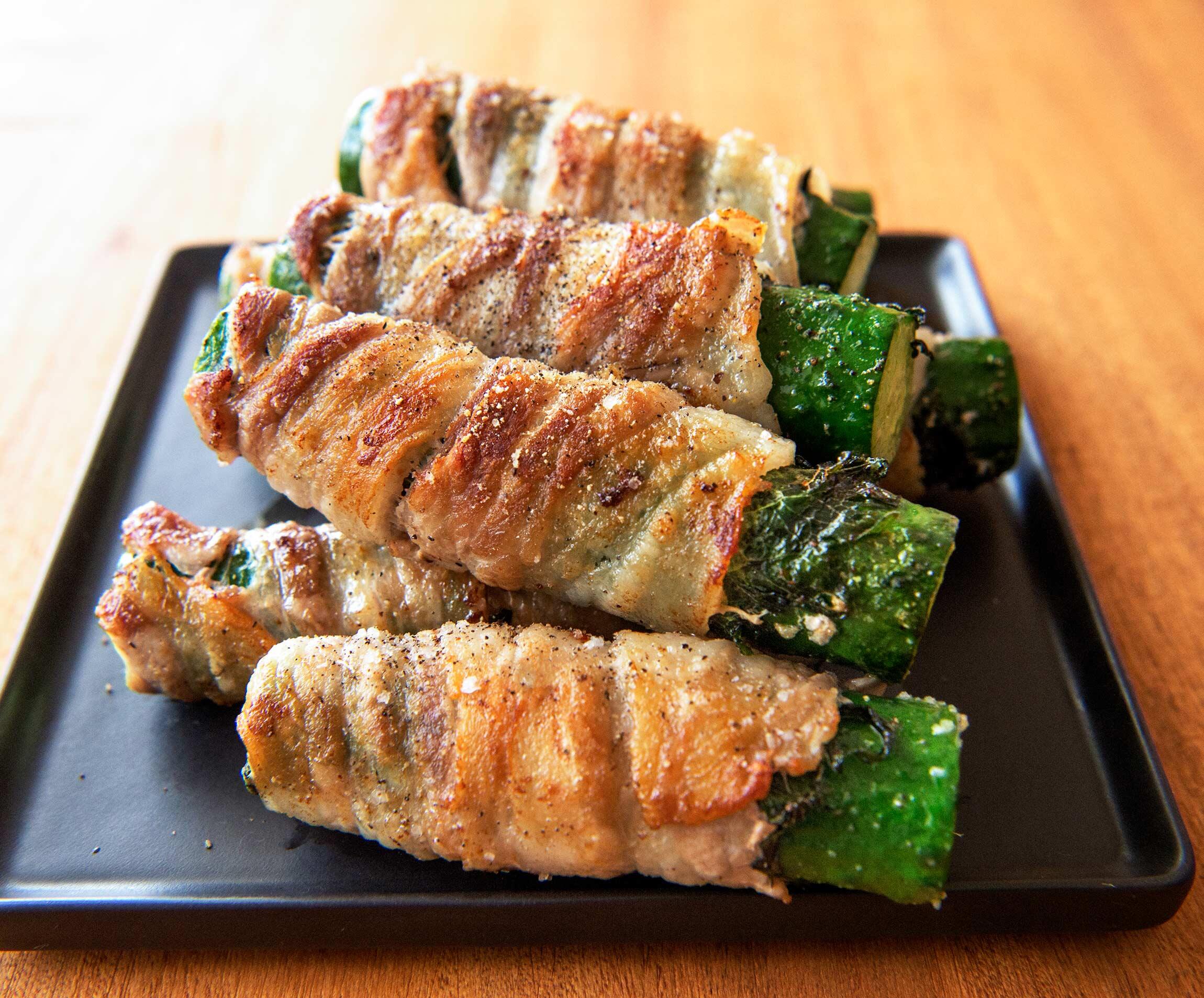 きゅうりに青じそを巻き、豚肉を巻きつける。