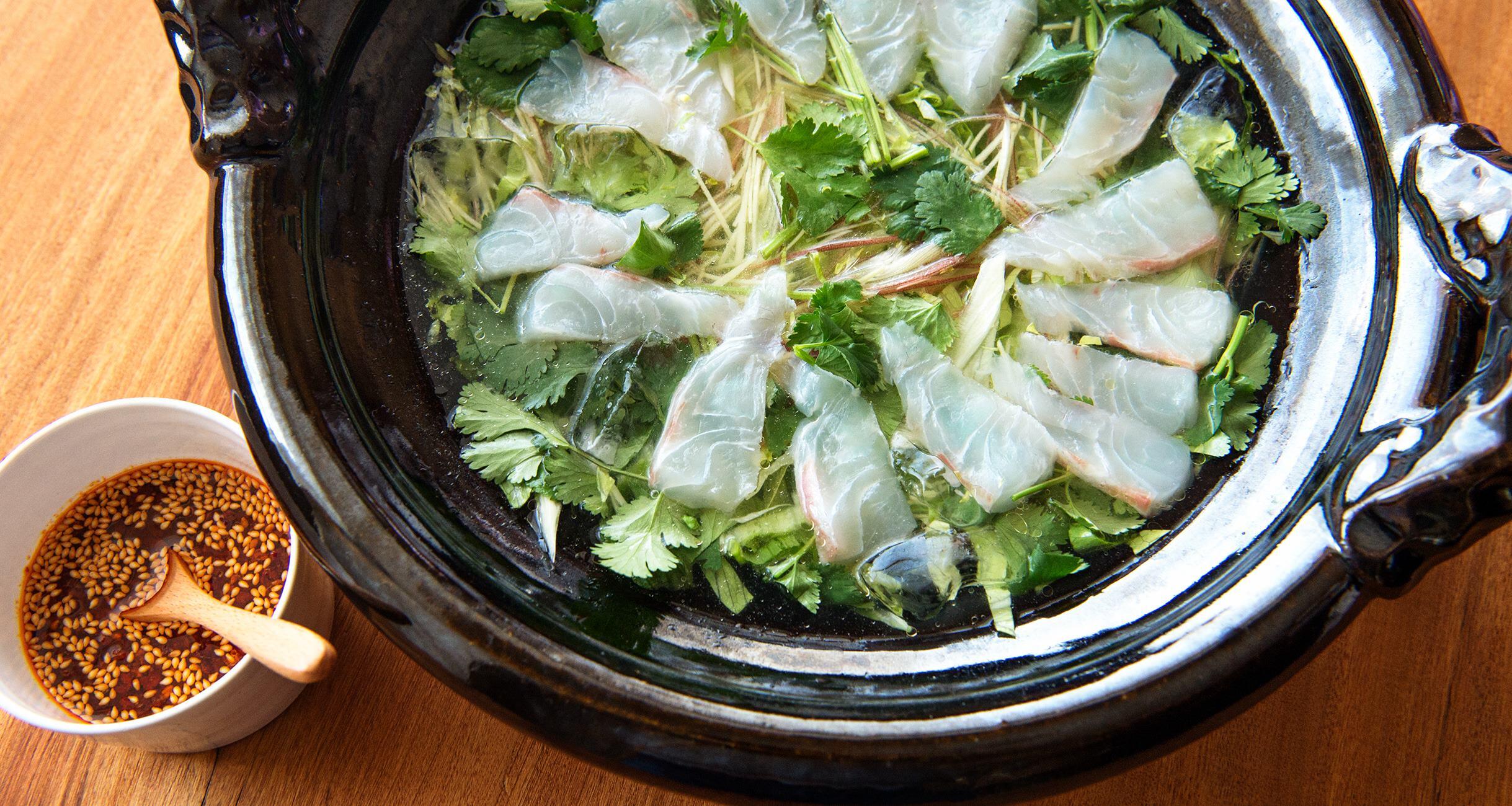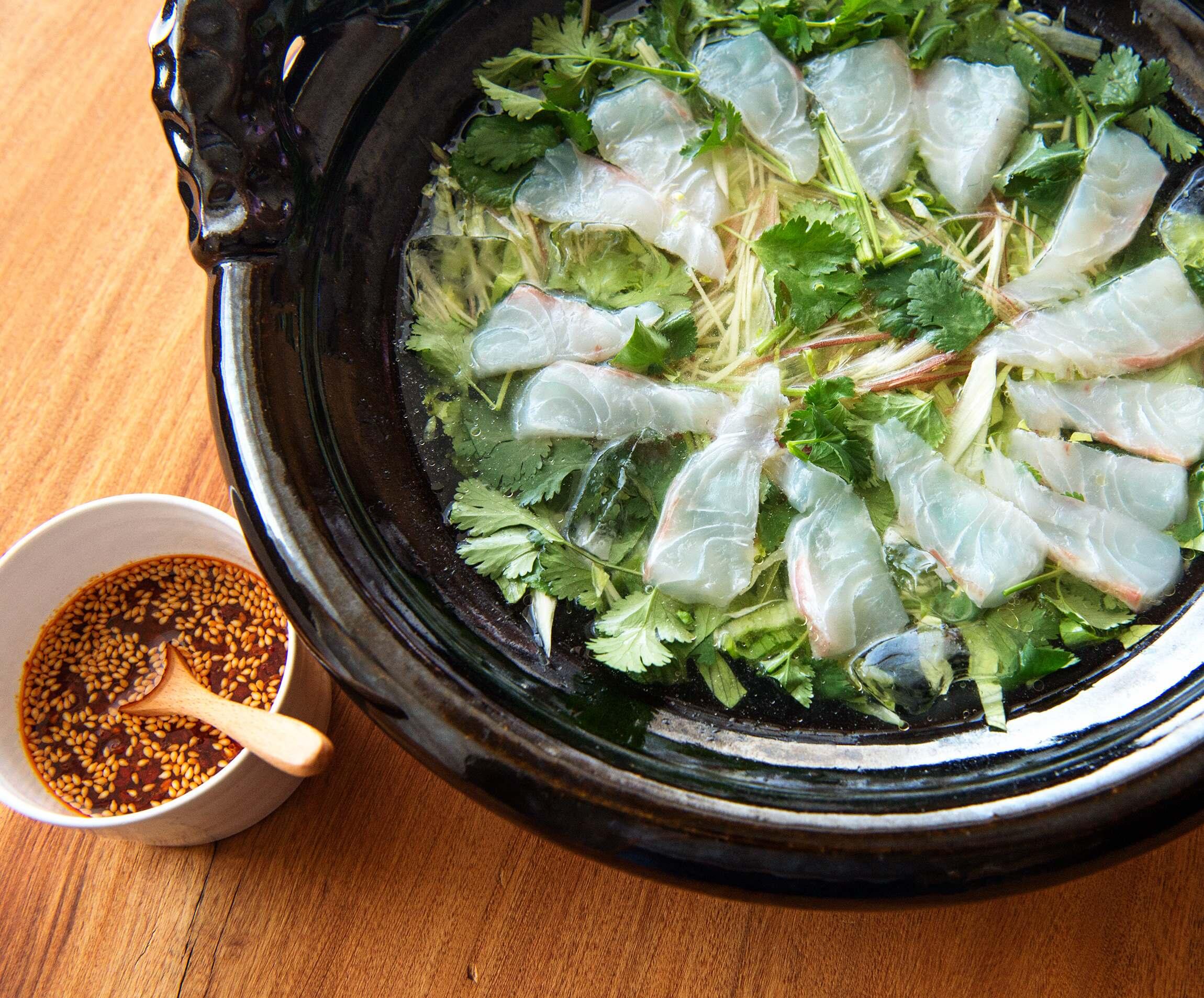 土鍋に1のスープを入れ、2、白身魚を氷とともに入れて浸す。スープごと器に盛り、麻辣だれをかけて食べる(たれは辛いので量を加減して)。