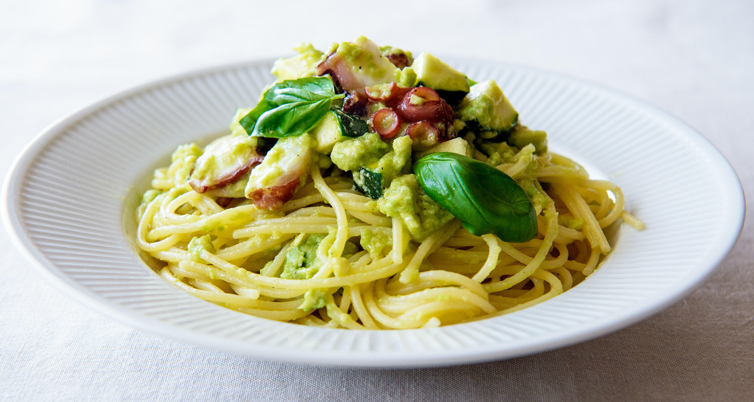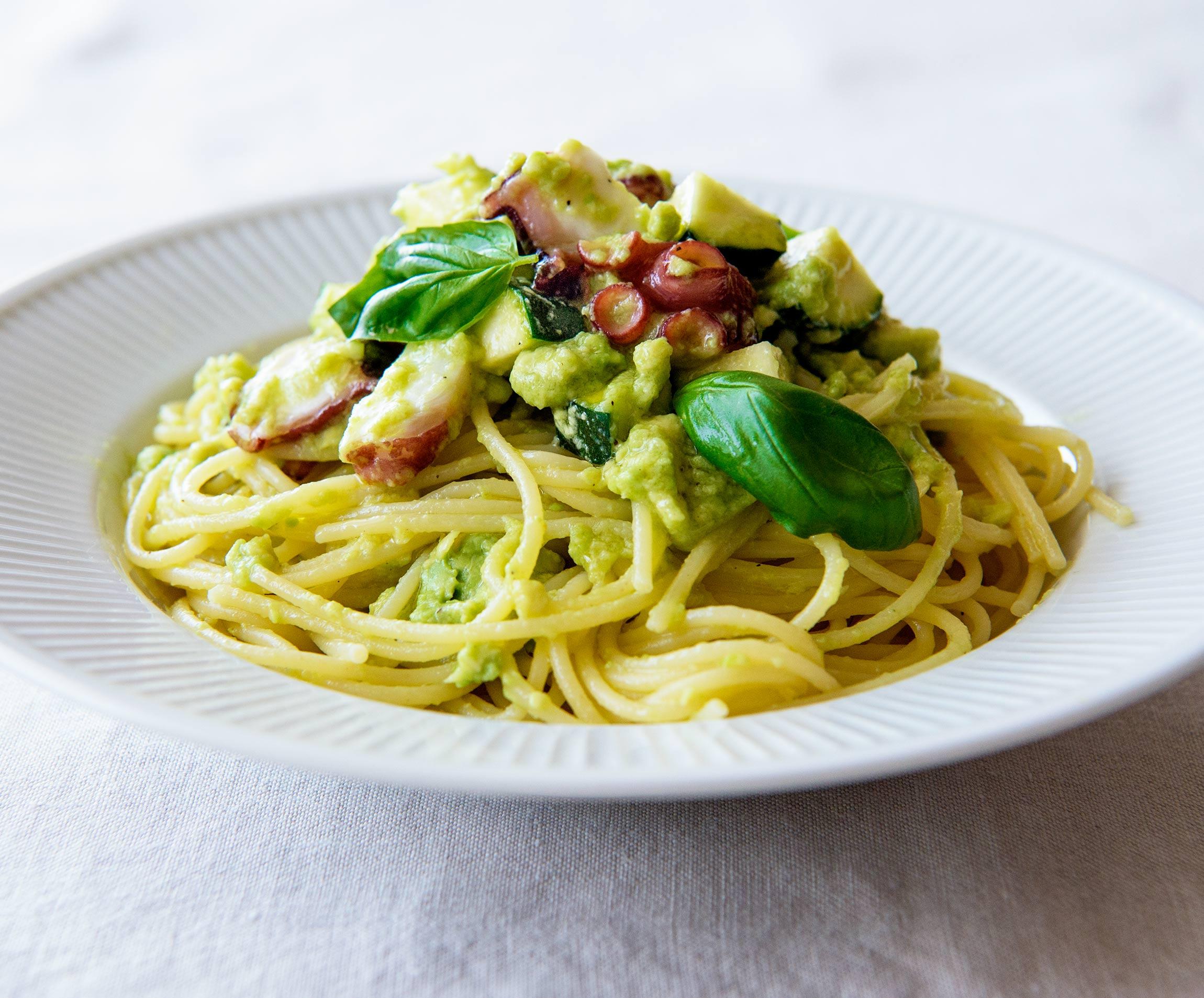 つぶしたアボカドがソース代わり。たことズッキーニの食感が楽しいスパゲッティです。手間を省くための知恵を駆使した納得のおかずを、料理研究家の井原裕子さんに教わりました。