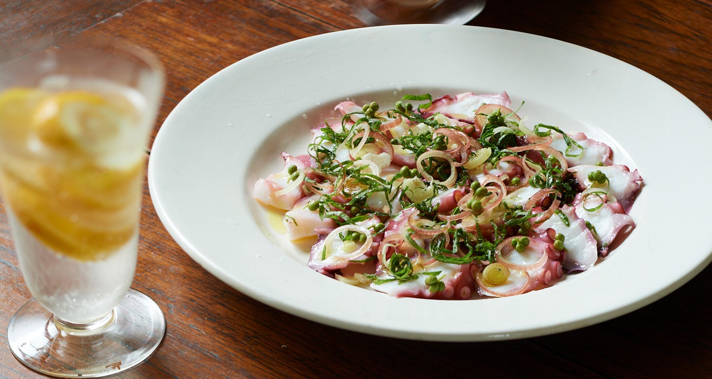 器にたこを並べ、オリーブオイル、レモン汁を回しかけ、塩をふり、みょうが、青じそ、実山椒を散らす。