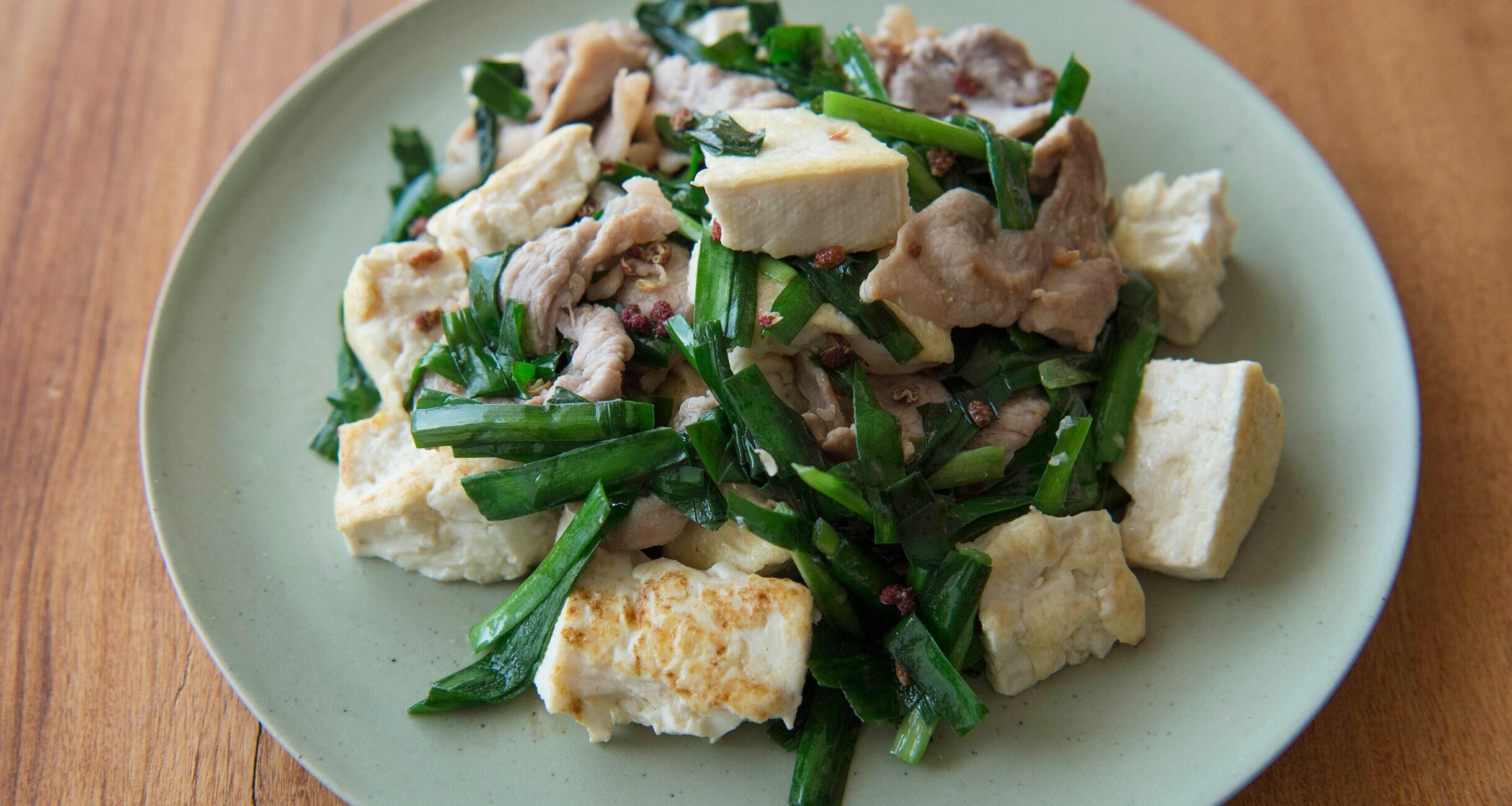 フライパンに胡麻油を中火で熱し、豆腐を崩しながら入れてこんがりと焼き、裏に返して端に寄せ、豚肉を加えて炒める。肉の色が変わったら調味料を入れて全体を混ぜ、にらも加えてさっと炒める。