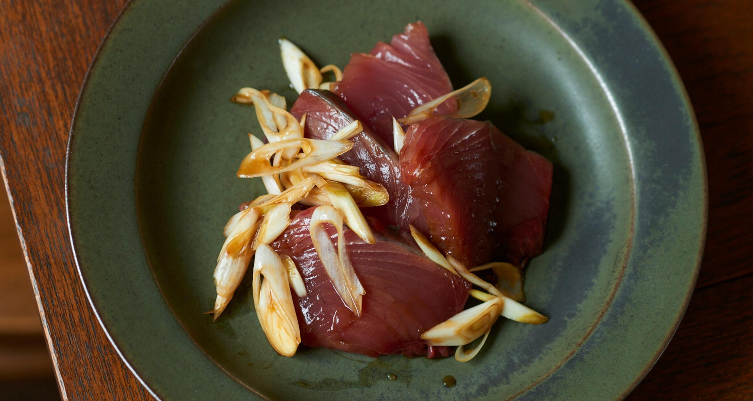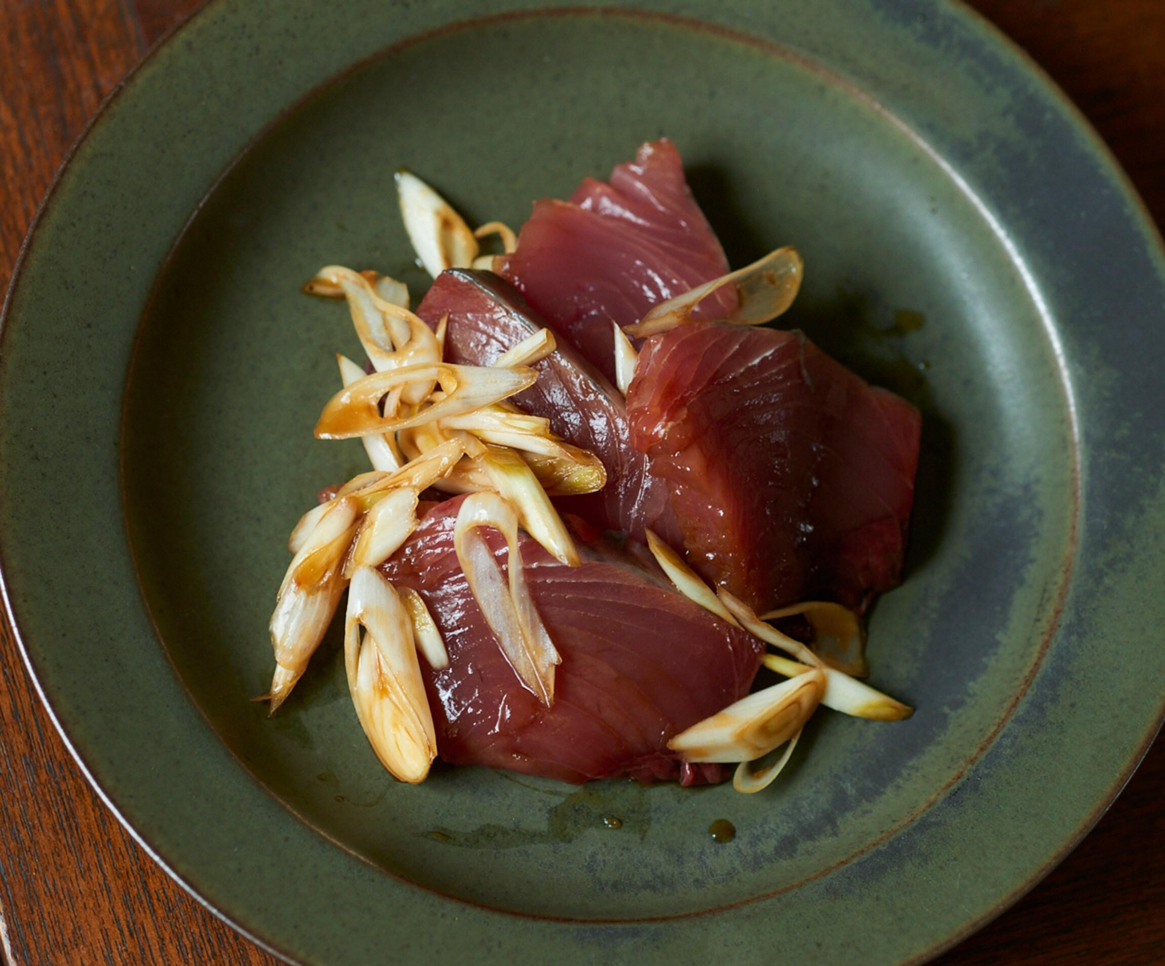 かつおといえばにんにくや生姜が定番ですが、エシャレットもお薦め。醤油と合わせると甘味も出て、かつおの旨味とぴったり。生臭さも一気に解消。