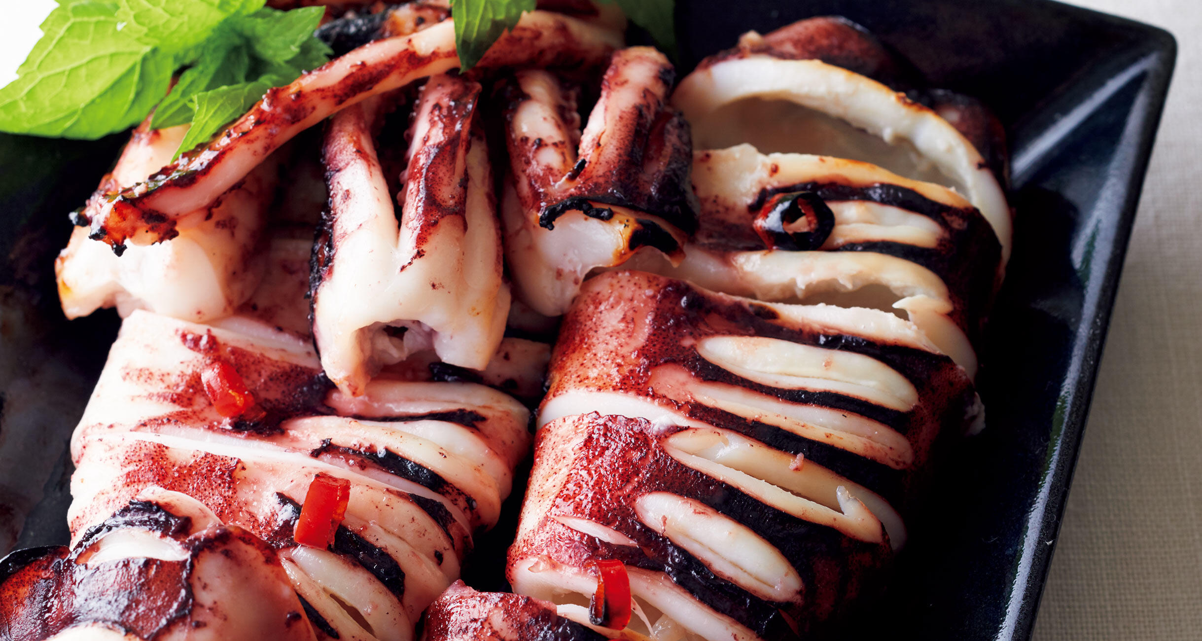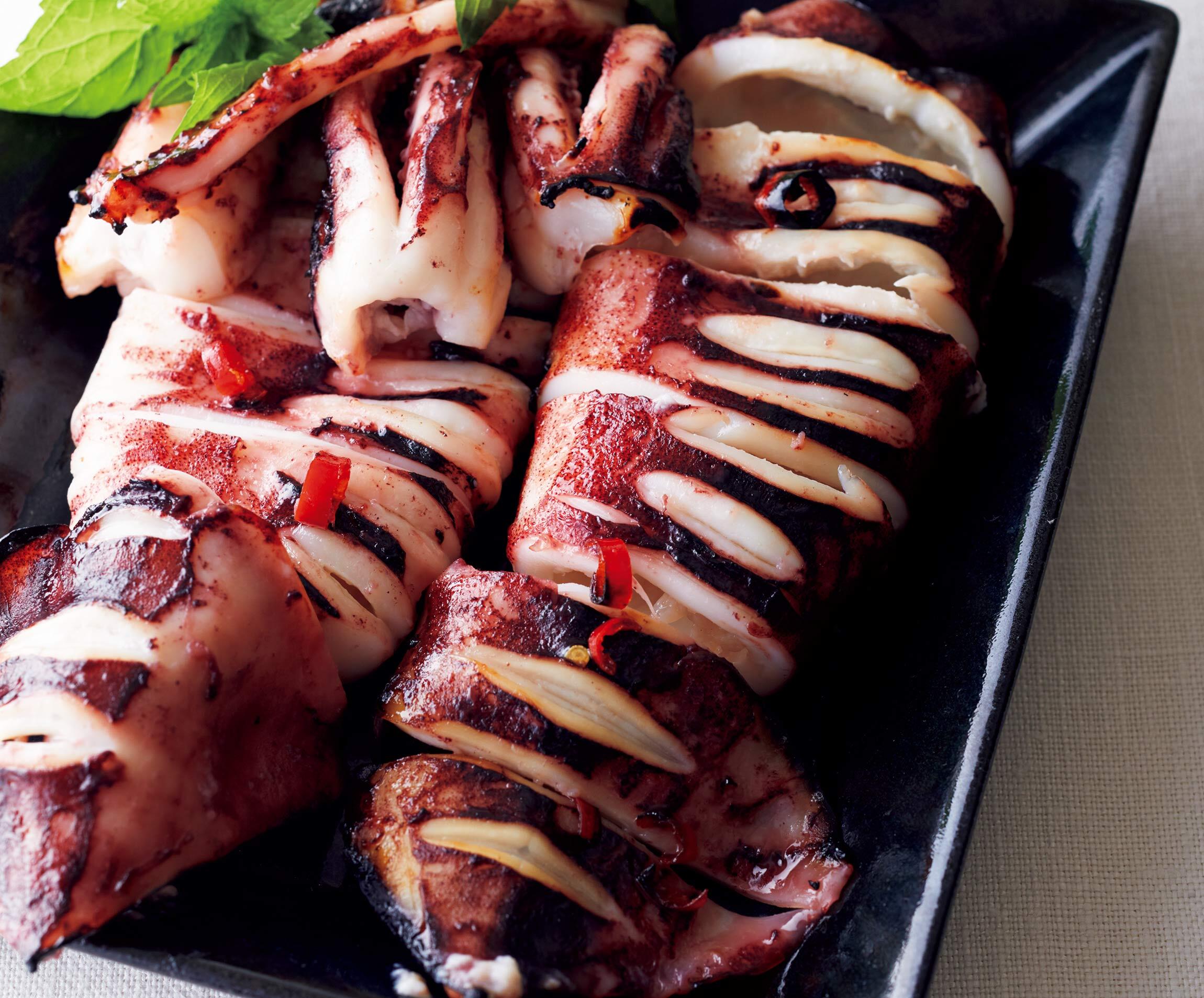 ただのイカ焼きではありません。はちみつとナムプラーでつくる甘じょっぱい味はまさにエスニック。レモンとミントの香りも忘れずに。いつもとは違う、イカのフュージョンメニューを堪能してください。
