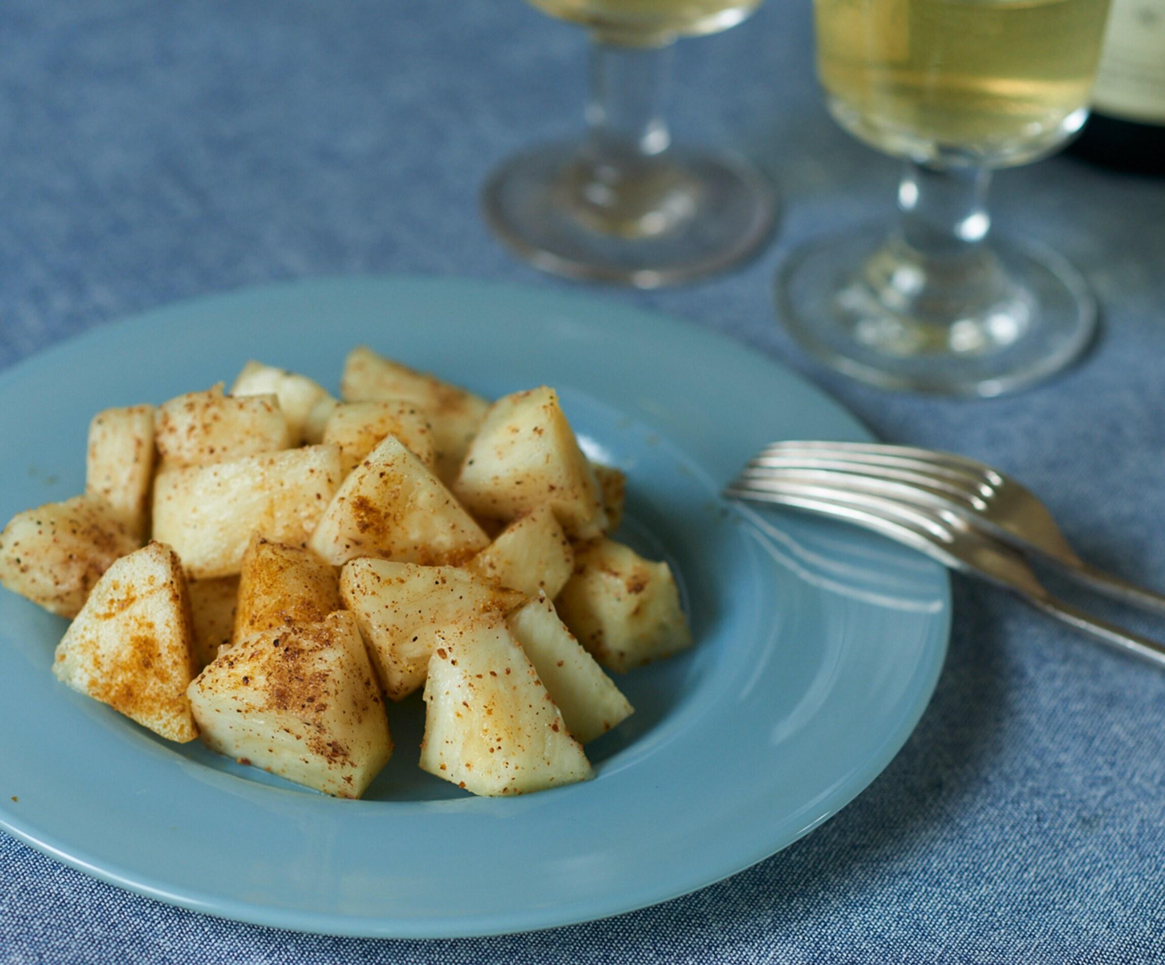 パイナップルの皮をむいて食べやすい大きさに切り、ガラムマサラをまぶす。