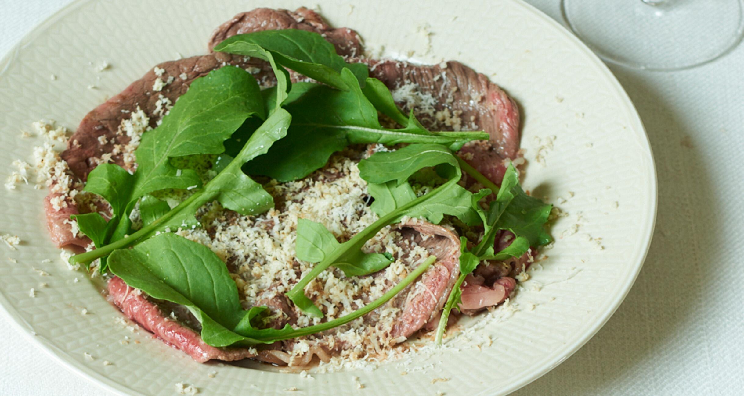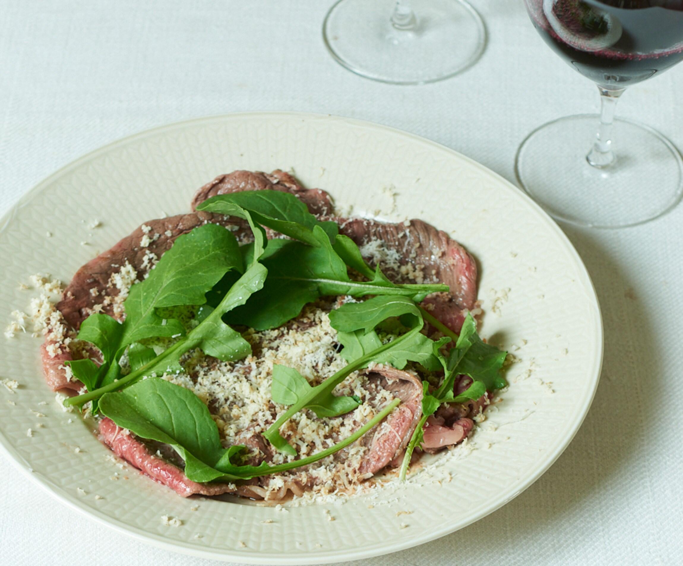 全体に塩をふり、胡椒を挽き、パルミジャーノ、山わさびをほぼ同量、たっぷりとふってルッコラを散らす。