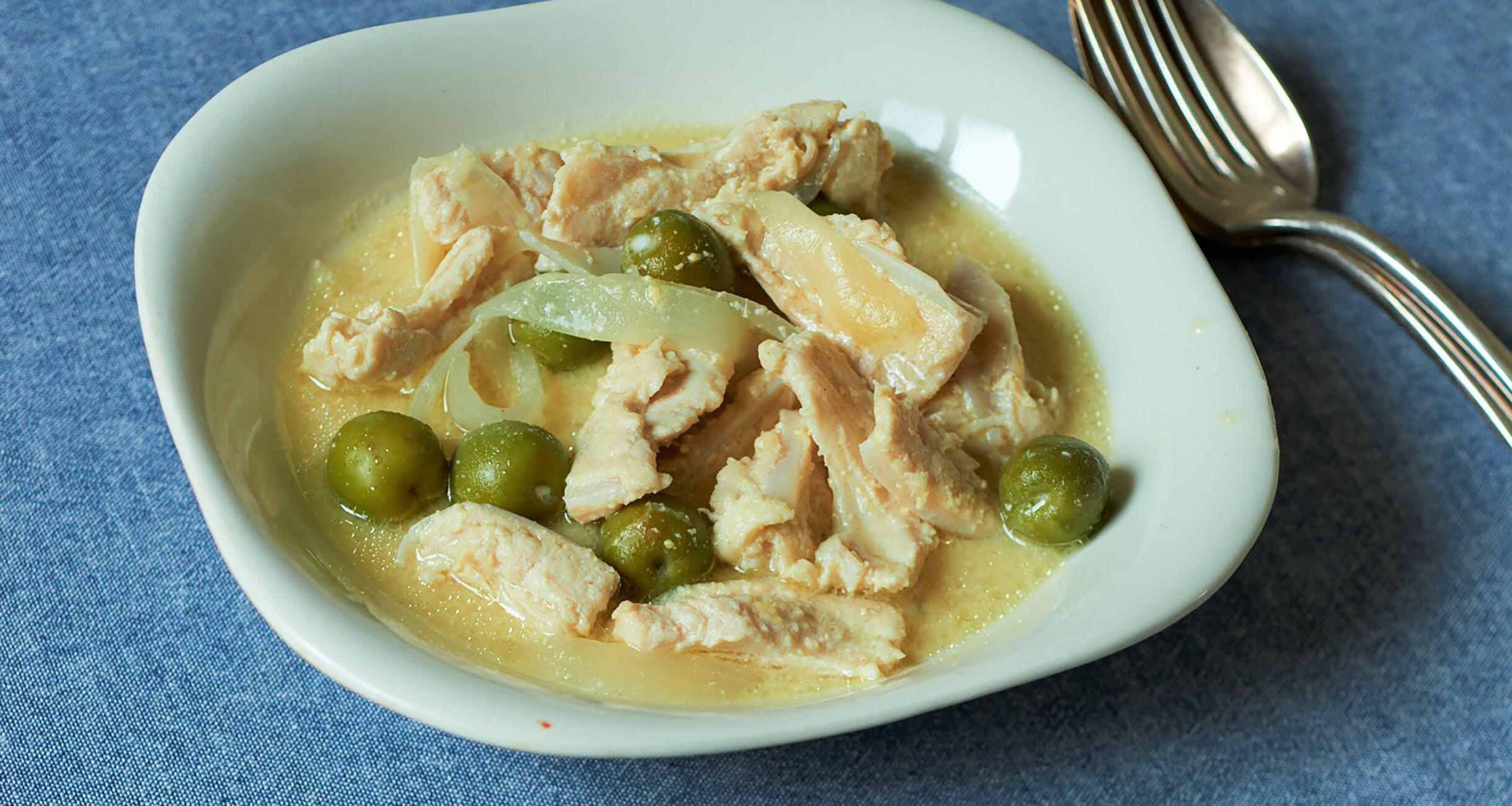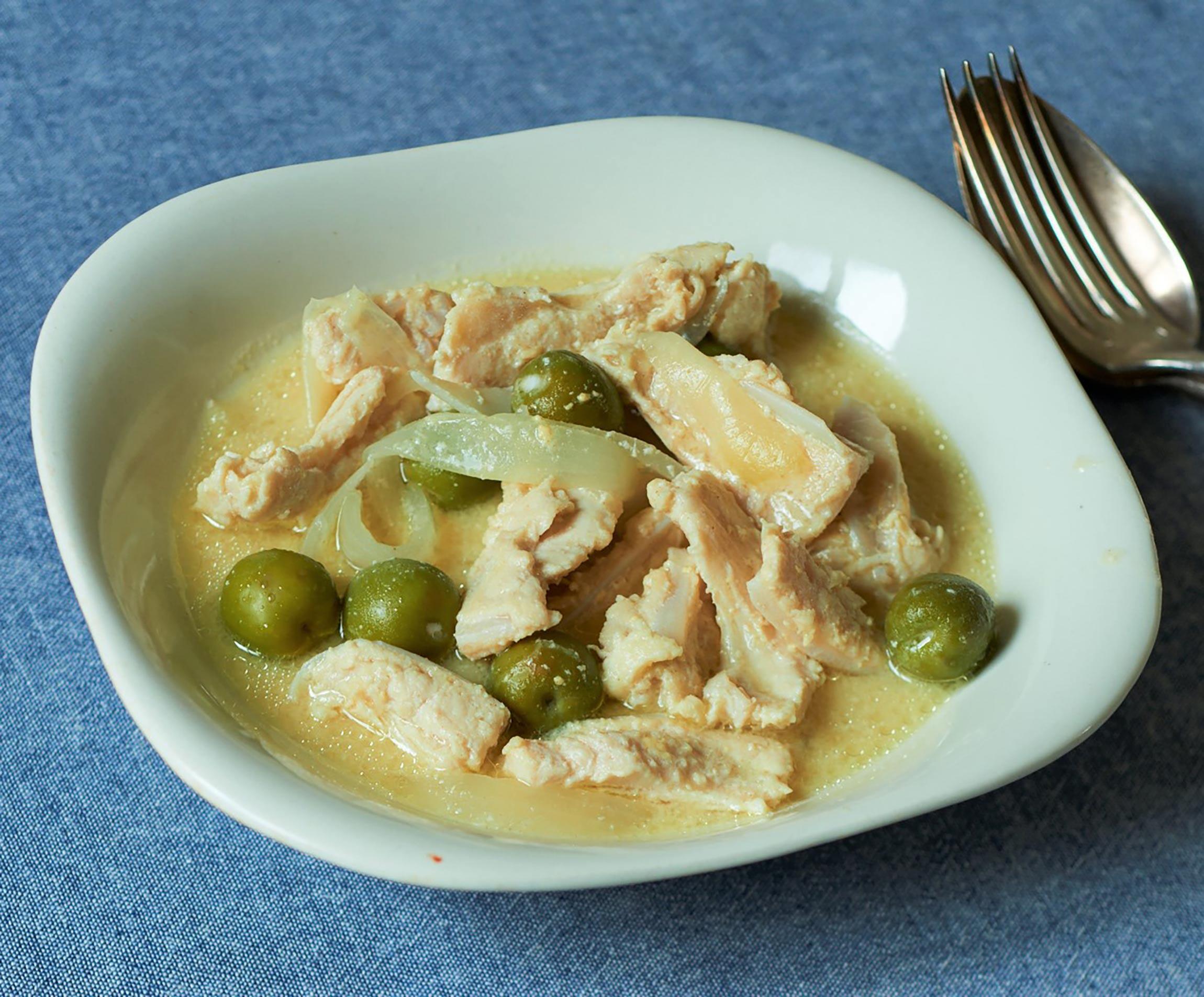 焼いたり揚げたりすることが多い鶏軟骨を「煮る」というアイデア料理。オリーブの実を加えると味わいも彩りも増し、一皿の中で味の変化が楽しめます。