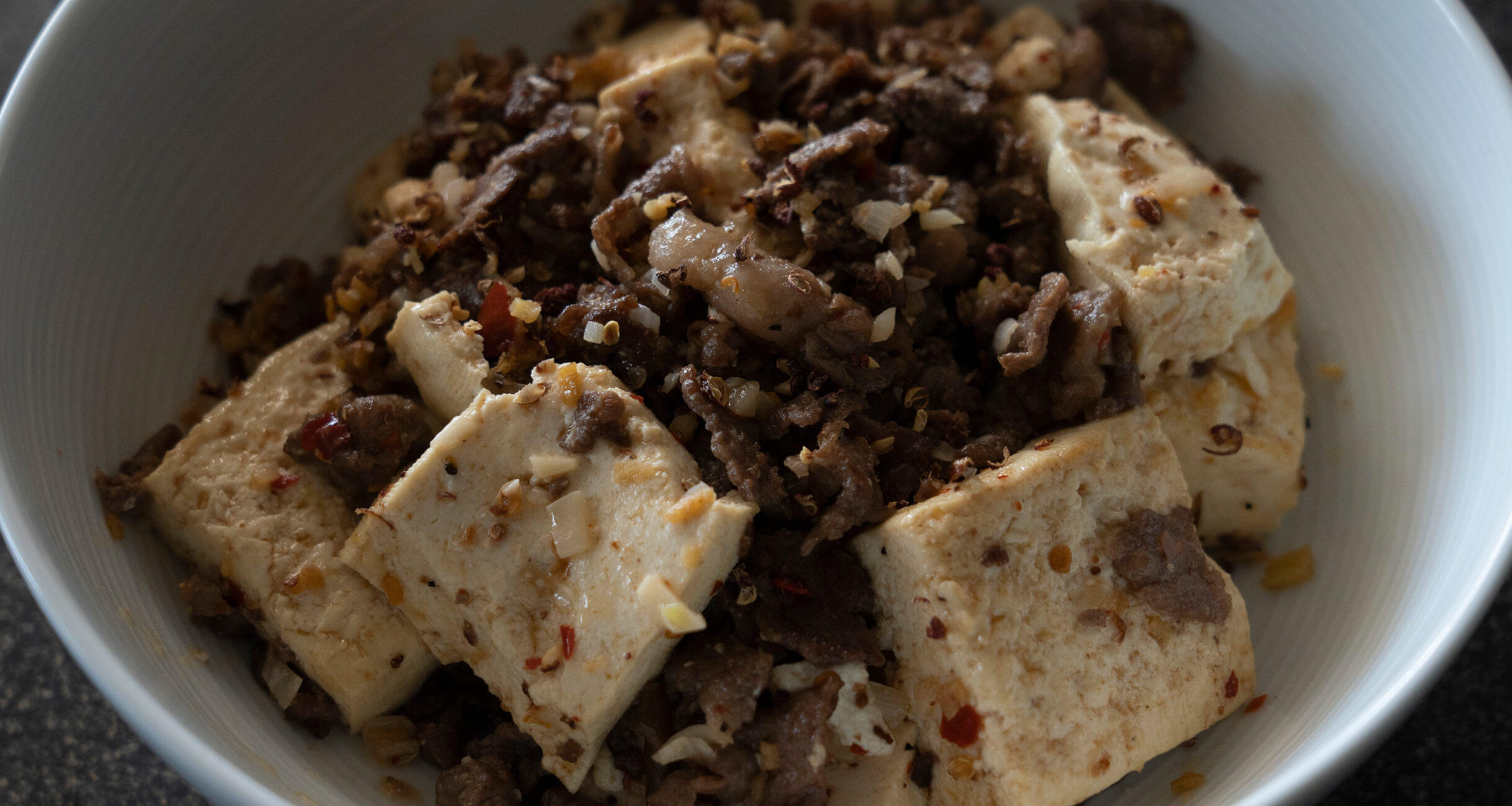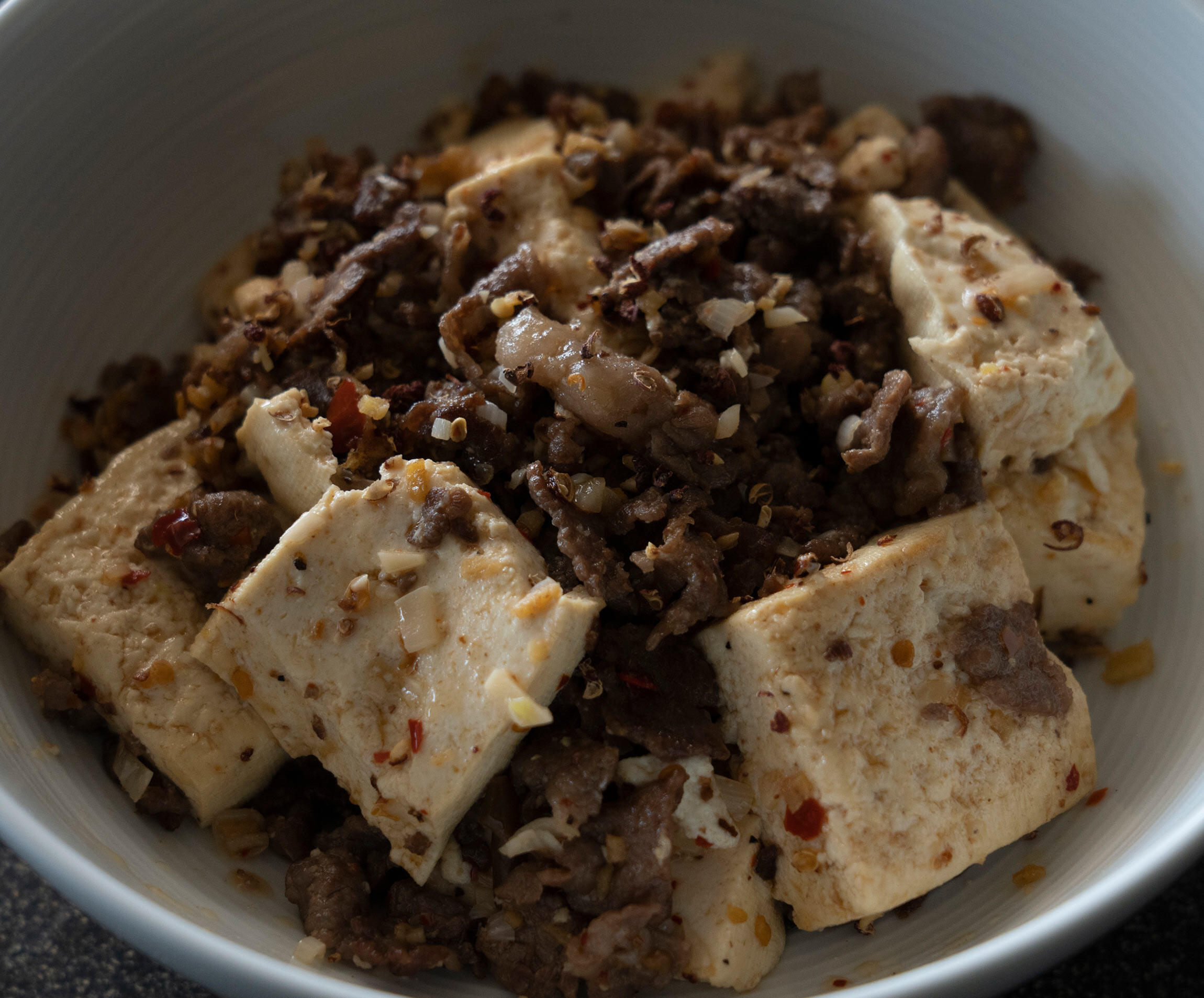 本場四川へ行けば、麻婆豆腐にもさまざまなスタイルが。甜麺醤の甘さを加えず豆板醤の旨味と辛味、花椒のしびれを受け止めた豆腐と牛肉は、すっきりとした味わい。現地の豆腐は固いので、沖縄の島豆腐などを使っても。